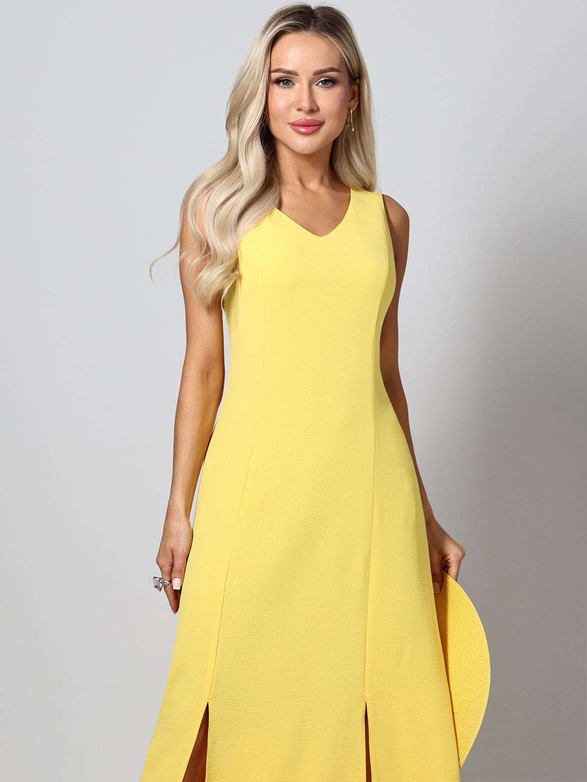 Платье выполнено из легкой плательной ткани, идеальной для жаркого сезона, обеспечивая комфорт и удобство в носке. Яркий цвет делает это платье привлекательным и стильным, подчеркивая индивидуальность и женственность его обладательницы. Молния сбоку и разрезы придают платью изысканный вид и обеспечивают легкость при надевании и снятии, а также свободу движений. V-образный вырез горловины придает образу изысканность и женственность, добавляя элегантности и привлекательности. Отсутствие рукавов делает это платье идеальным для жарких дней, обеспечивая ощущение свежести и легкости. Модель платья - полуприлегающий силуэт, который выгодно подчеркивает фигуру, придавая ей женственные очертания. Уход за этим платьем прост: достаточно провести бережную стирку при 30 градусах, чтобы оно сохраняло свой первоначальный вид и качество на долгое время.