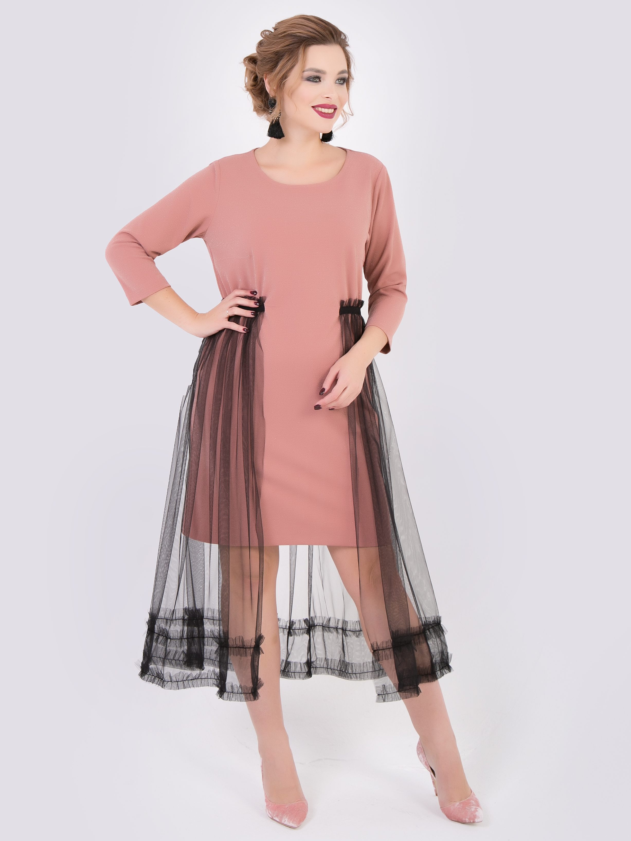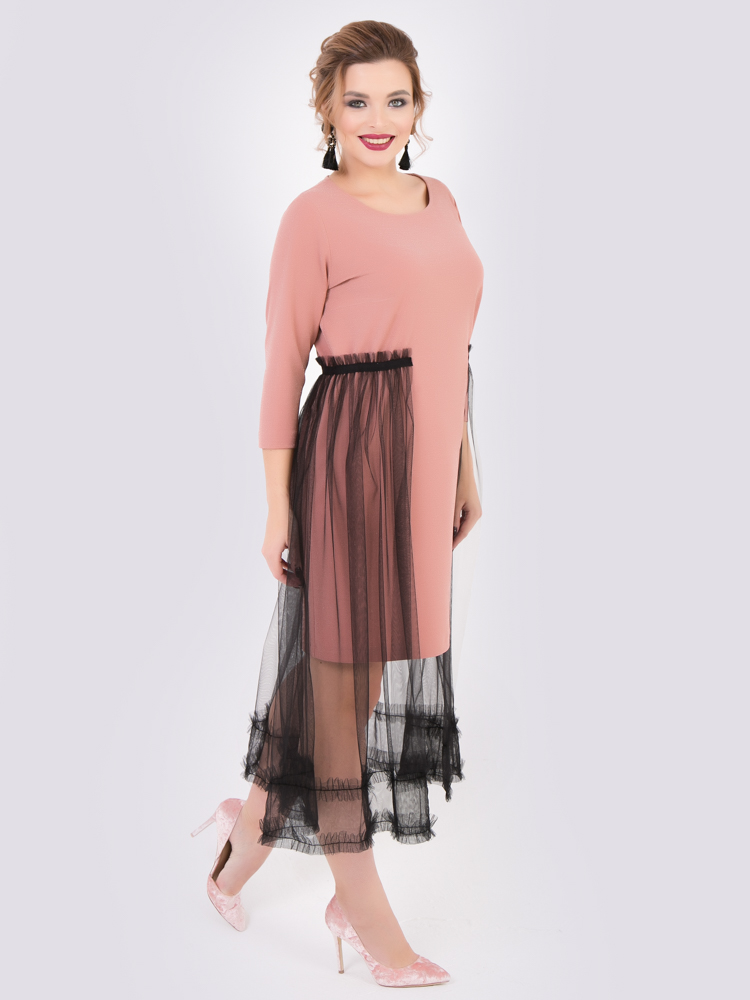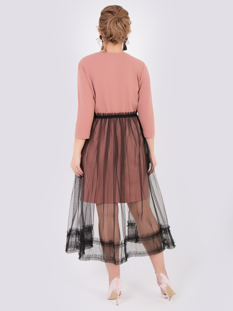 пудровый Оригинальное платье из мерцающего трикотажа  и сетки.