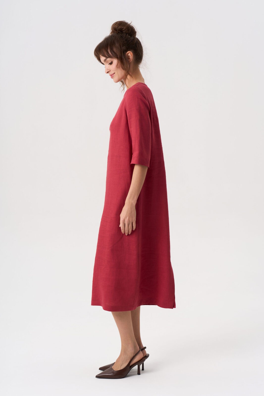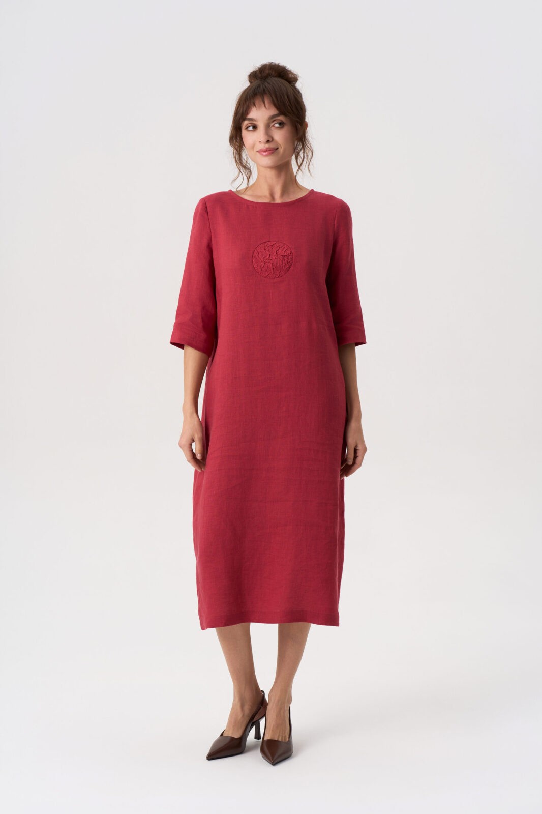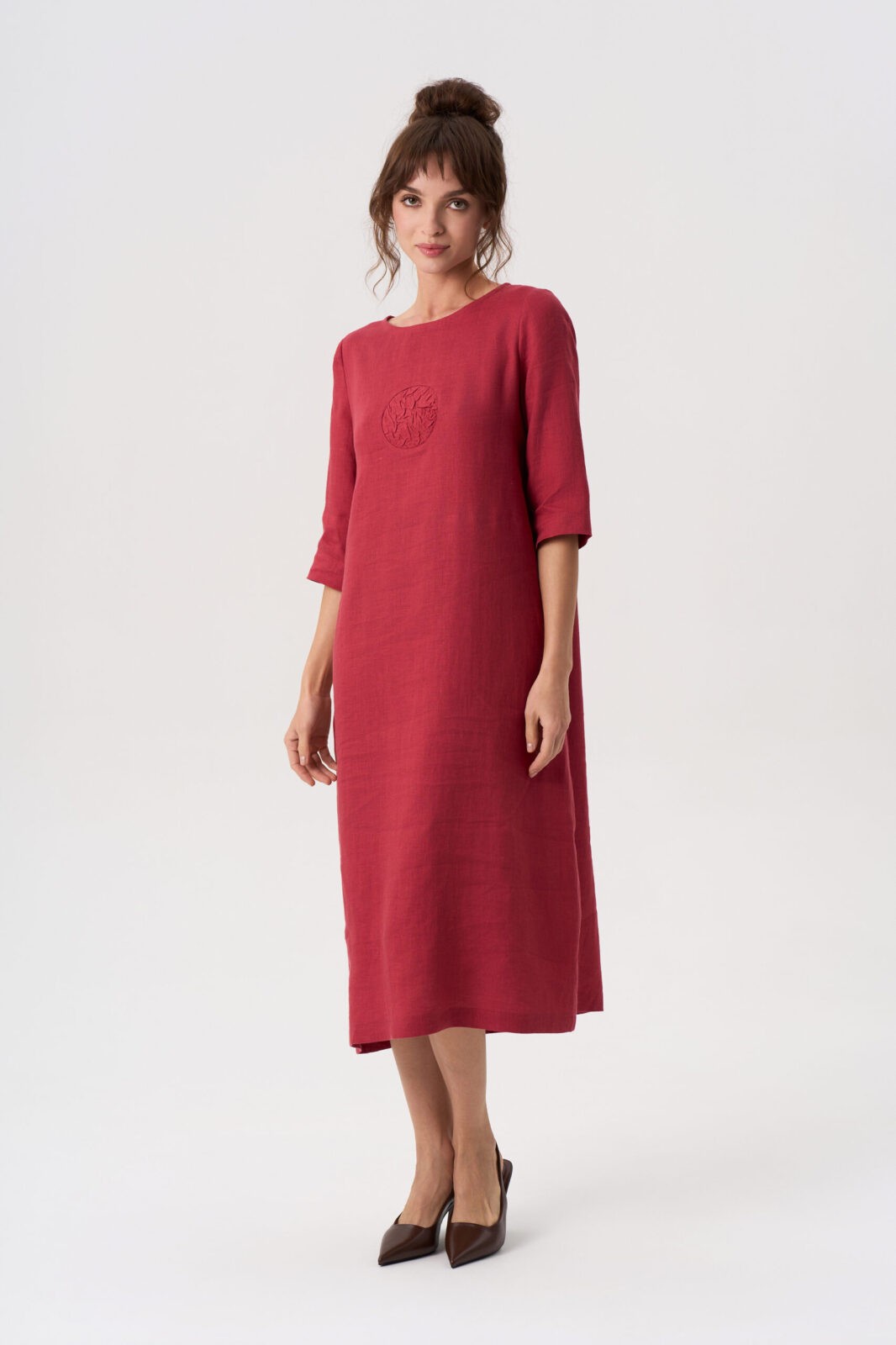 Платье миди прямого силуэта с декоративной вставкой на груди. Сзади шлица. Рукав втачной до локтя. Вырез горловины округлой формы. В боковых швах карманы.