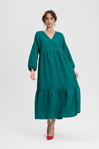 Платье длинное отрезное по завышенной линии талии с прямой юбкой на сборке. Лиф без плечевых швов с цельнокроеным рукавом до локтя. Горловина V-образной формы с функционально-декоративными завязками. В боковых швах карманы и разрезы.