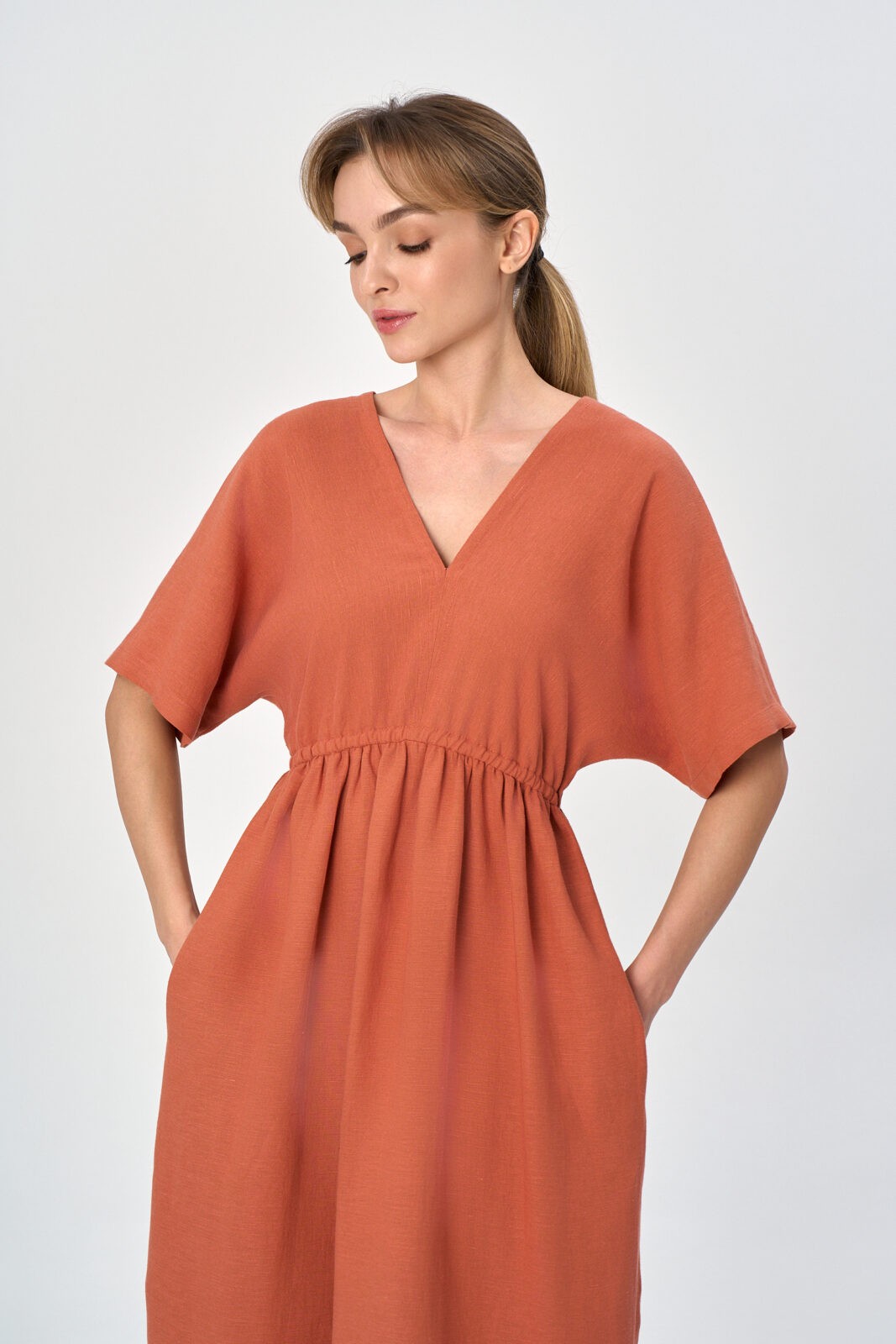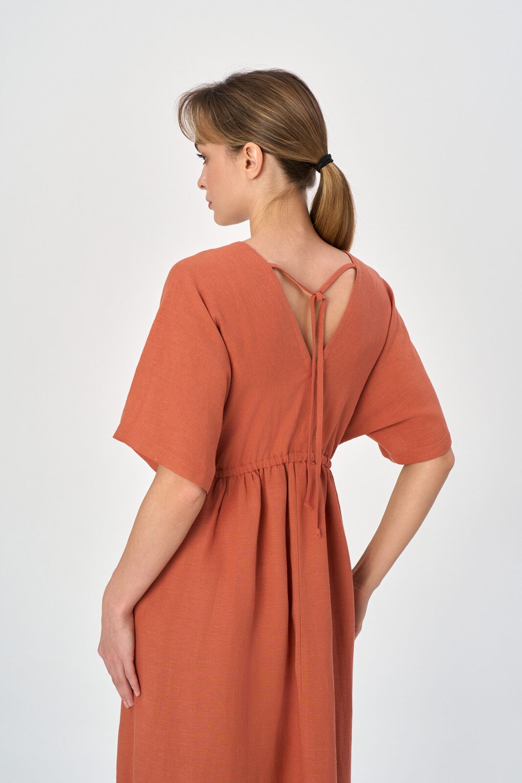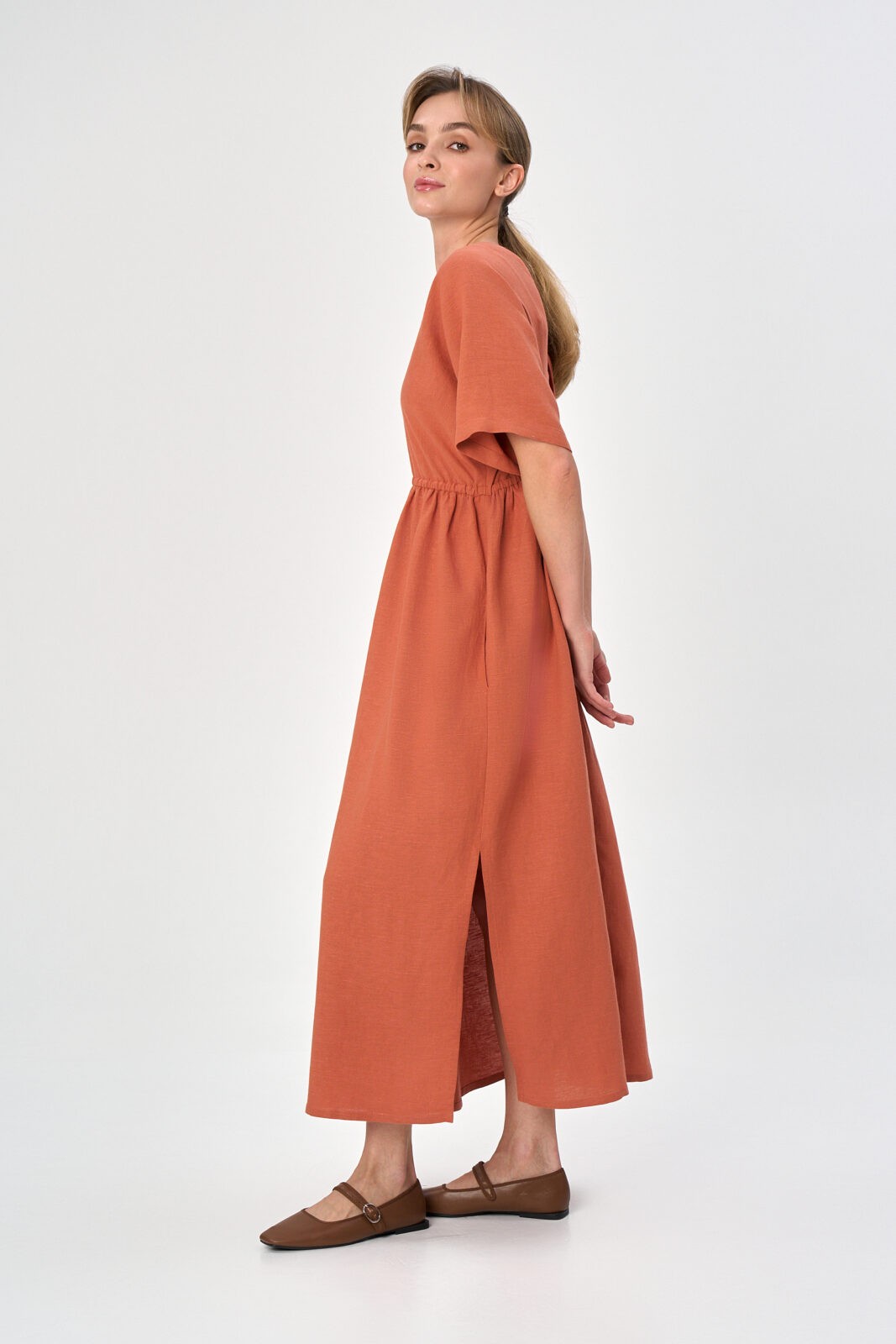 Платье длинное отрезное по завышенной линии талии с прямой юбкой на сборке. Лиф без плечевых швов с цельнокроеным рукавом до локтя. Горловина V-образной формы с функционально-декоративными завязками. В боковых швах карманы и разрезы.