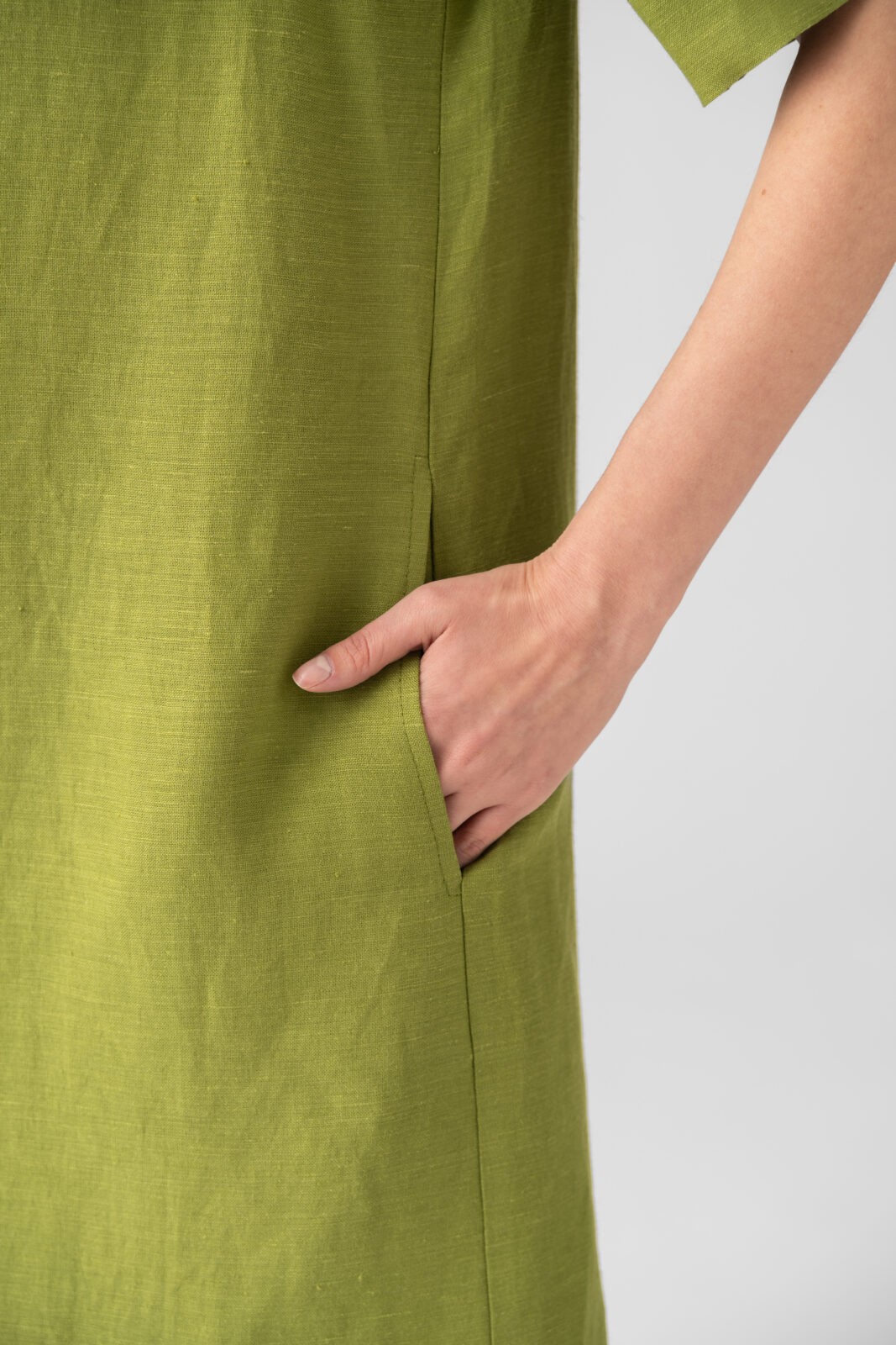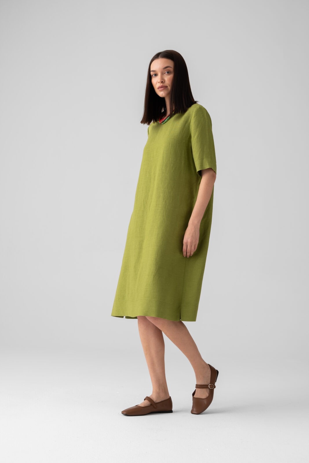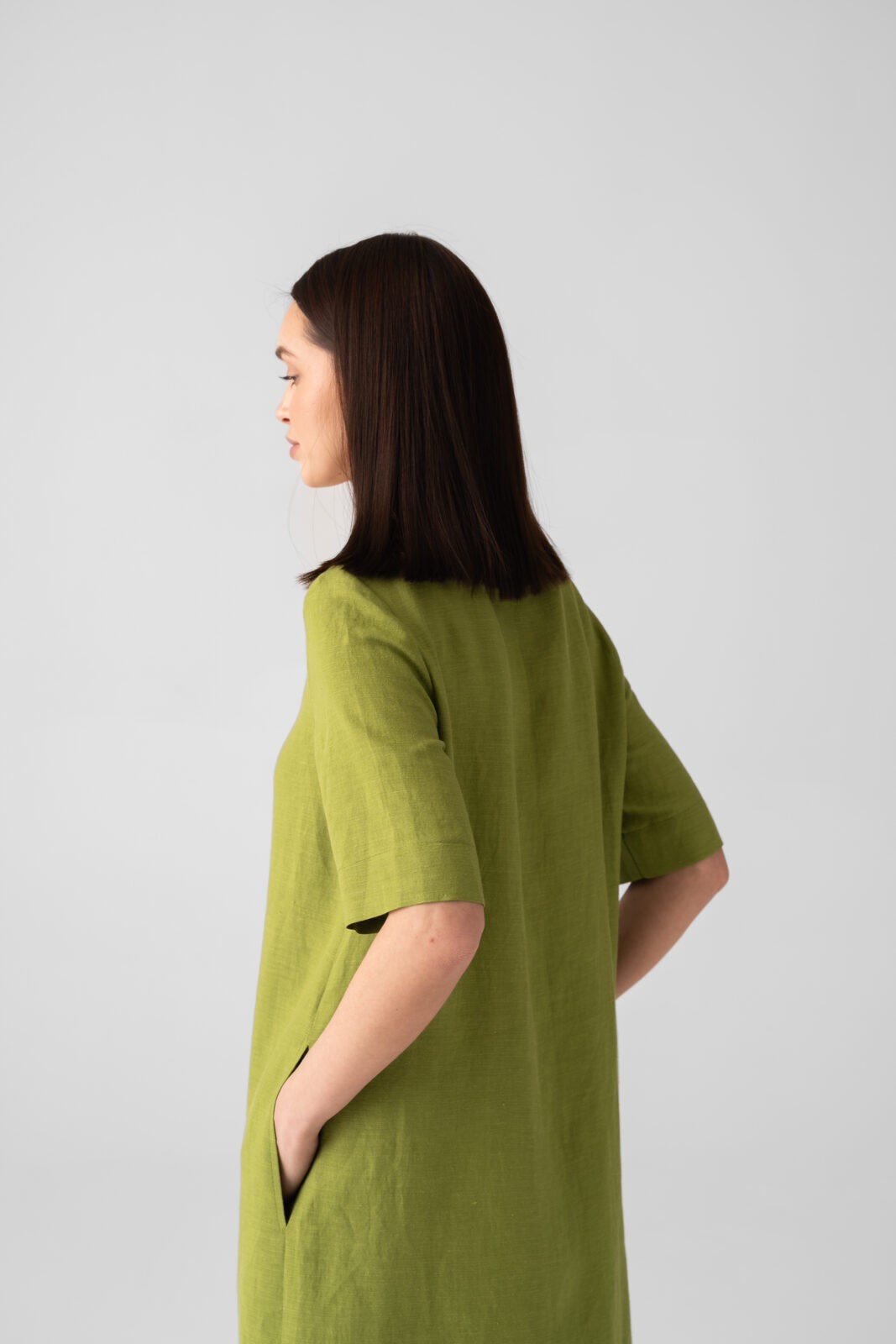 Платье прямое длиной по линии колена. Рукав втачной до локтя. Вырез горловины округлой формы. В боках карманы и небольшие разрезы.