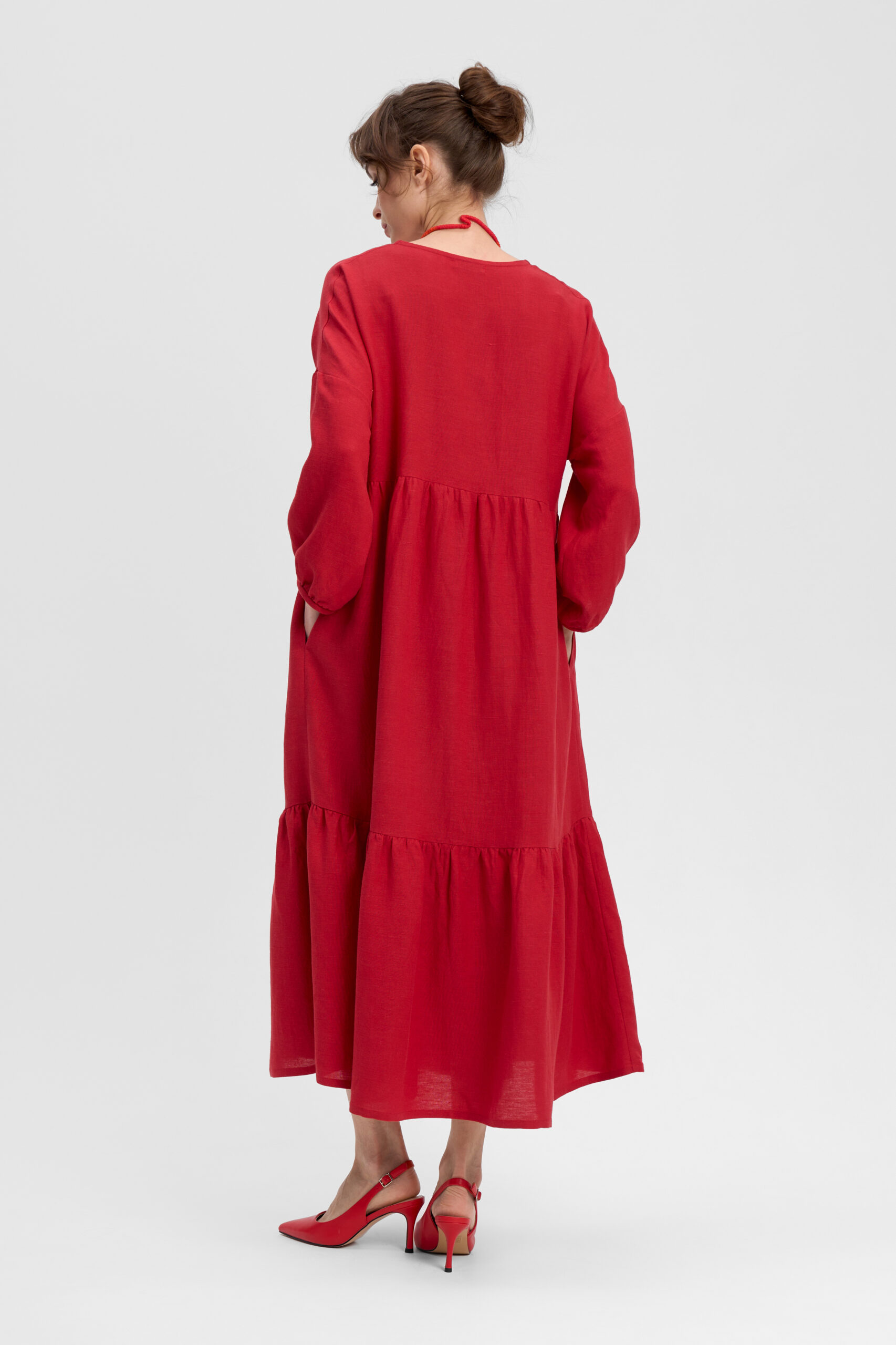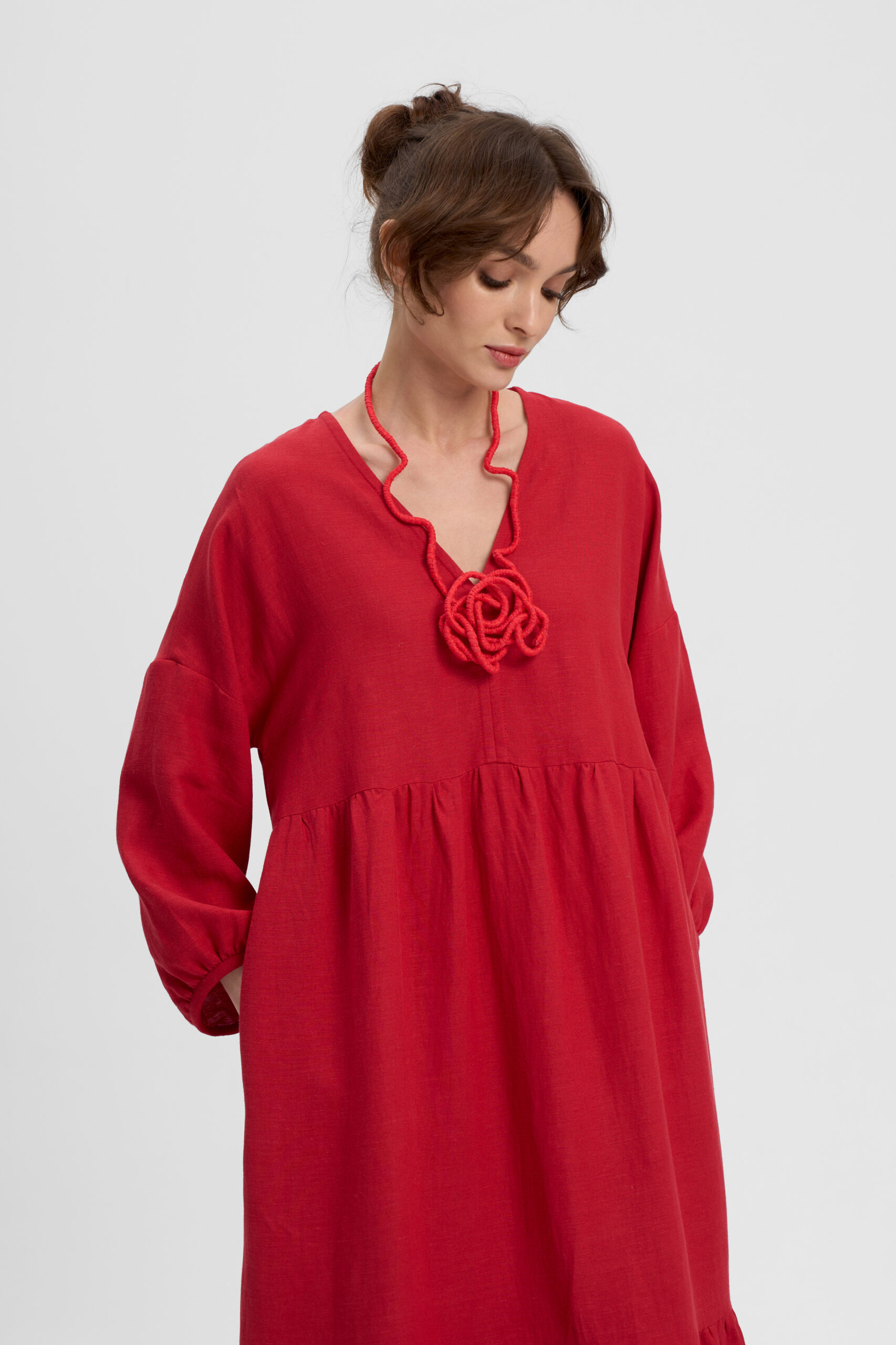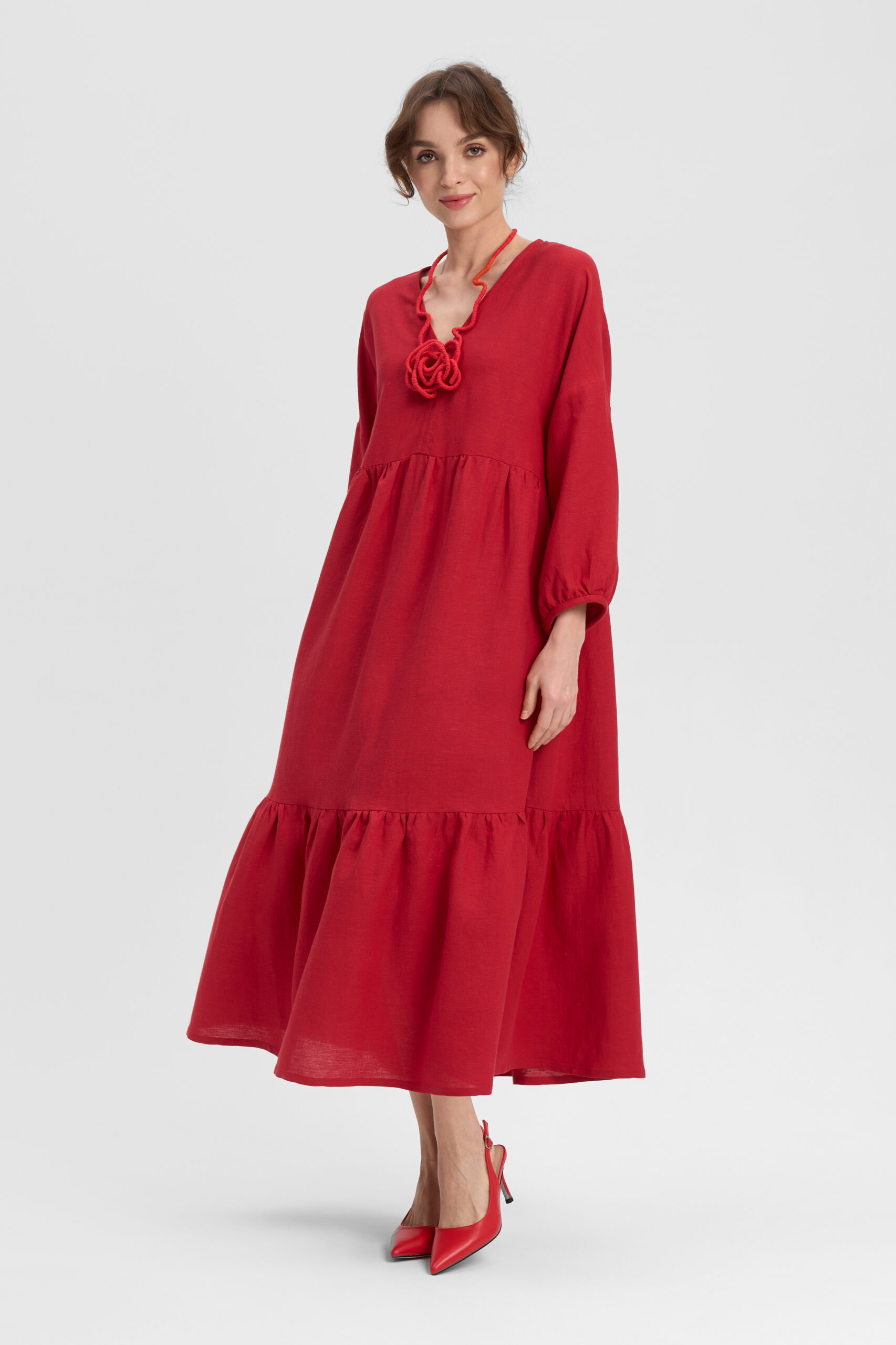 Платье ярусное свободное отрезное под грудью. Рукав цельнокроеный с отрезной частью на сборке. Горловина V-образной формы. Карманы в боковых швах.