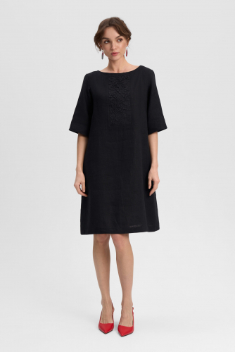 Платье коктейльное с декоративной вставкой на груди. Рукав до локтя. Вырез горловины округлой формы. Карманы в боковых швах.