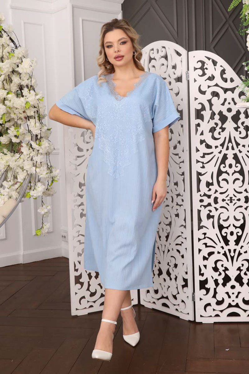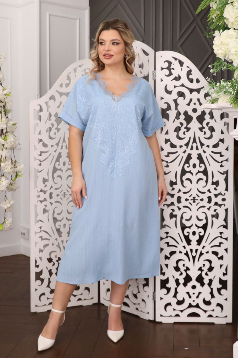 Стильное платье полуприлегающего силуэта из текстильной ткани голубого цвета. V-образный вырез эффектно подчеркнут кружевом. Платье с цельнокроеными рукавами. Перед изделия дополнен кружевом. Длина изделия по спинке от плечевого шва до низа изделия — 119 см.