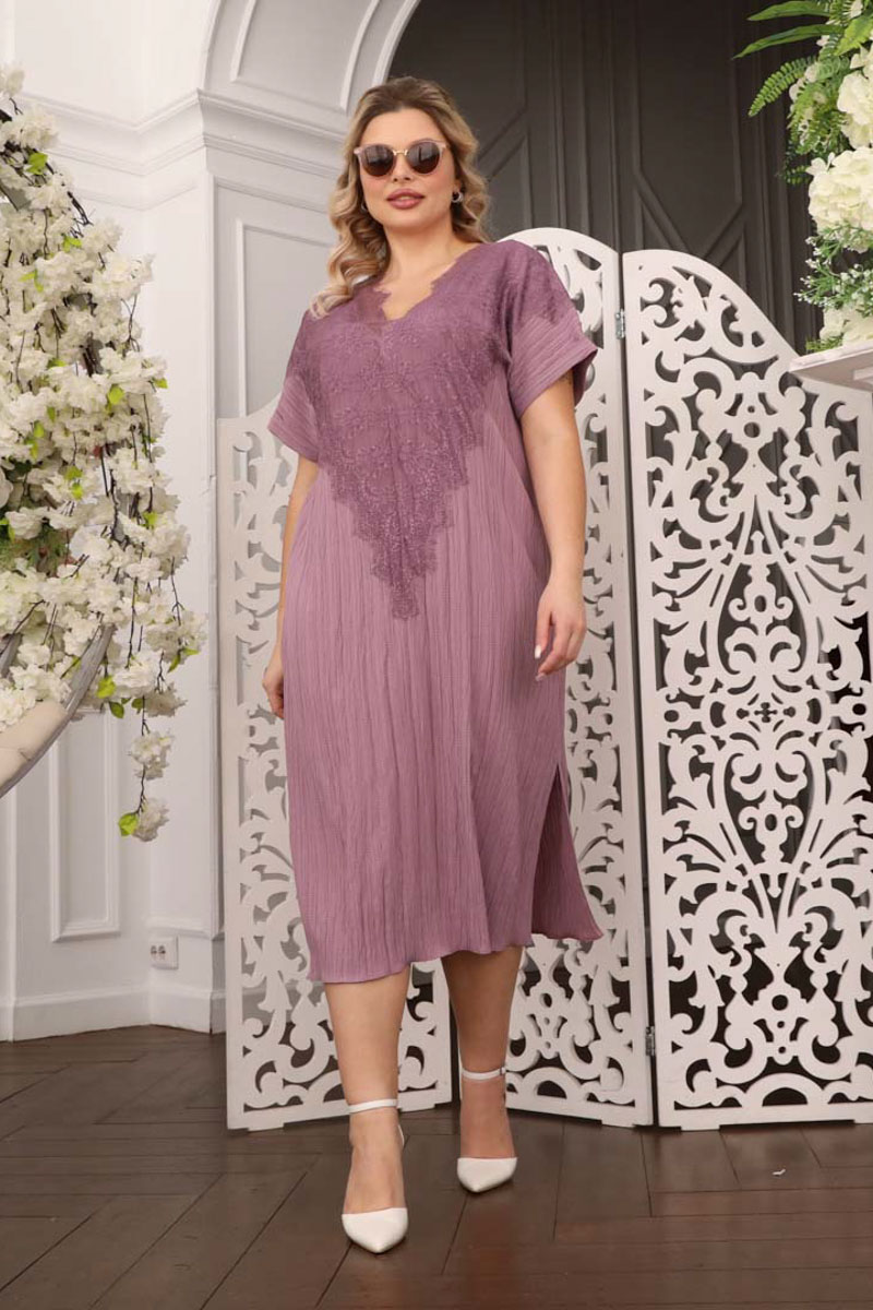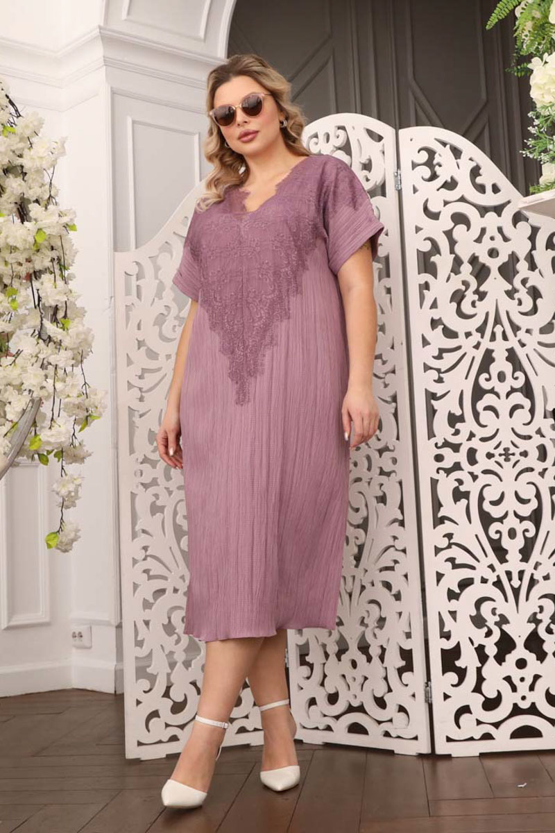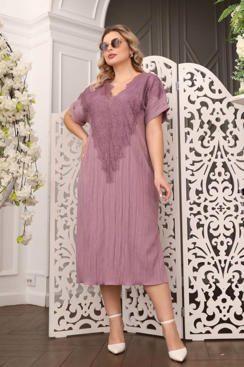 Стильное платье полуприлегающего силуэта из текстильной ткани сиреневого цвета. V-образный вырез эффектно подчеркнут кружевом. Платье с цельнокроеными рукавами. Перед изделия дополнен кружевом. Длина изделия по спинке от плечевого шва до низа изделия — 119 см.