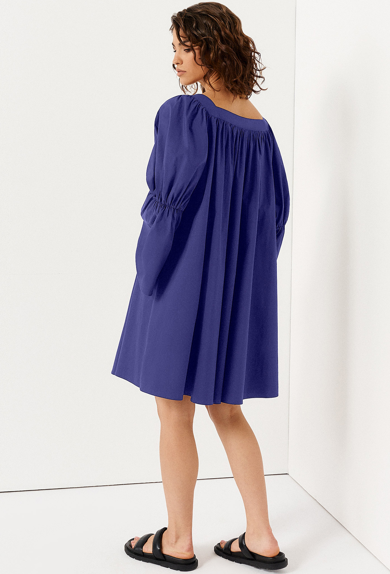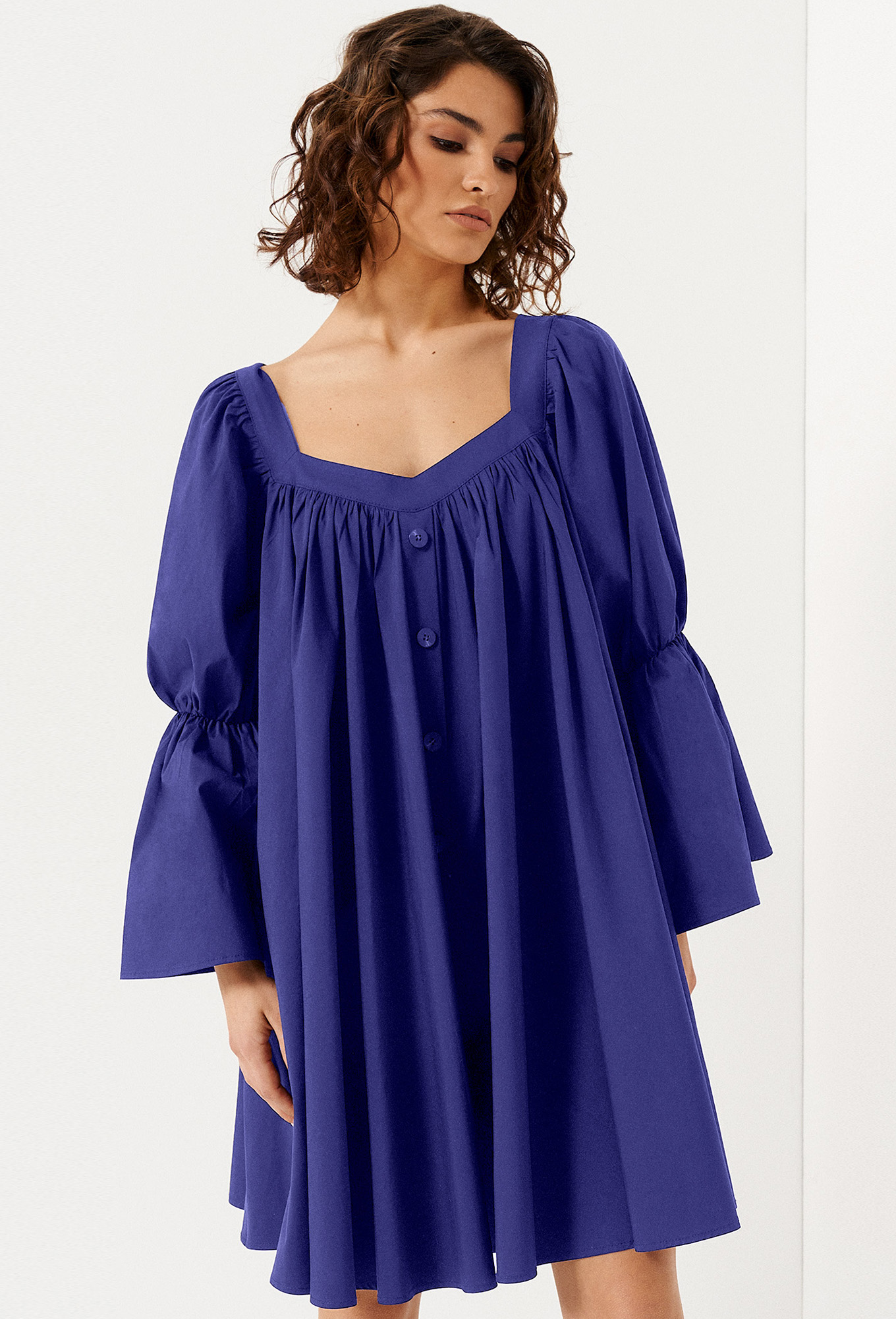Модель: Панда 132280 ярко-синий Р..показатьост: 164 см (девушка на фото ростом 170 см) Сезон: Весна-Лето Тип ткани: Хлопок 76%, полиэстер 22%, эластан 2%.Короткое пышное платье – отличный выбор для стильного вечернего образа. Женское хлопковое платье длиной выше колена скроено в свободном фасоне, полностью скрывает фигуру. Пятиугольный глубокий вырез горловины с акцентом на декольте. От него вниз спускается планка с пуговицами. Оригинальный вид имеет длинный широкий рукав, перехваченный резинкой на локте. Защипы в верхней части лифа создают плавные складки.