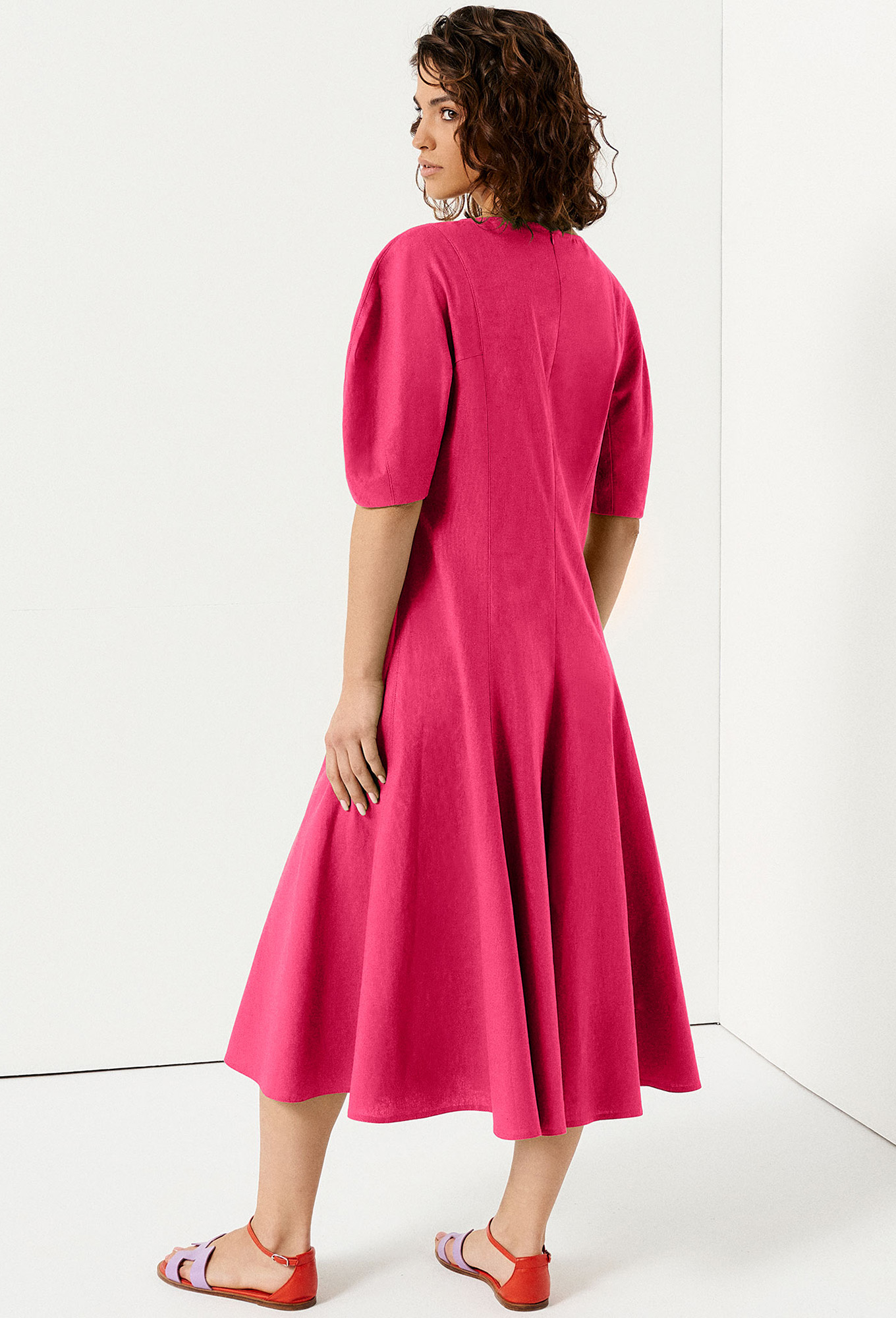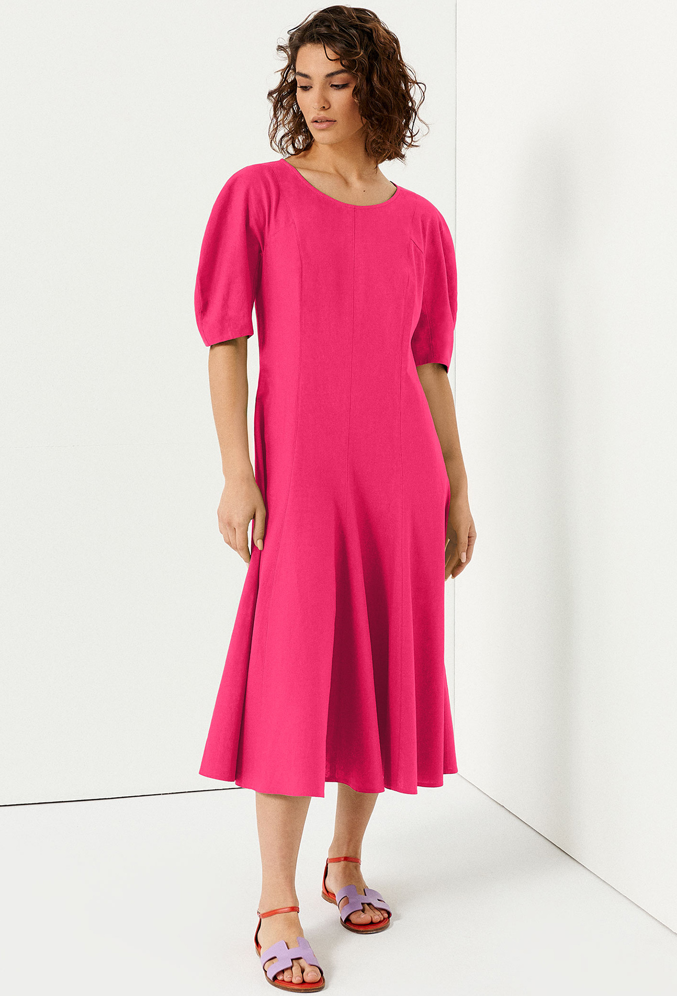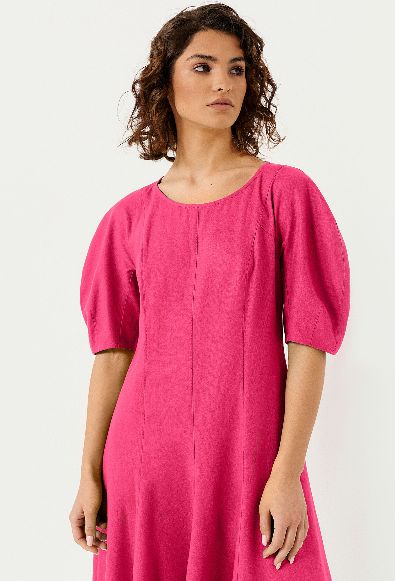 Модель: Панда 140080 фуксия Рост:..показать 164 см (девушка на фото ростом 170 см) Сезон: Весна-Лето Тип ткани: Лён 79%, вискоза 21%Платье миди с коротким рукавом.
