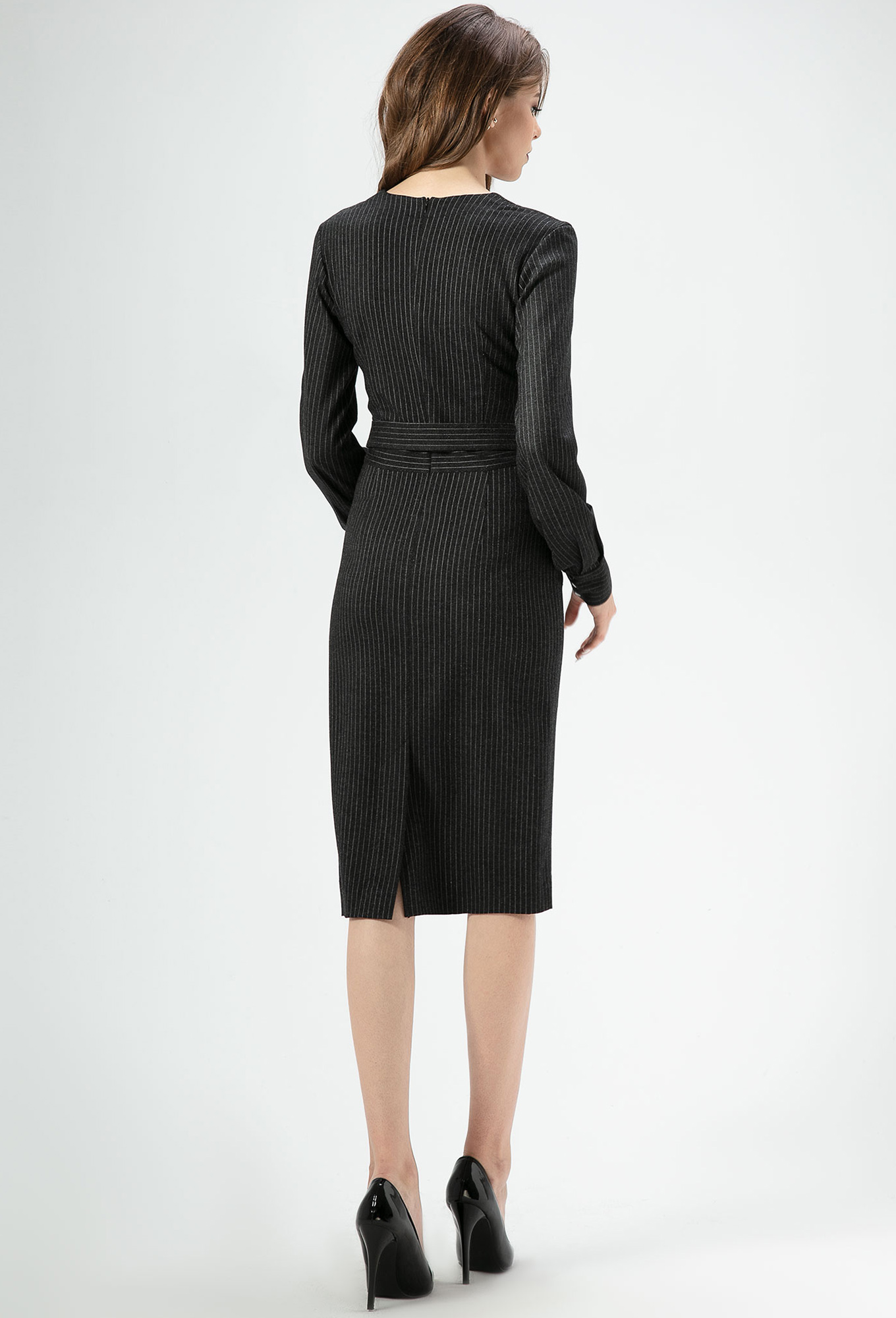 Модель: Панда 456180 серый Рост: ..показать164 см (девушка на фото ростом 170 см) Сезон: Круглогодичный Тип ткани: Полиэстер 55%, акрил 23%, нейлон 17%, шерсть 5%Изящное платья для офиса с красивым декольте и разрезом по переду. Платье из вискозной ткани с рисунком в полоску. Платье облегающего силуэта, отрезное по талии с декоративным съёмным поясом из основной ткани. Рукава длинные на широкой притачной манжете. На манжете имеются декоративные металлические кнопки. Вырез платья V-образной формы. По переду и по спинки имеются вытачки, которые обеспечивают посадку изделия по фигуре. Застежка на потайную молнию по спинки. Средний шов спинки заканчивается шлицей. По переду имитация запаха, разрез на левой детали переда. Отличный вариант изящного платья для офиса.