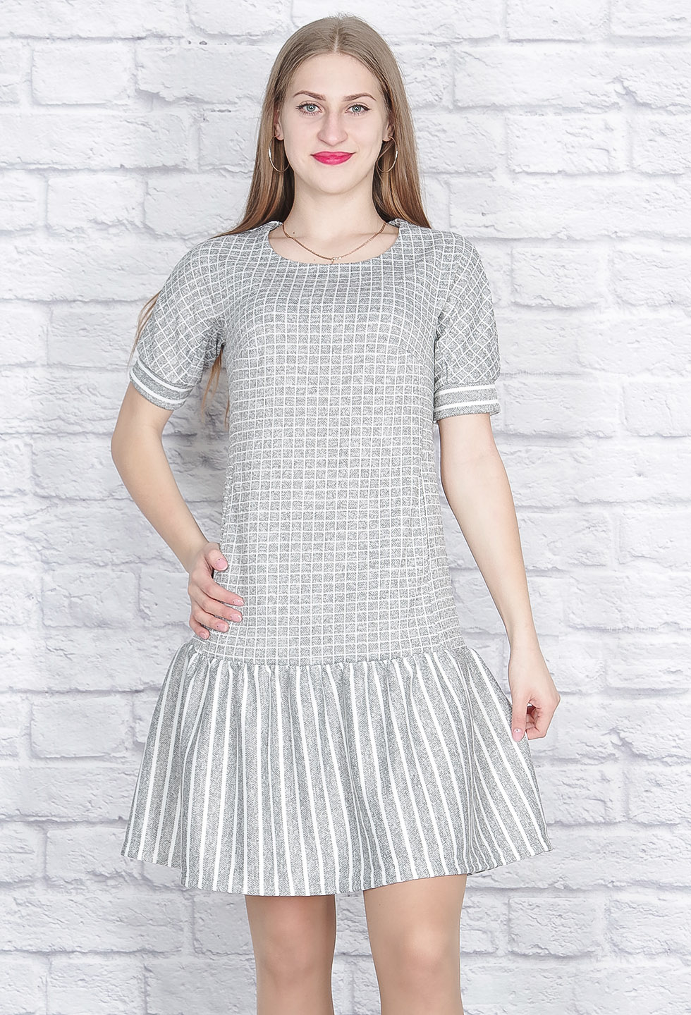 Очень красивое платье прямого кроя с широкой оборкой - воланом. Короткий рукав на манжете, в боковых швах кармашки.