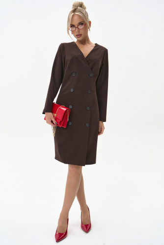 Стильное платье-пиджак прямого силуэта с акцентом на талию. Двубортная застёжка и строгий крой создают элегантный образ для офиса и деловых встреч. Модель выполнена из плотной костюмной ткани, хорошо держит форму и подчёркивает фигуру.