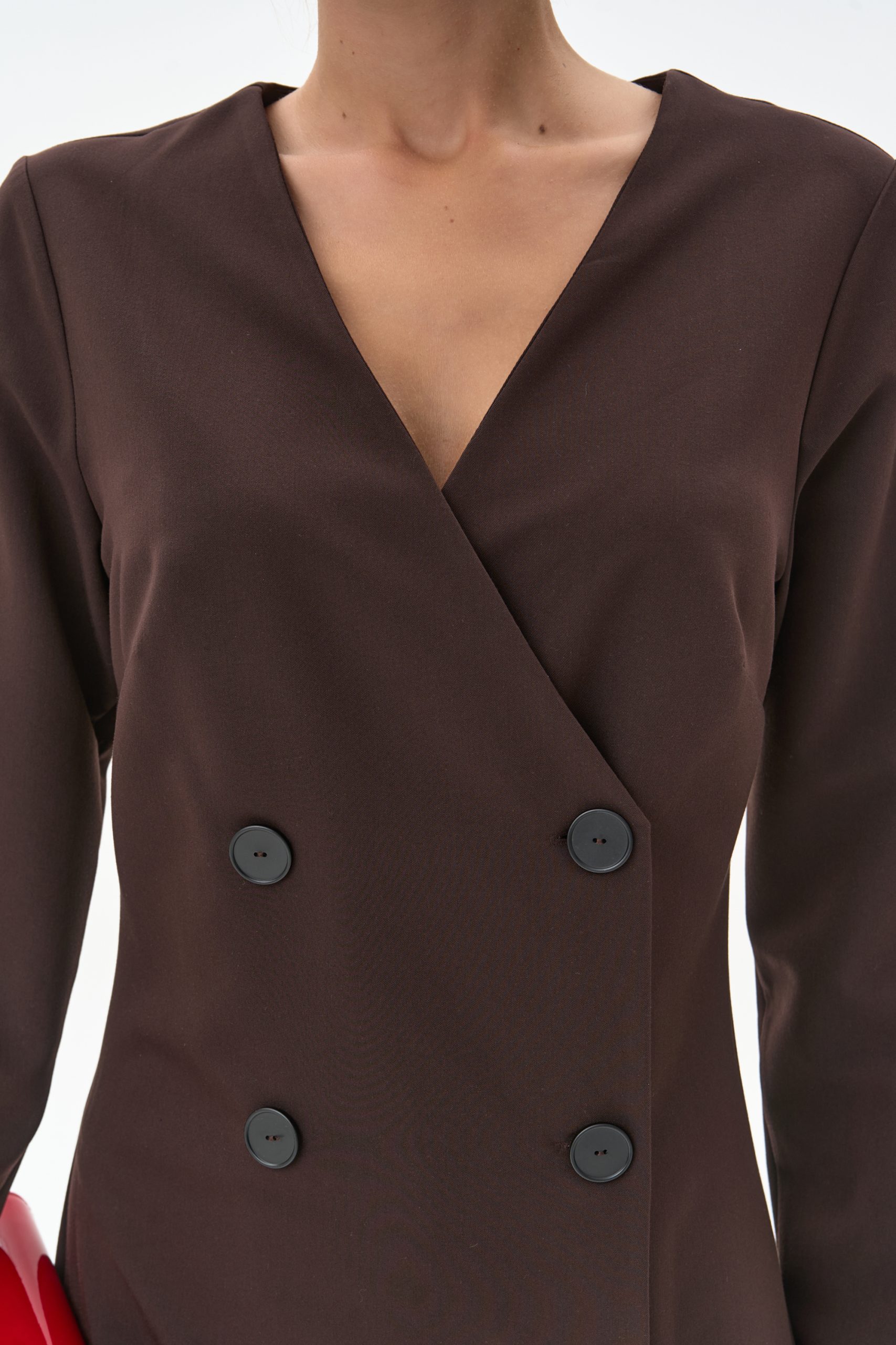 Стильное платье-пиджак прямого силуэта с акцентом на талию. Двубортная застёжка и строгий крой создают элегантный образ для офиса и деловых встреч. Модель выполнена из плотной костюмной ткани, хорошо держит форму и подчёркивает фигуру.