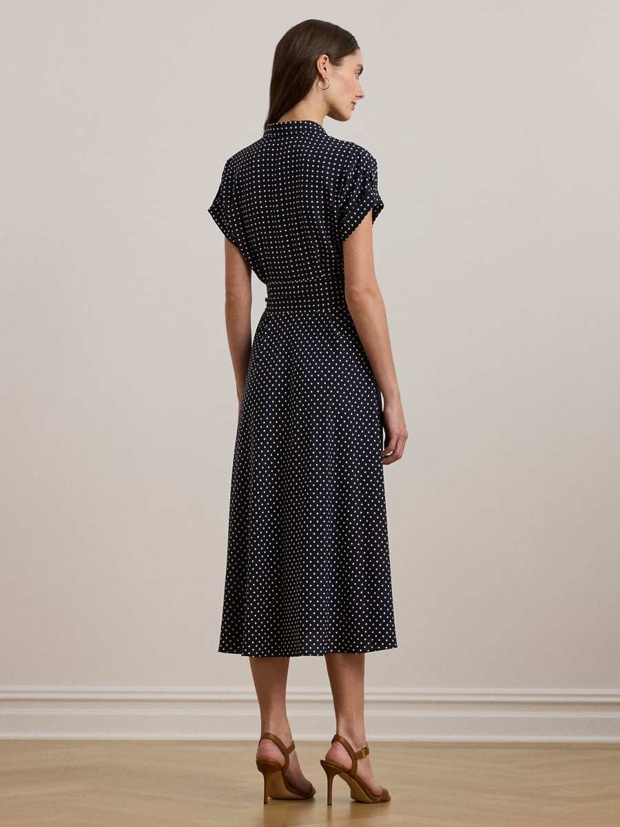 Отложной воротник. Вырез горловины с застежкой на крючок и глазки по центру переда. Потайная молния в левом боковом шве.