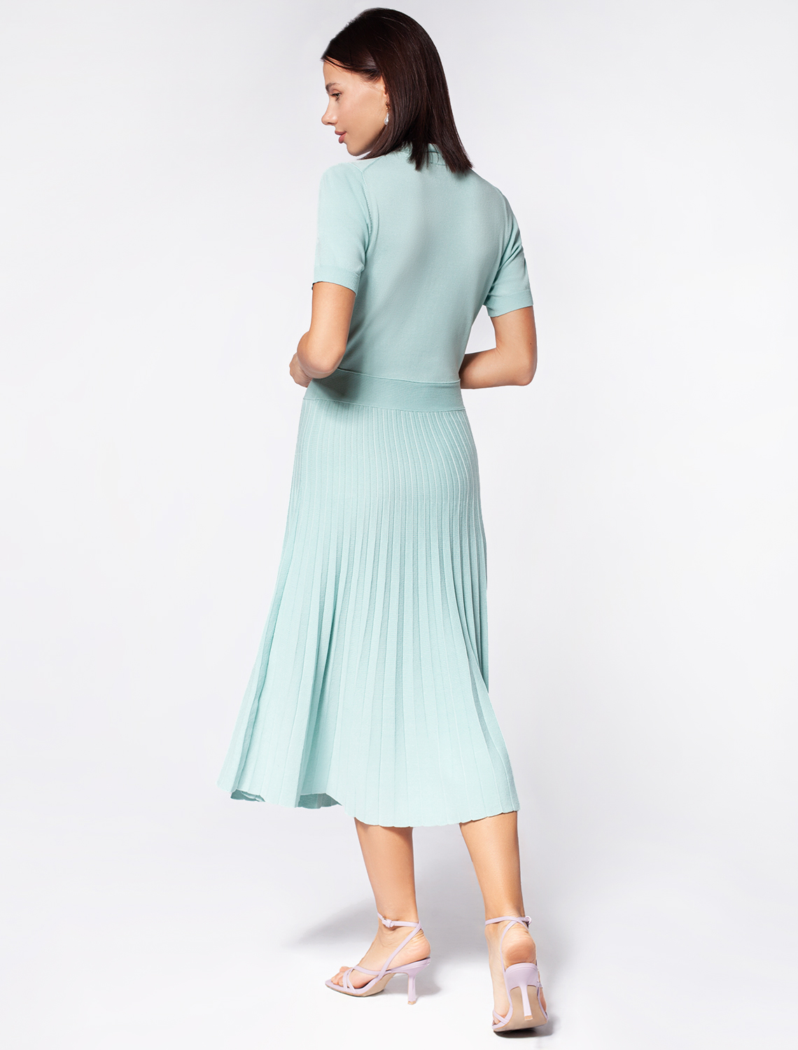 Платье-поло тонкой вязки из вискозы. Идеально подчеркивает силуэт. Поперечная резинка на талии визуально делает талию уже, создавая эффект песочных часов. Юбка со складками в стиле "гофре" струится по бедрам. Золотистые пуговицы добавляют роскоши. Мягкая пряжа очень приятная к телу идеально подходит в теплое время года.