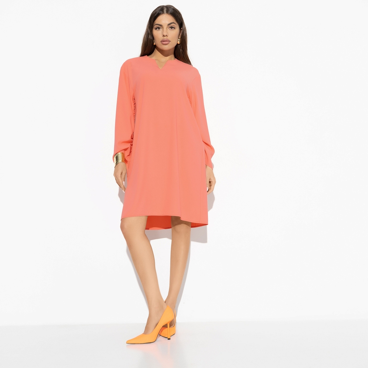 Персиковый цвет сообщает о тепле, даже если за коном другая погода. Главное – праздник в душе. А к нему и наряд соответсвующий – платье CHARUTTI со сборками на рукавах, расслабленный крой и элегантная длина.