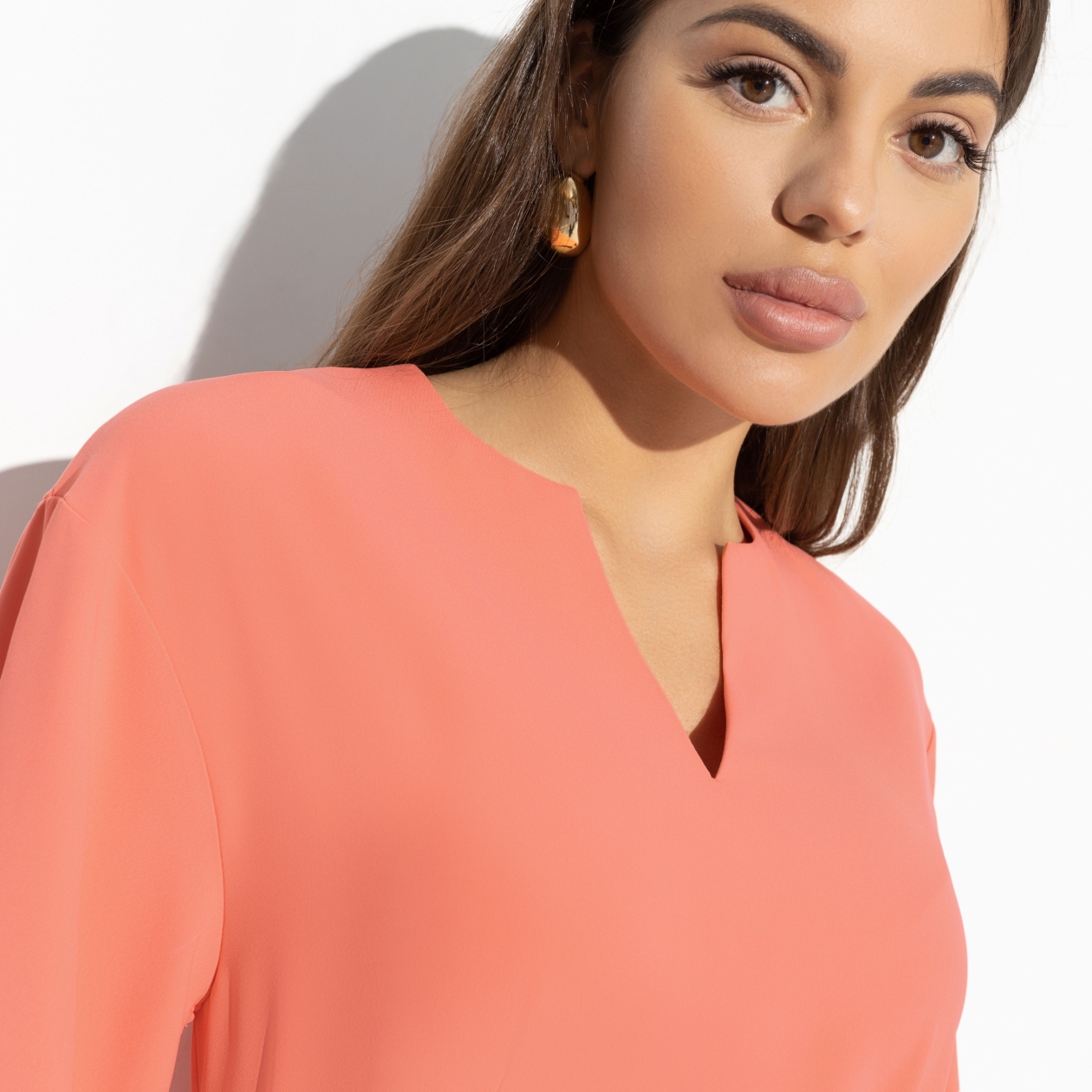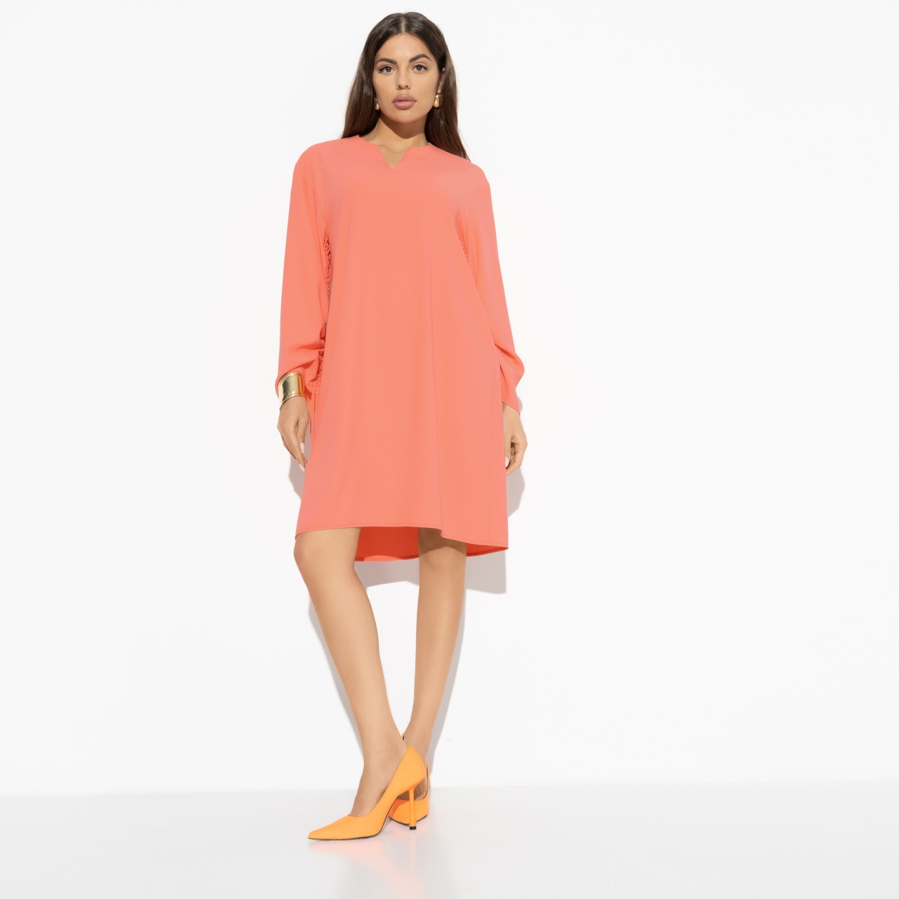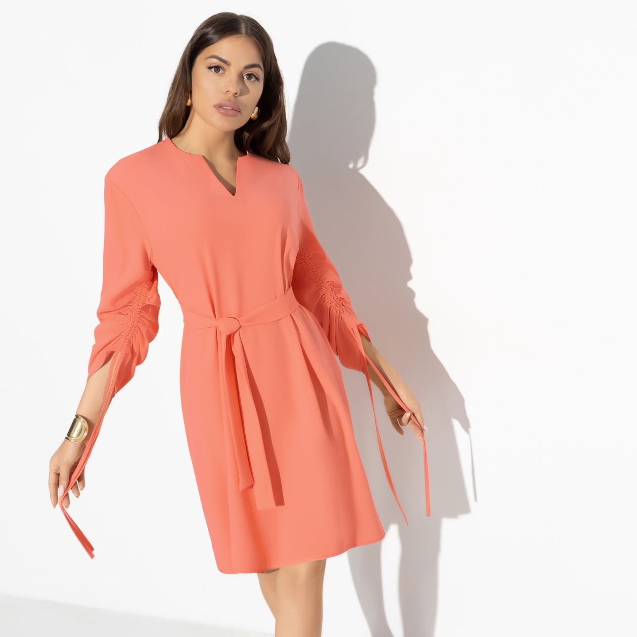 Персиковый цвет сообщает о тепле, даже если за коном другая погода. Главное – праздник в душе. А к нему и наряд соответсвующий – платье CHARUTTI со сборками на рукавах, расслабленный крой и элегантная длина.
