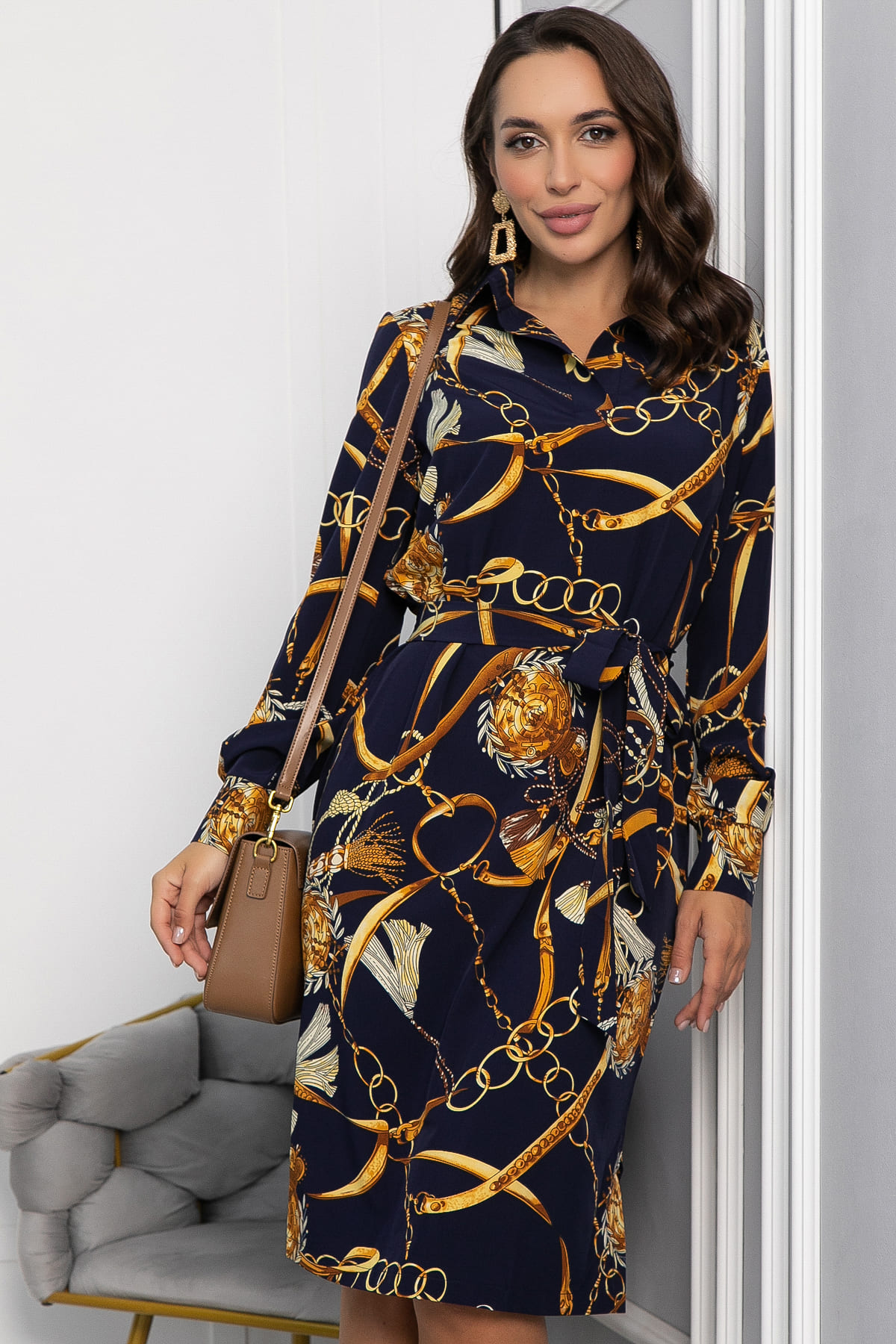 Великолепная модель платья прямого силуэта с оригинальным принтом. Необычный рубашечный воротник на высокой стойке придает платью особый статус. Планка в стиле «поло» делает изделие особенно элегантным. Платье актуальной средней длины с разрезами по бокам. Рукав длинный, свободный, на широком манжете с двумя пуговицами. Завершает образ красивый длинный пояс. Такое платье актуально как для деловых встреч, так и для посещения культурных и праздничных мероприятий. В таком платье вы будете чувствовать себя свободно, нарядно и модно одновременно.
