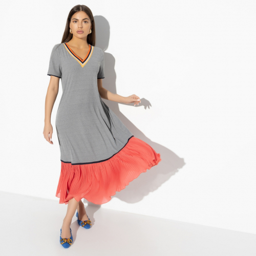 Выбирать не только моду, но и себя в моде — один из принципов CHARUTTI. Ориентироваться на свой вкус и комфорт легко с платьем CHARUTTI в милом сочетании цветов — серого и розового.