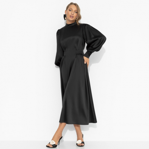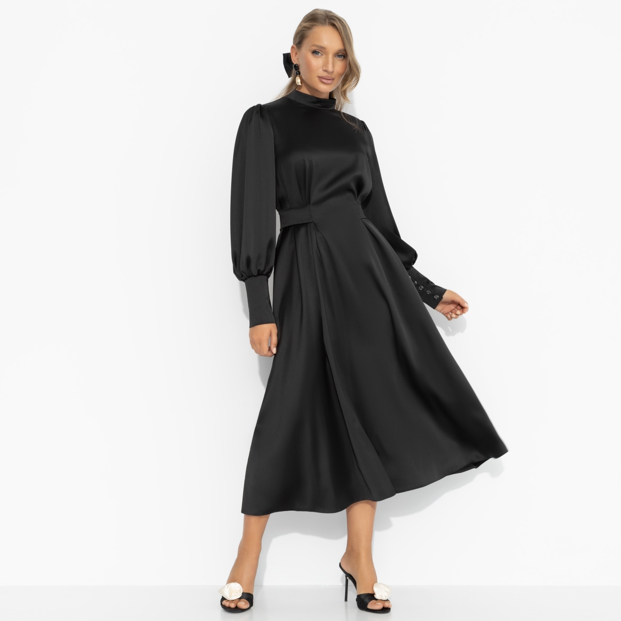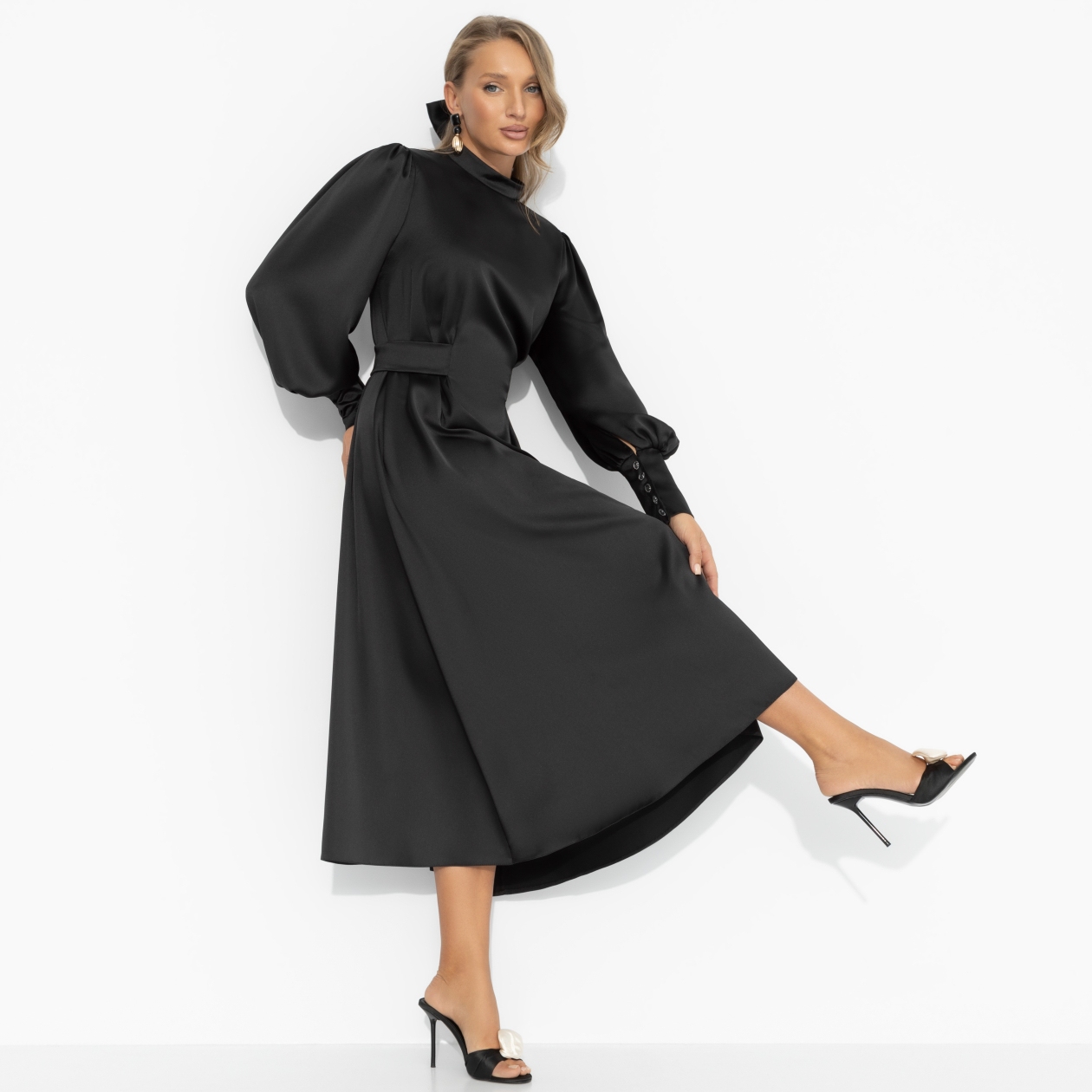 Она появилась, как строчка из романа – беззвучно, но запоминаясь навсегда. Атлас ловит свет и дыхание, обволакивая ее в мягкий полумрак роскоши. Это платье – как чёрная магия: чарует без слов. Платье миди из гладкого атласа с поясом подчёркивает талию и мягко струится по силуэту. Высокий ворот и рукава с пуговицами создают элегантный акцент.