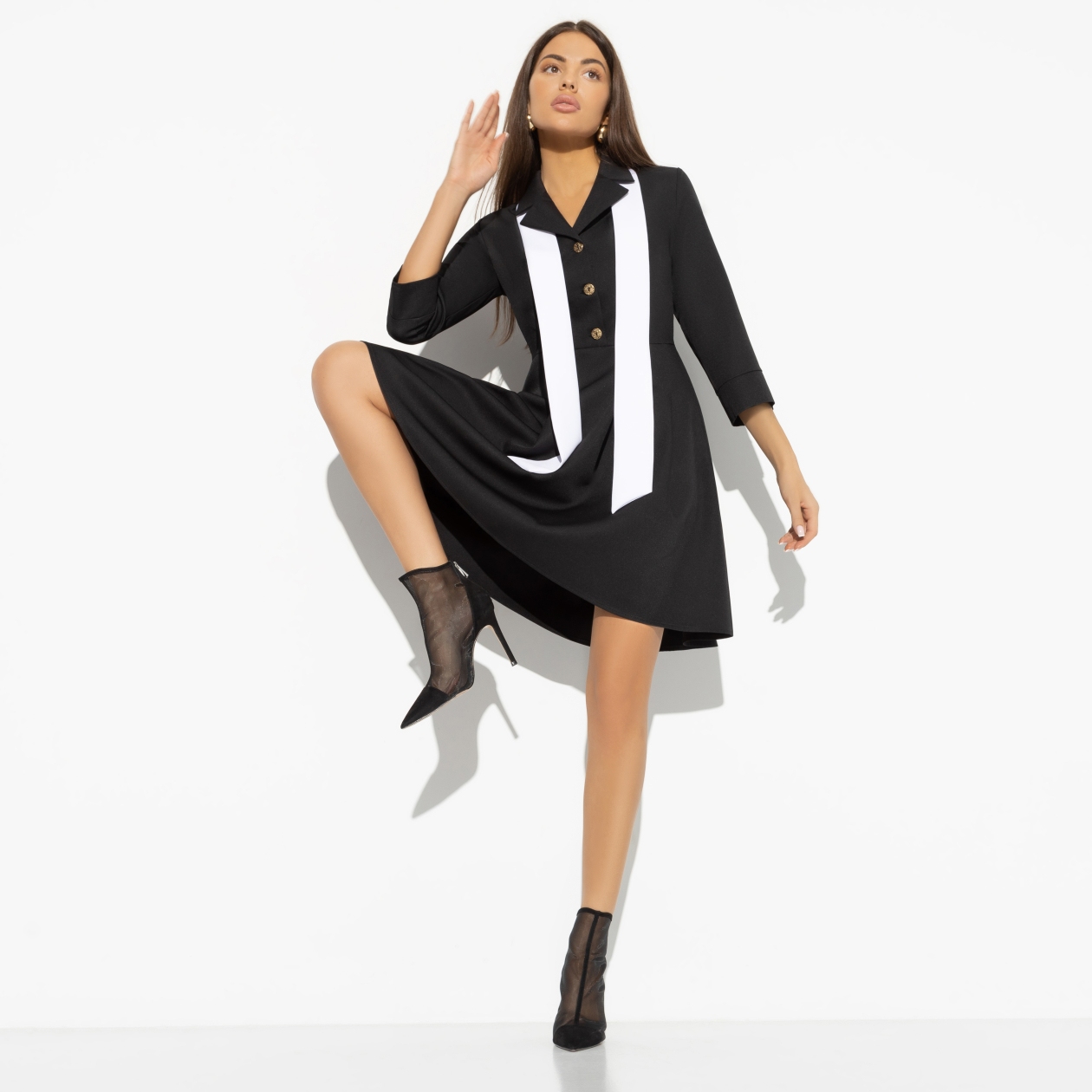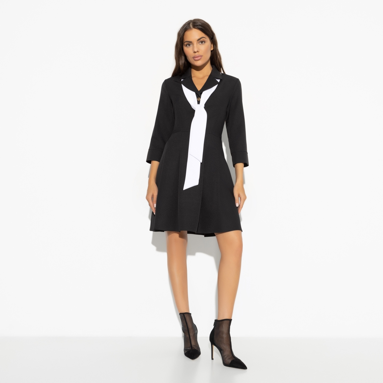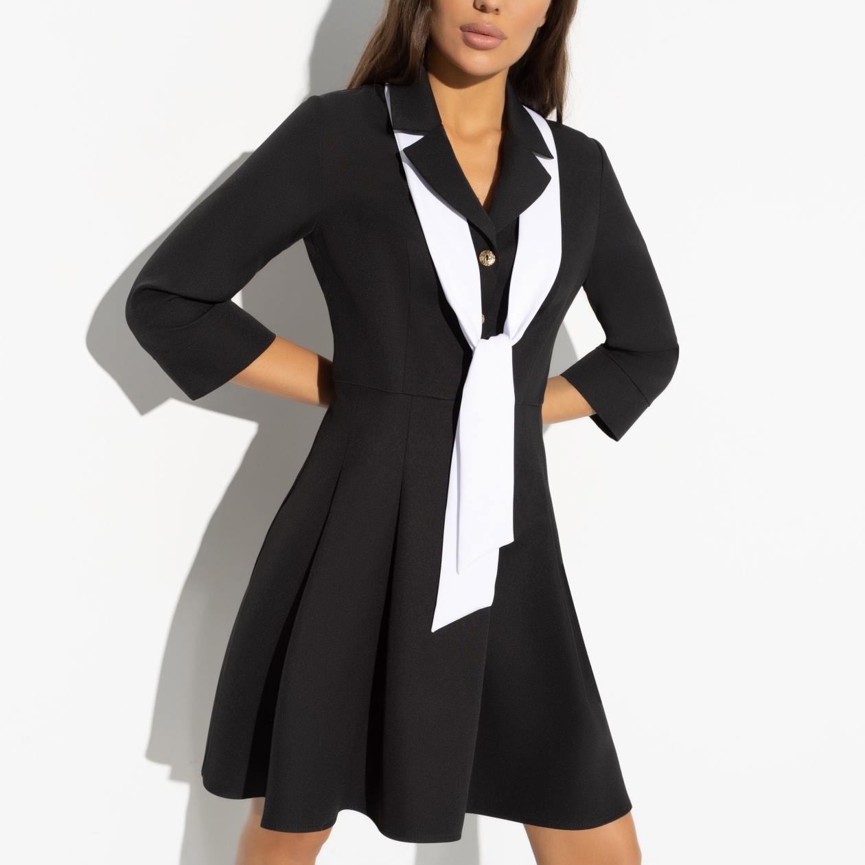 Твоим основным критерием поиска работы было гибкое начало дня. Никогда не знаешь, сколько времени утром уйдет на создание образа. Начальство должно относиться с пониманием. Платье длины выше колена. Приталенный силуэт. Расклешенная юбка. Тонкий шарф белого цвета в комплекте.