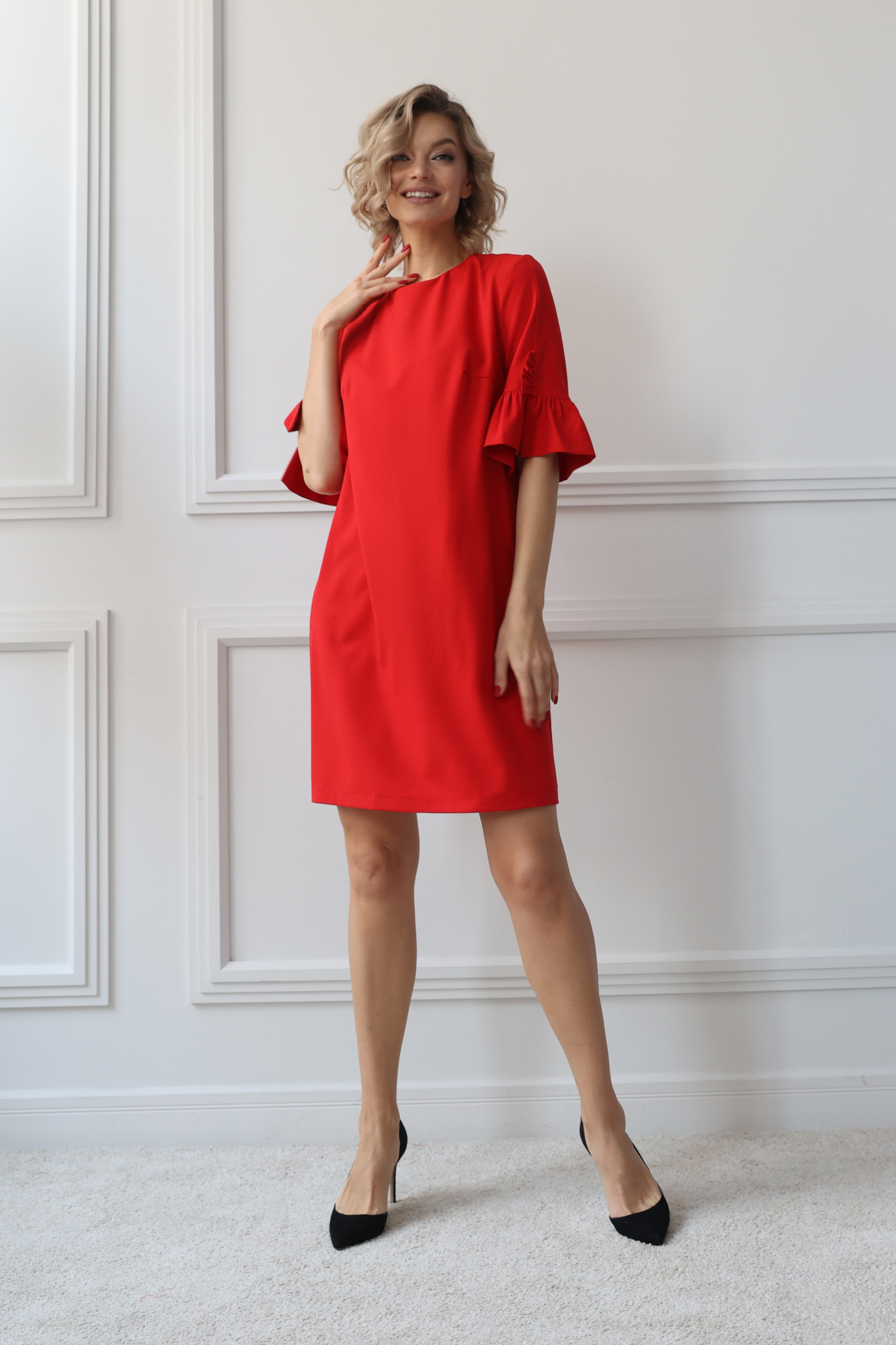 Платье из костюмной ткани прямого кроя с круглой горловиной и воланами на рукавах.