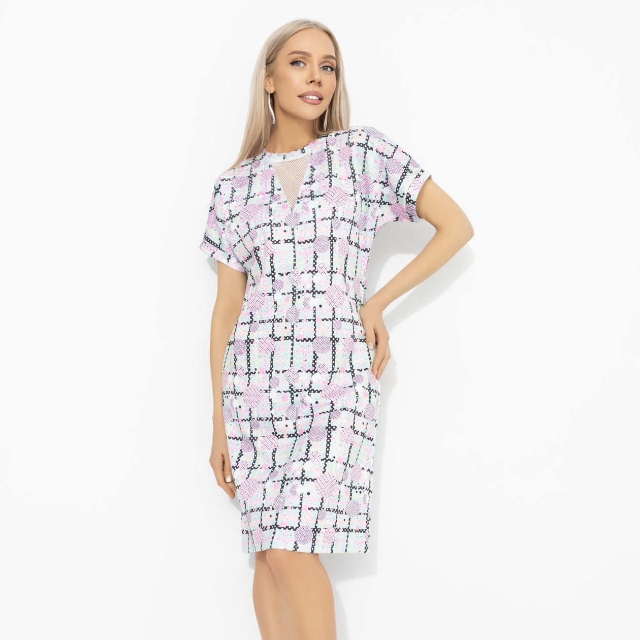 Бриджит Джонс доказала: быть немного спонтанной – это уже половина успеха. Платье ЧАРУТТИ как раз для таких моментов – когда решение принимается за секунду, а образ всё равно попадает точно в цель. Платье свободного силуэта из ткани «водолаз скуба». Короткий рукав, округлая горловина с контрастной отделкой, декоративная вставка из эластичной сетки. И даже неожиднные повороты у тебя получаются безупречно!