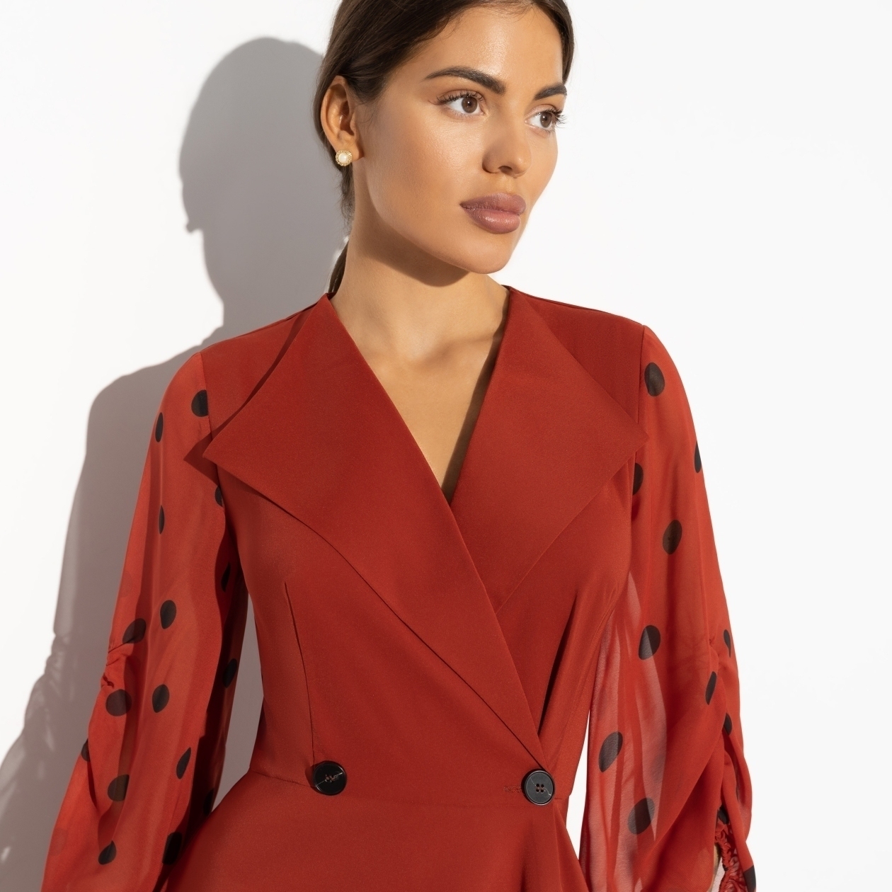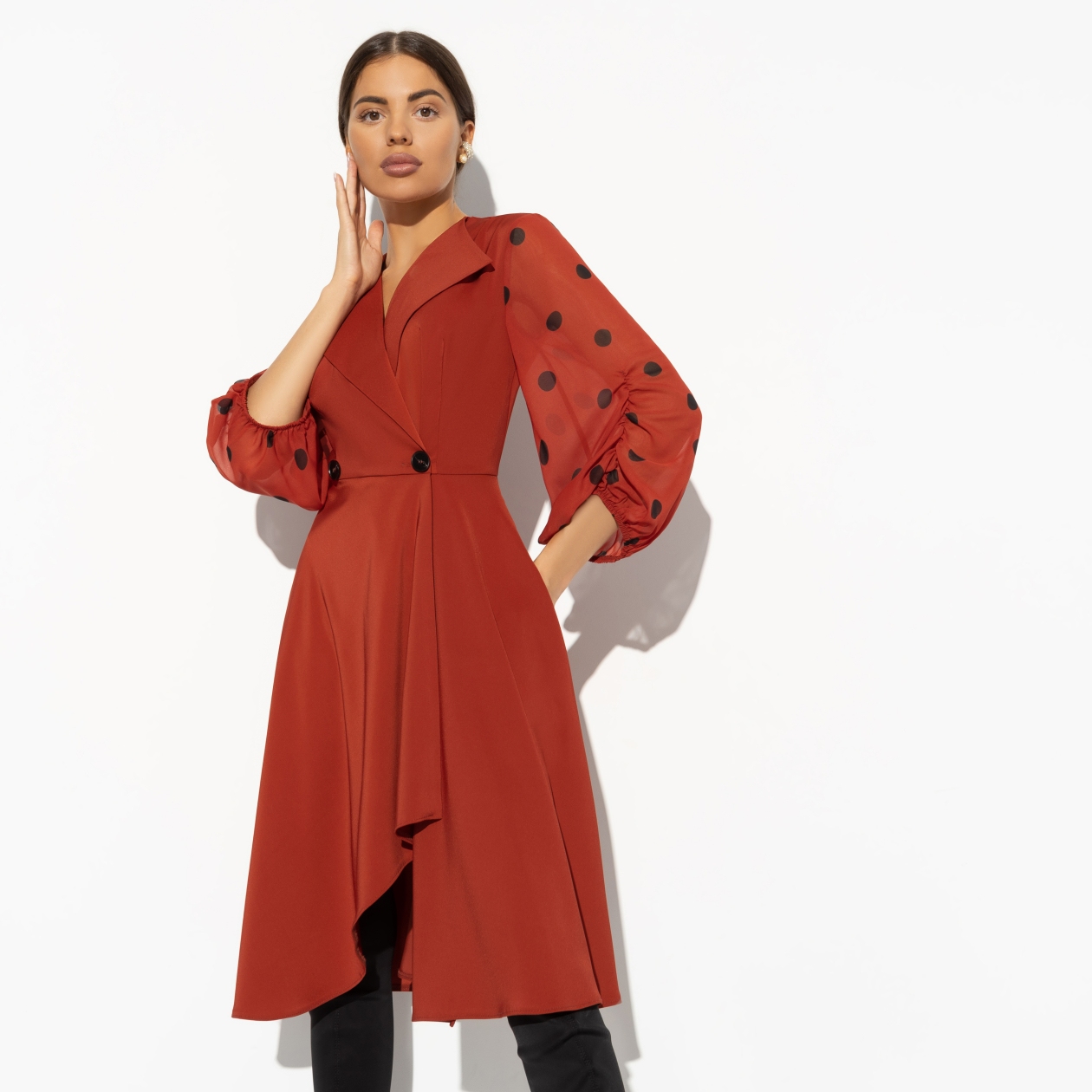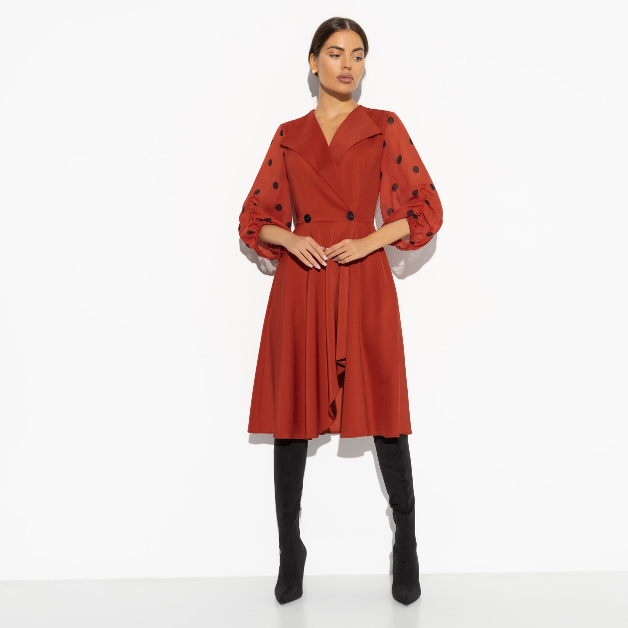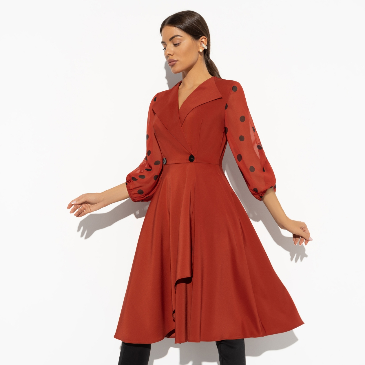 Яркое воспоминание из детства – как мама собирается на работу. Быстрые шаги по дому, мелькание платья и шлейф духов, который оставался после её ухода. Мы точно помним её образ. Наши дети сейчас так же запоминают нас. Будем яркими! Платье ассиметричного кроя на запах. Приталенный силуэт. Сборка на рукавах.