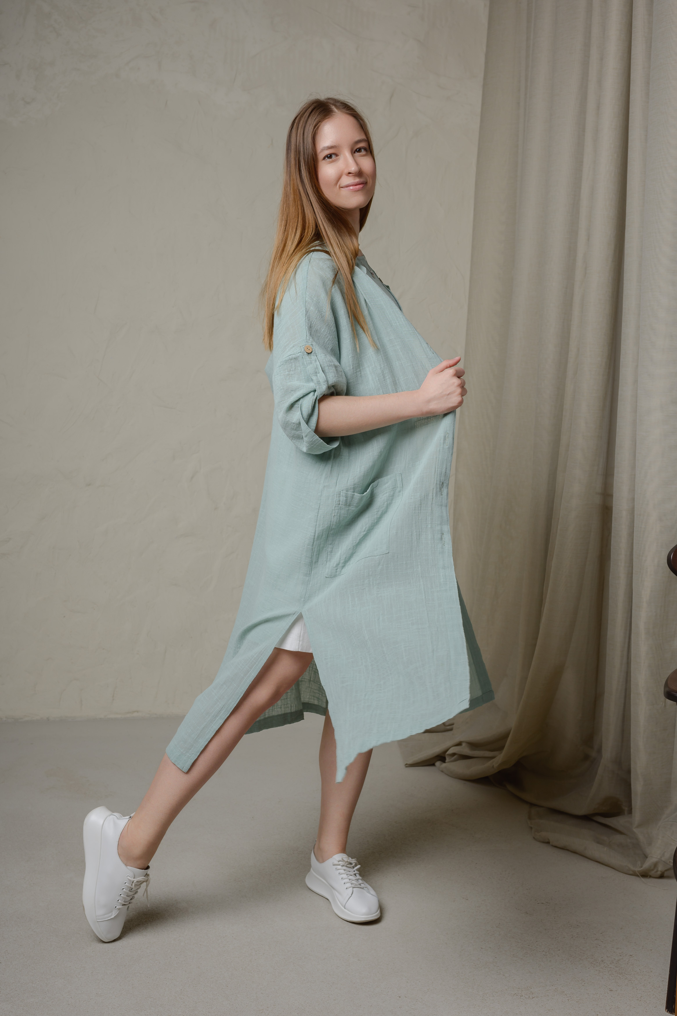 Модель можно носить со сквозной застежкой как платье или в расстегнутом виде в качестве длинного непринужденного кардигана.