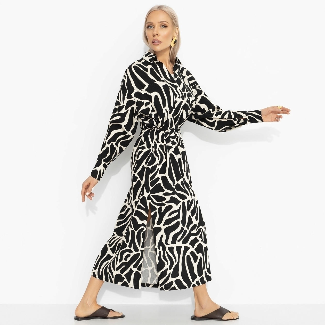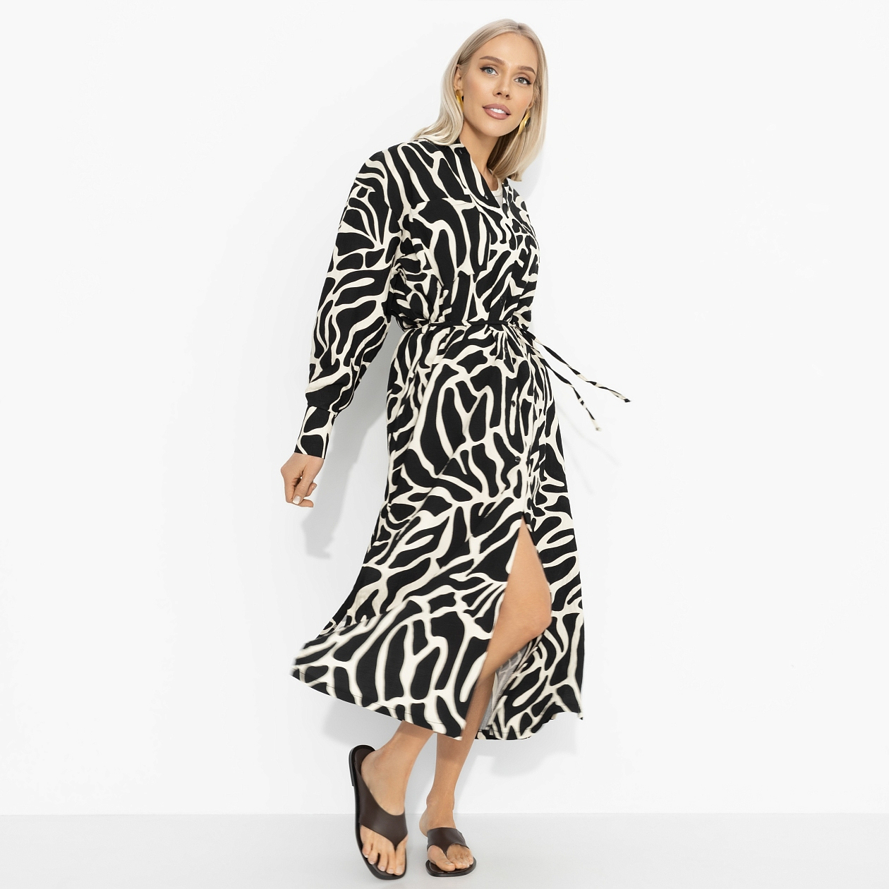 Древняя легенда гласит: женщина, которая заметно одевается, берёт судьбу в свои руки. Платье ЧАРУТТИ продолжает эту историю – графичный рисунок, уверенный силуэт и энергия, которая чувствуется с первого шага. Платье-рубашка из вискозной ткани с добавлением нейлона. Свободный крой, длинный рукав, застёжка на пуговицы. Пояс для акцента на талии. Юбка легко струится и кокетливо отзывается движениям. И легенда продолжается – уже о тебе!