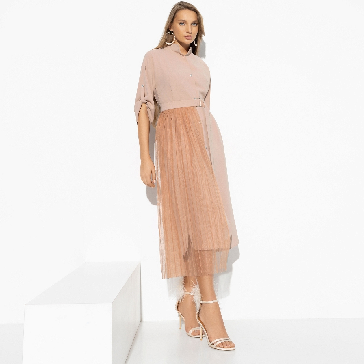 Эмоции, которые пробуждает платье-рубашка «Изящный облик», — это всё, что нужно вашим клиентам для создания уникального стиля. Уникальная комбинация костюмной ткани и сетки притягивает взгляды с первого момента, трансформируя любое событие в феерию. Этот наряд говорит без слов — он рассказывает о чувствах нежности и вечной элегантности. Предлагая его оптом, вы даёте возможность каждому клиенту прикоснуться к этому волшебству. Этот образ — как самое любимое воспоминание о детской Барби, всегда остаётся с вами, всегда актуально и всегда неповторимо. Ваши покупатели будут вам благодарны за то, что вы избрали для них эту шикарную возможность заявить о себе через моду.