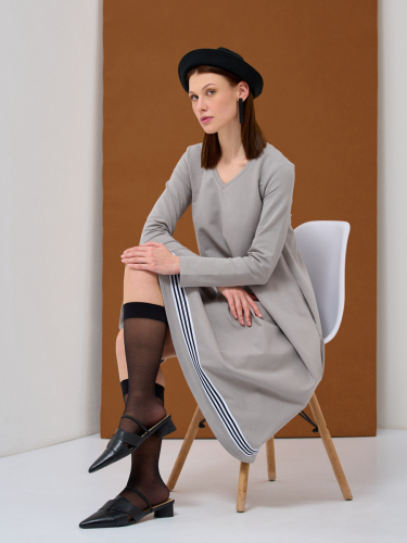 Платье-рубашка из штапеля, со спущенной линией плеча, рубашечным воротником, застёжкой-планкой на металлических кнопках, коротким рукавом с отворотом, накладным карманом на груди, украшенный шелковой нитью с имитацией ручного стежка и карманами в боковых швах. Рост модели 170 см. Размер изделия 42. Только ручна стирка.