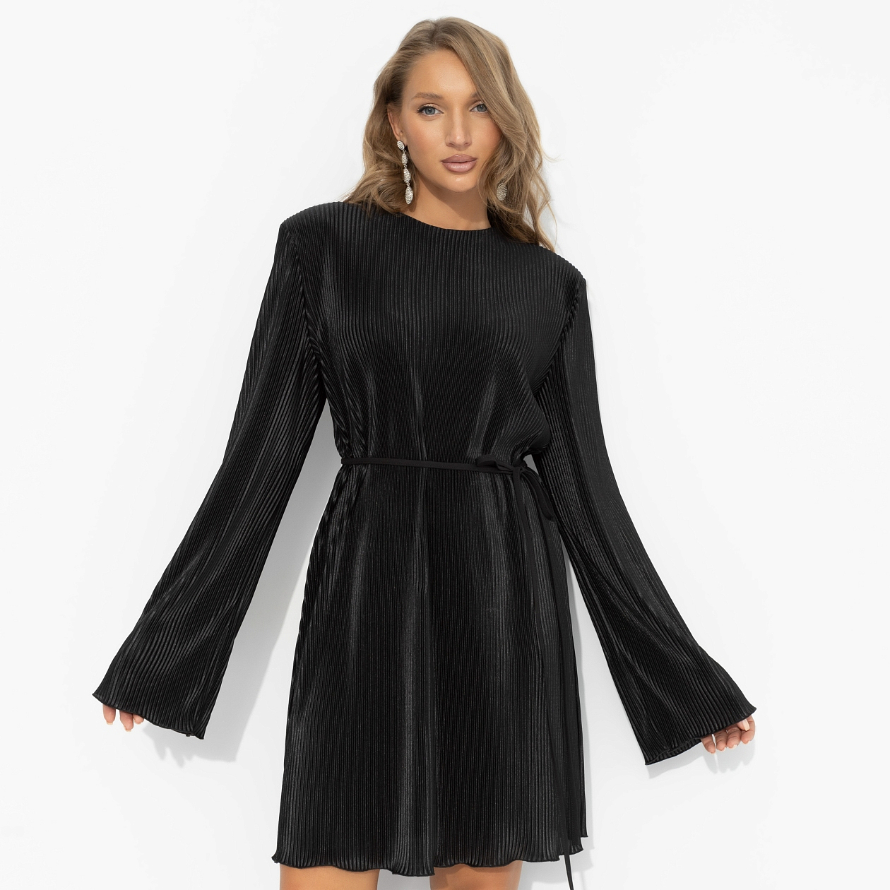 Платье-хит, в котором легко потерять счёт времени – и заставить других потерять голову. Она кружится в потоке мгновений – и всё внимание принадлежит ей. Свободный силуэт с поясом тонко подчёркивает талию и уверенность. Мягкий трикотаж «гофре» струится, переливается при каждом движении, подчеркивает осанку и уверенность. Платье со свободными рукавами на подплечниках.