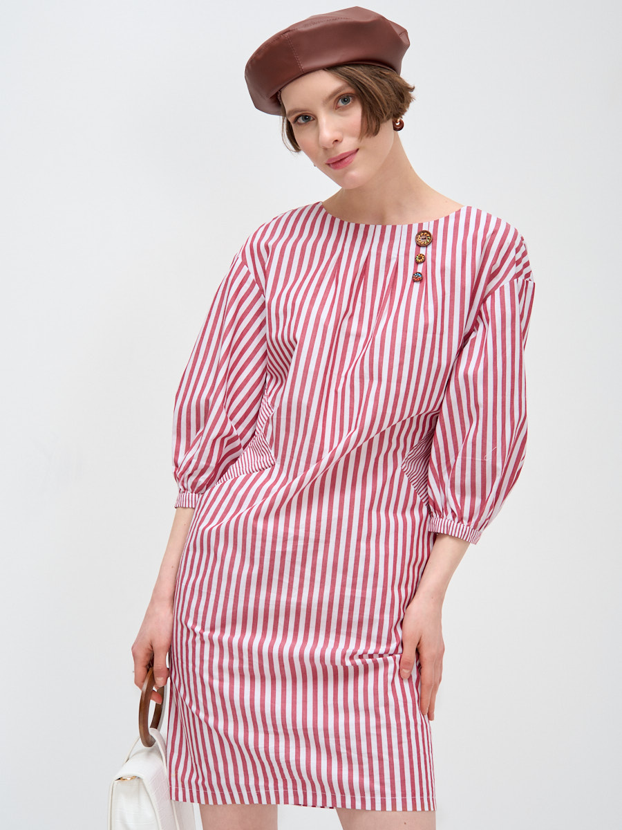 Повседневное платье силуэта «бочонок» со спущенной линией рукава, с защипами от линии горловины, декоративными пуговицами, рукавом 3/4 на манжете, и так же с декоративным отрезным бочком и планке по спинке.Рост модели 170 см. Размер изделия 42. Только ручна стирка.