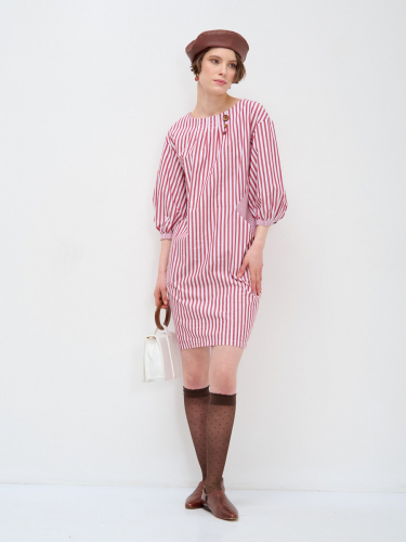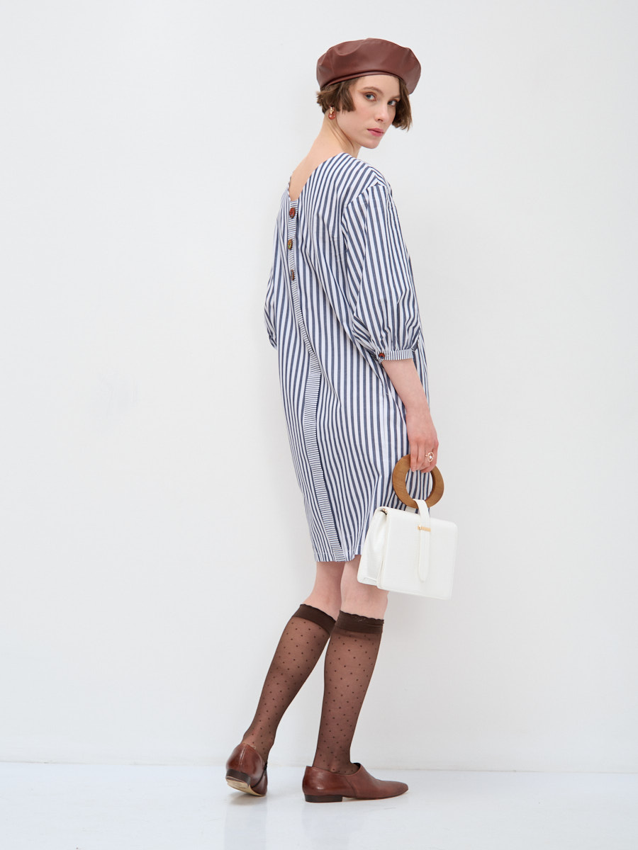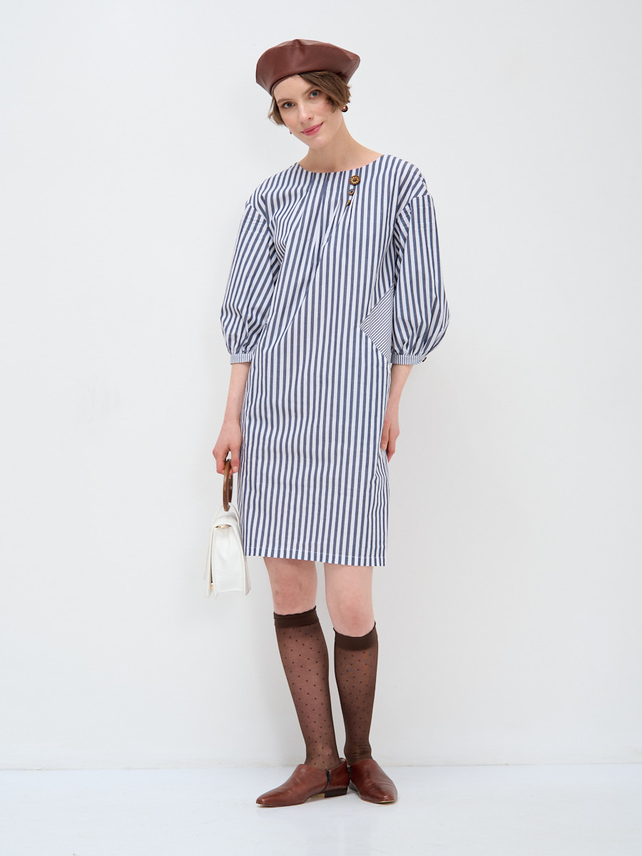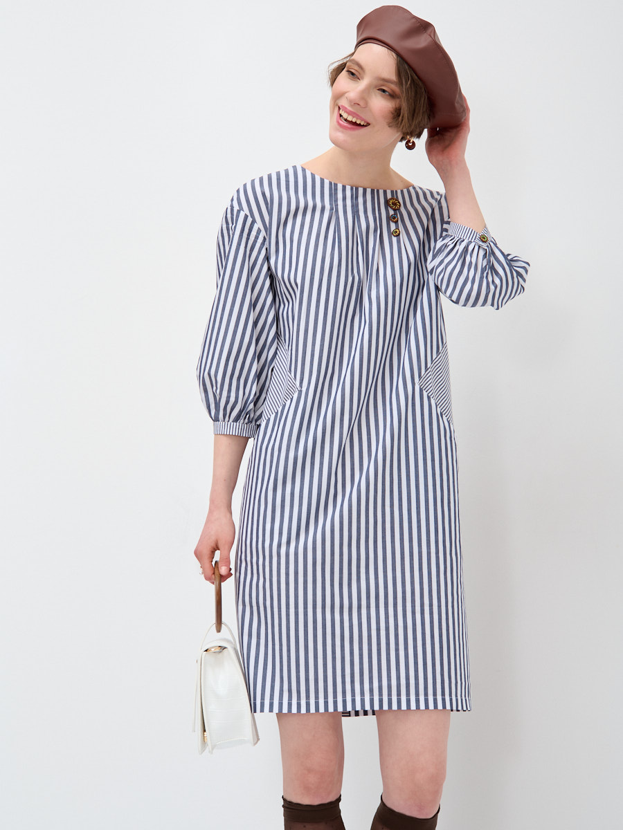 Повседневное платье силуэта «бочонок» со спущенной линией рукава, с защипами от линии горловины, декоративными пуговицами, рукавом 3/4 на манжете, и так же с декоративным отрезным бочком и планке по спинке.Рост модели 175 см. Размер изделия 42. Только ручна стирка.