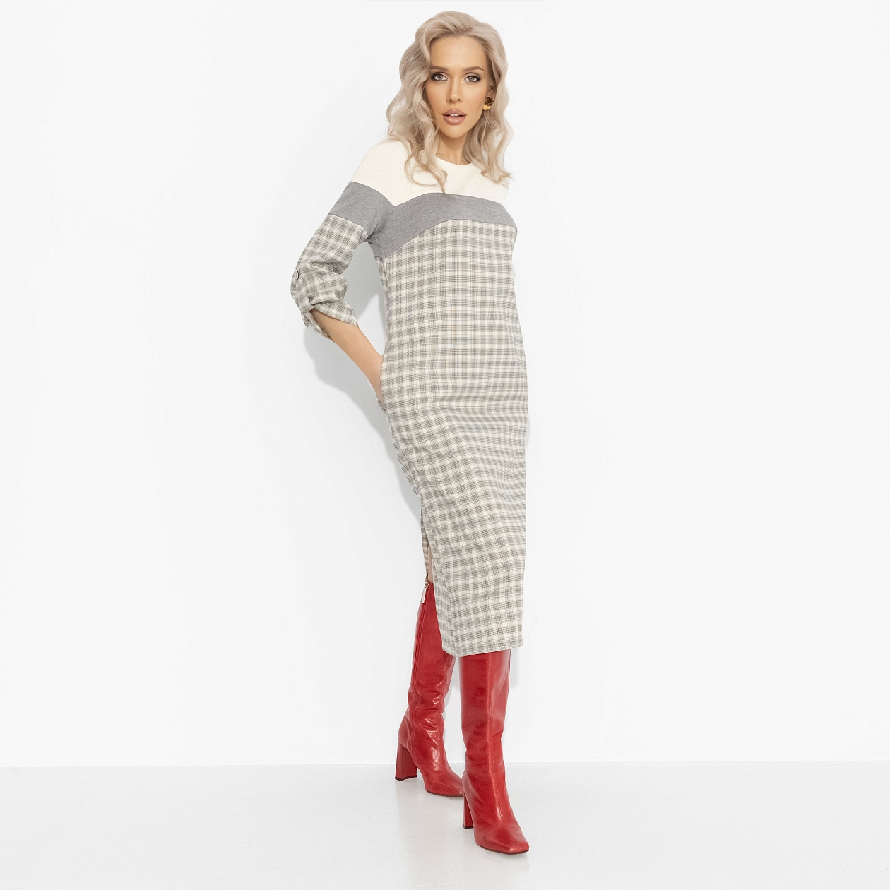 Для тех дней, когда хочется не доказывать, а просто быть. Мягкая клетка, спокойные серо-бежевые тона и расслабленный силуэт как будто шепчут: «сегодня твой главный план – нравиться себе». Добавьте яркие сапоги или помаду, и минималистичный образ превращается в оду внутренней гармонии. Платье миди прямого и очень женственного кроя. Визуально вытягивает силуэт и комфортно садится на разные типы фигур. Контрастные однотонные вставки в верхней части балансиируют клетку и освежают тон кожи. Изделие с карманами и акцентными декоративными пуковицами по спинке.