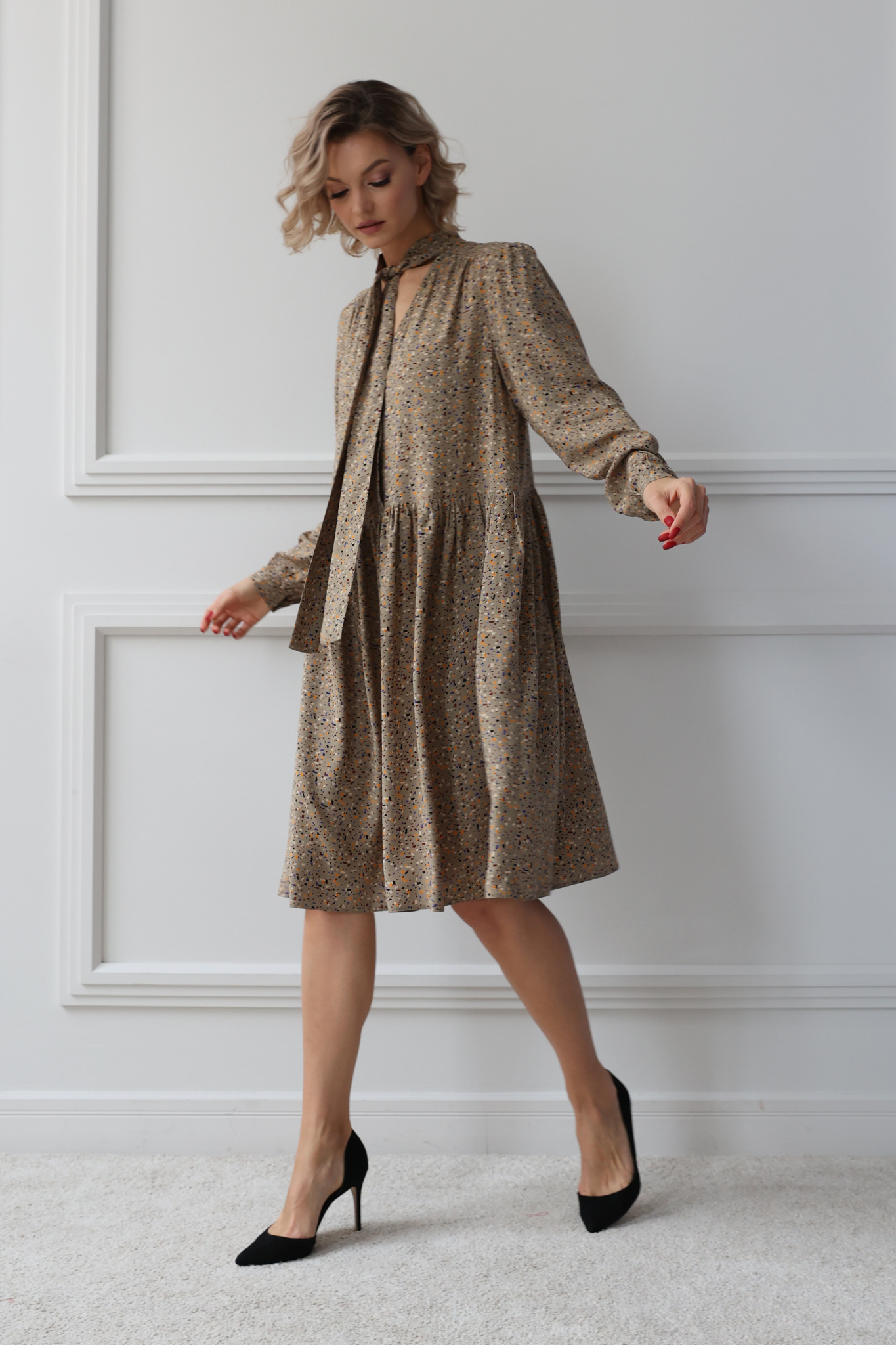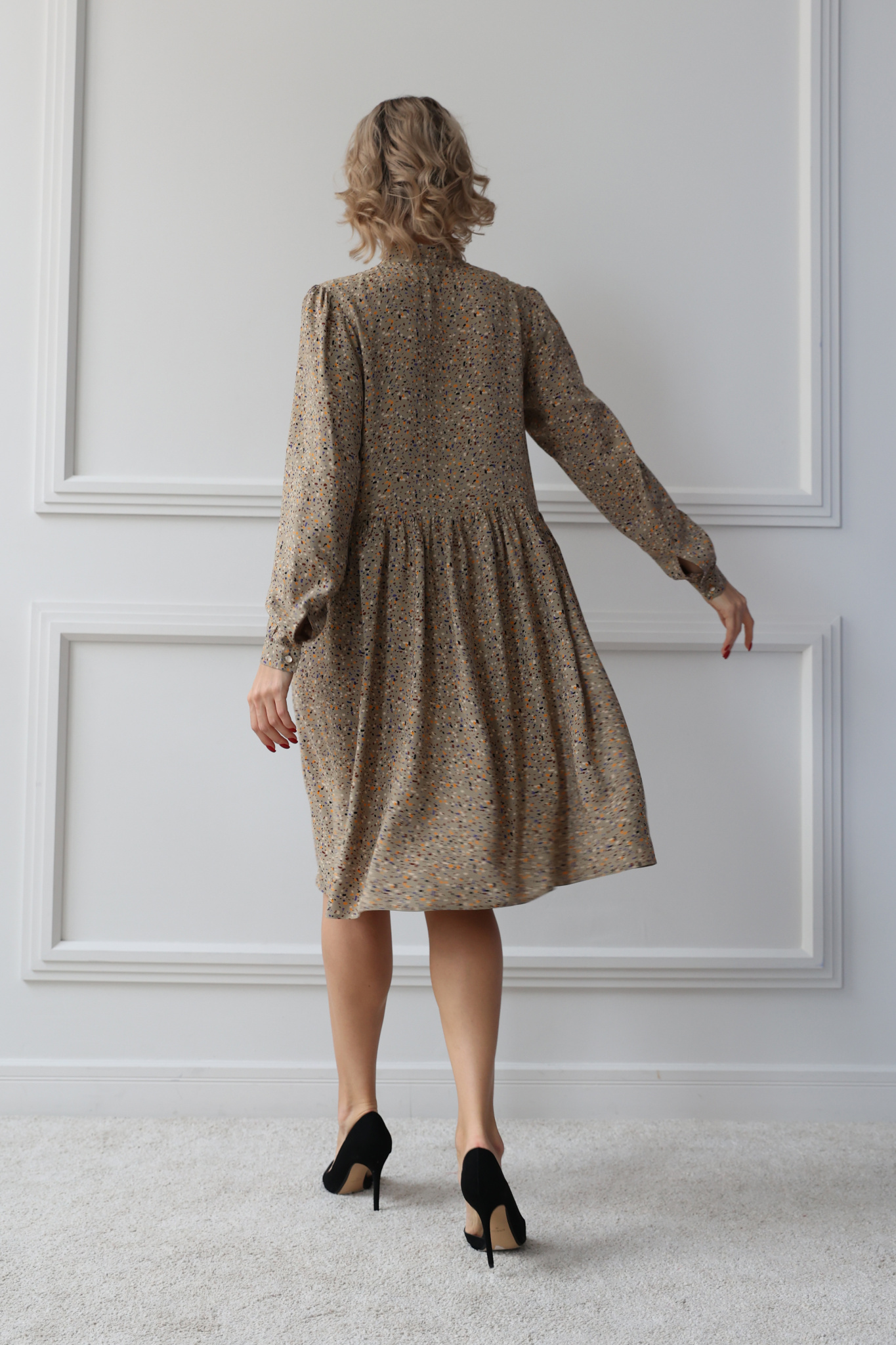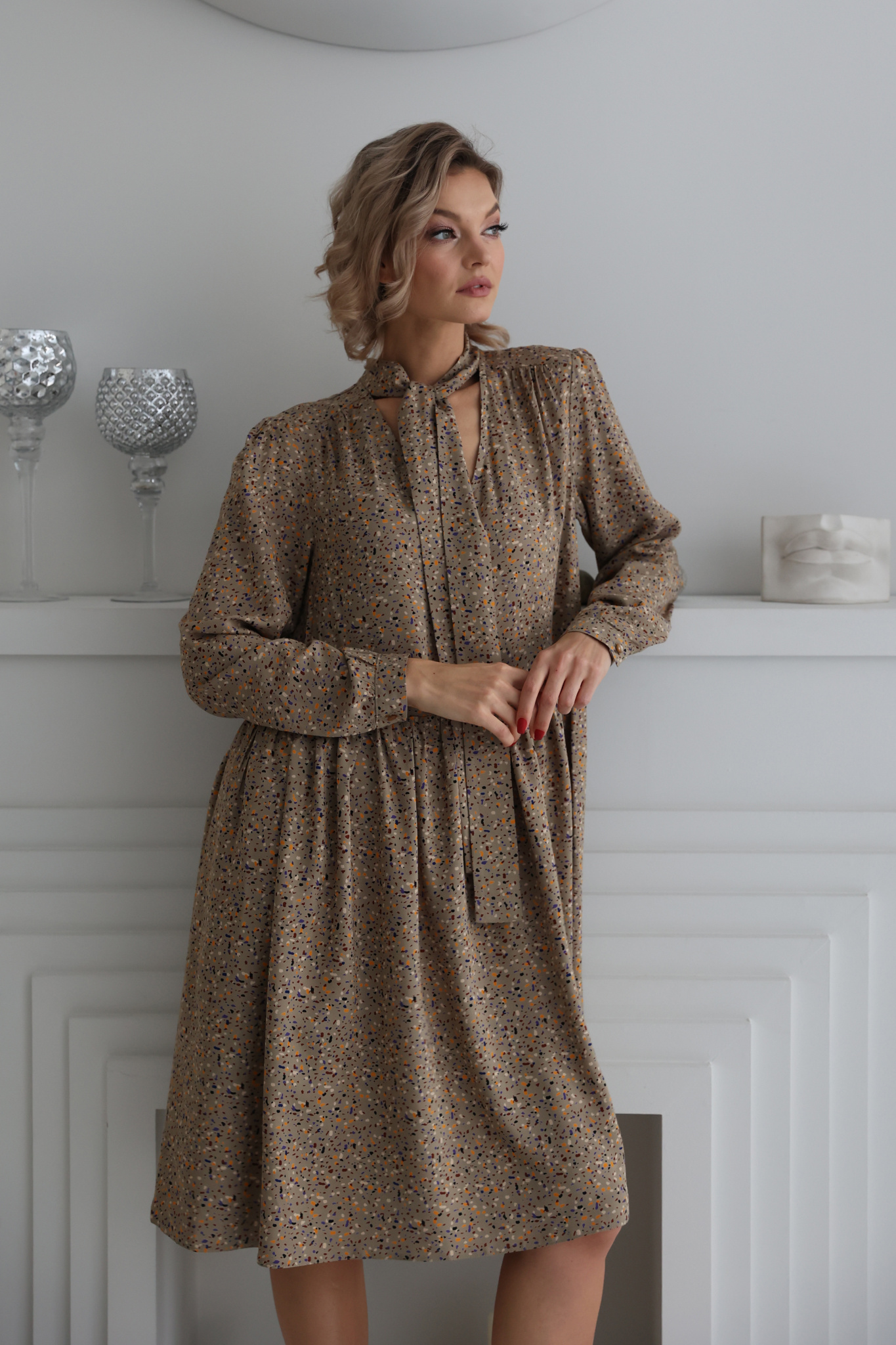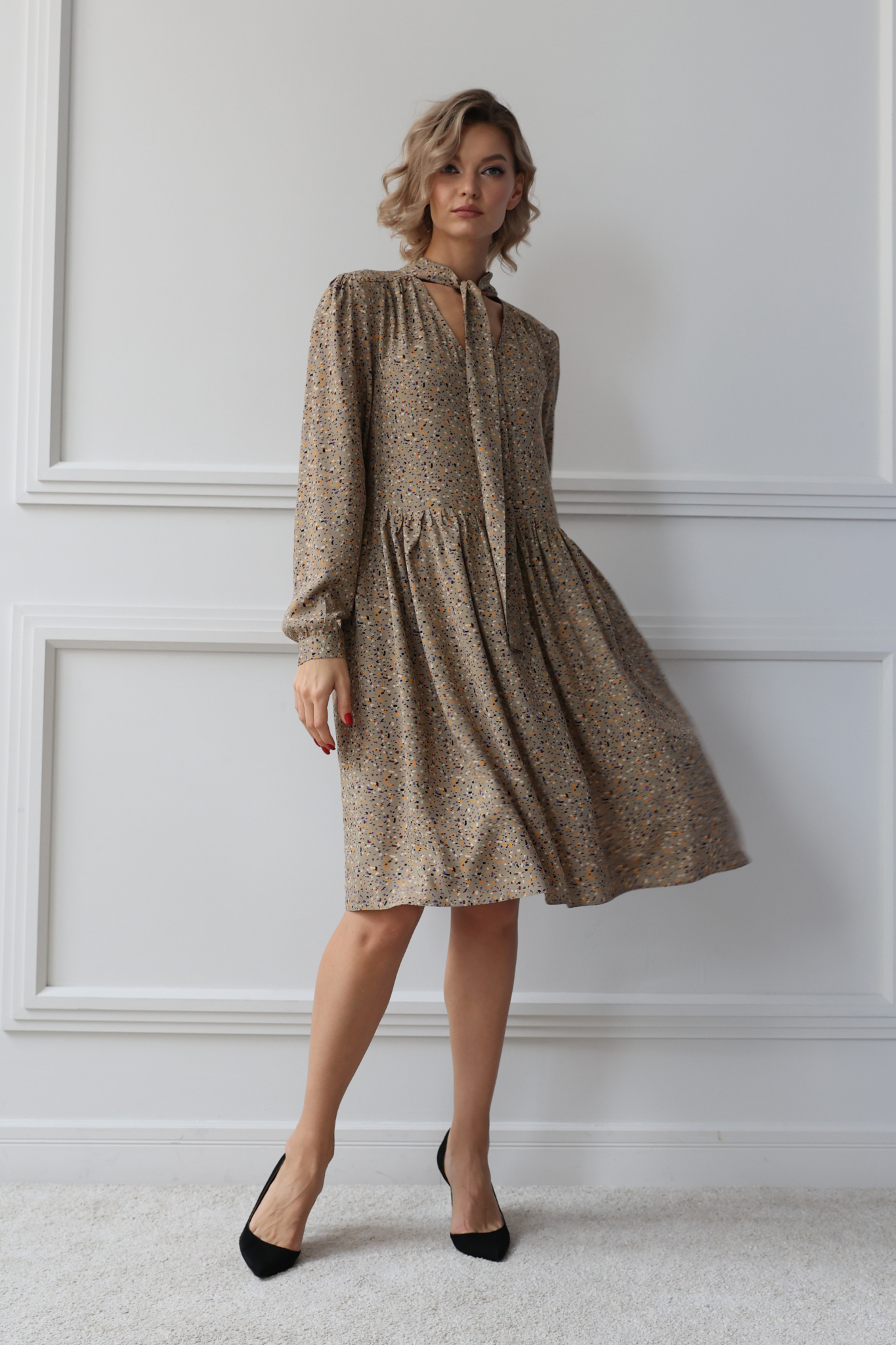 Платье из вискзы свободного кроя с длинным рукавом.