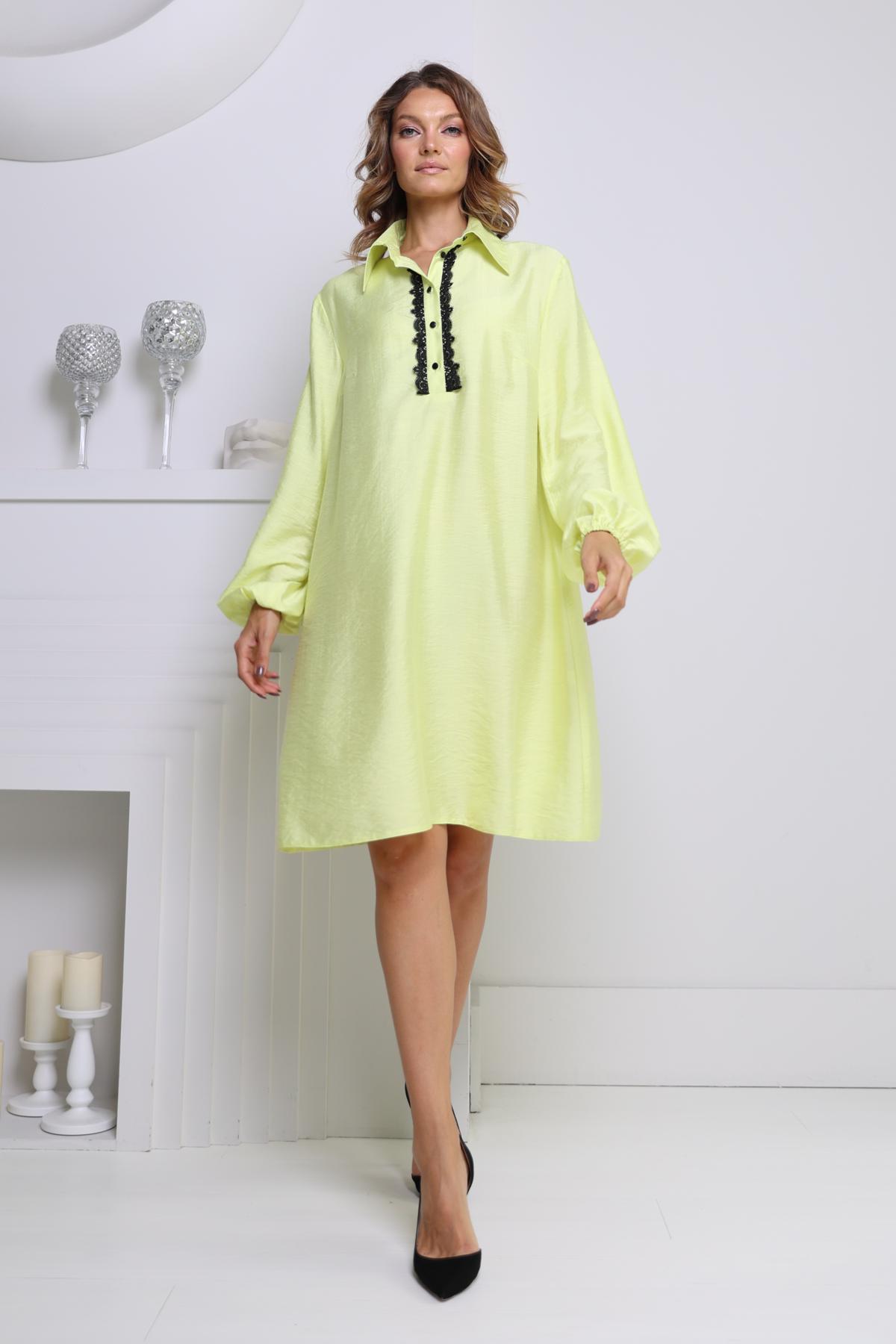 Платье свободного кроя с отложным воротом. Застёжка по планке спереди отделана кружевом. Длинный, втачной рукав с резинкой на манжете. Контрастный пояс в тон отделке в комплекте.