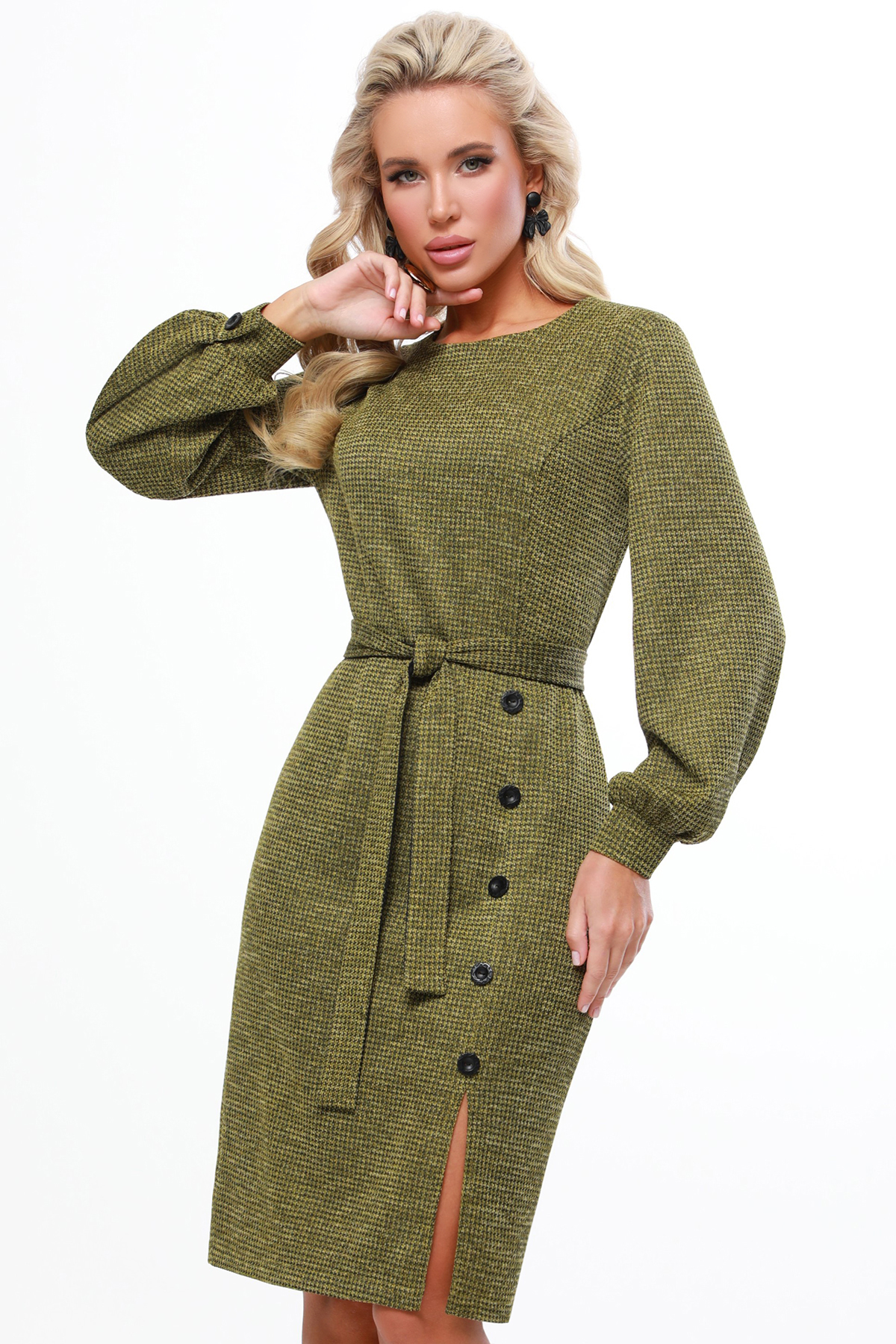 Трикотажное платье с поясом — идеальный вариант на холодное время года, который поможет выглядеть стильно и женственно как на работе, так и в повседневной жизни. Приталенный фасон подчеркивает привлекательные изгибы тела, а длинные рукава-фонарики придают изделию легкость и романтичные нотки. Изюминку платью добавляет не только съемный пояс, но и вертикальный ряд декоративных пуговиц, который заканчивается эффектным разрезом на юбке. Плотная трикотажная ткань приятна к телу, слегка тянется и позволяет чувствовать себя комфортно. А главное, она не выдаст недостатки фигуры и точно согреет в холодный осенне-зимний сезон. Чтобы трикотажное платье долго радовало вас красотой и качеством, рекомендуется стирать его в деликатном режиме при температуре не более 30 градусов.
