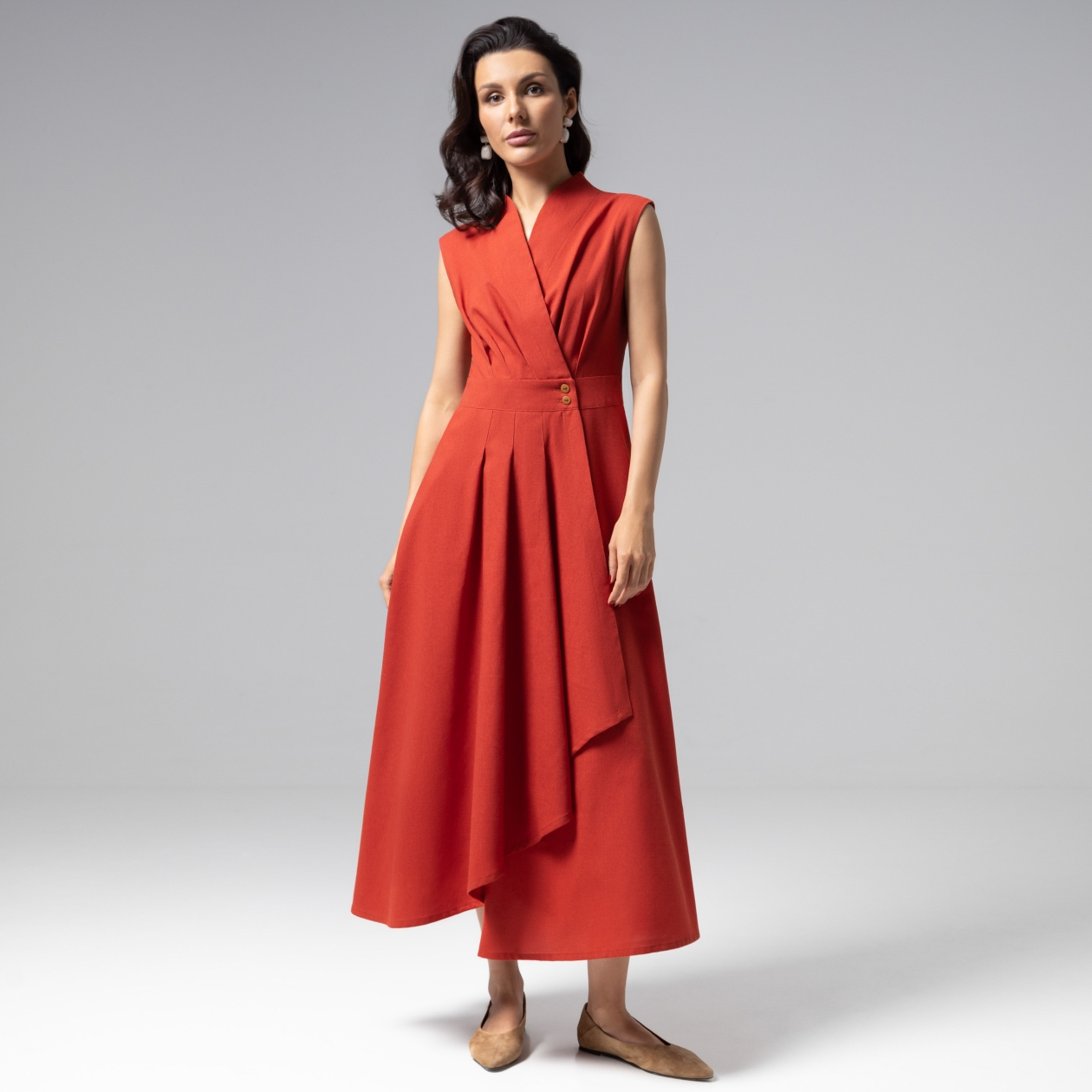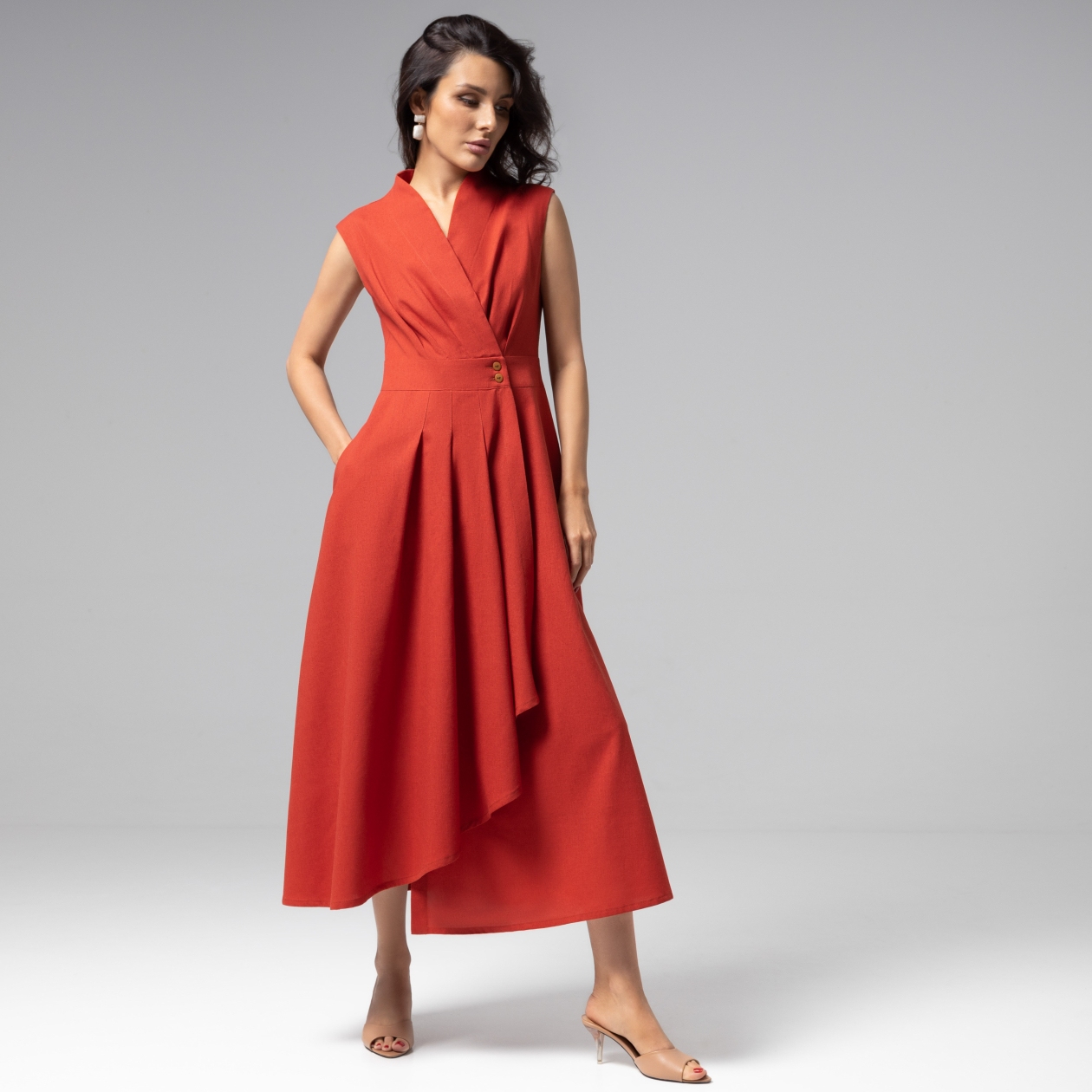 Платье из коллекции PREMIUM – квинтэссенция средиземноморской эстетики, где каждая складка дышит роскошью. Изысканный силуэт платья ЧАРУТТИ воплощает безупречный баланс женственности и лаконичности. Приталенный крой с запахом мягко подчеркивает талию. Элегантная драпировка струится по фигуре. Платье изготовлено из люксовой смесовой ткани. Хлопок дарит изделию невесомую мягкость, а лён добавляет благородную структуру и идеальную формоустойчивость даже после длительного ношения. Терракотовый оттенок напоминает отблеск заката на средиземноморской керамике. Особый метод окрашивания ткани гарантирует сохранение цвета после множества стирок. Платье асимметричного кроя на запах. Есть карманы.