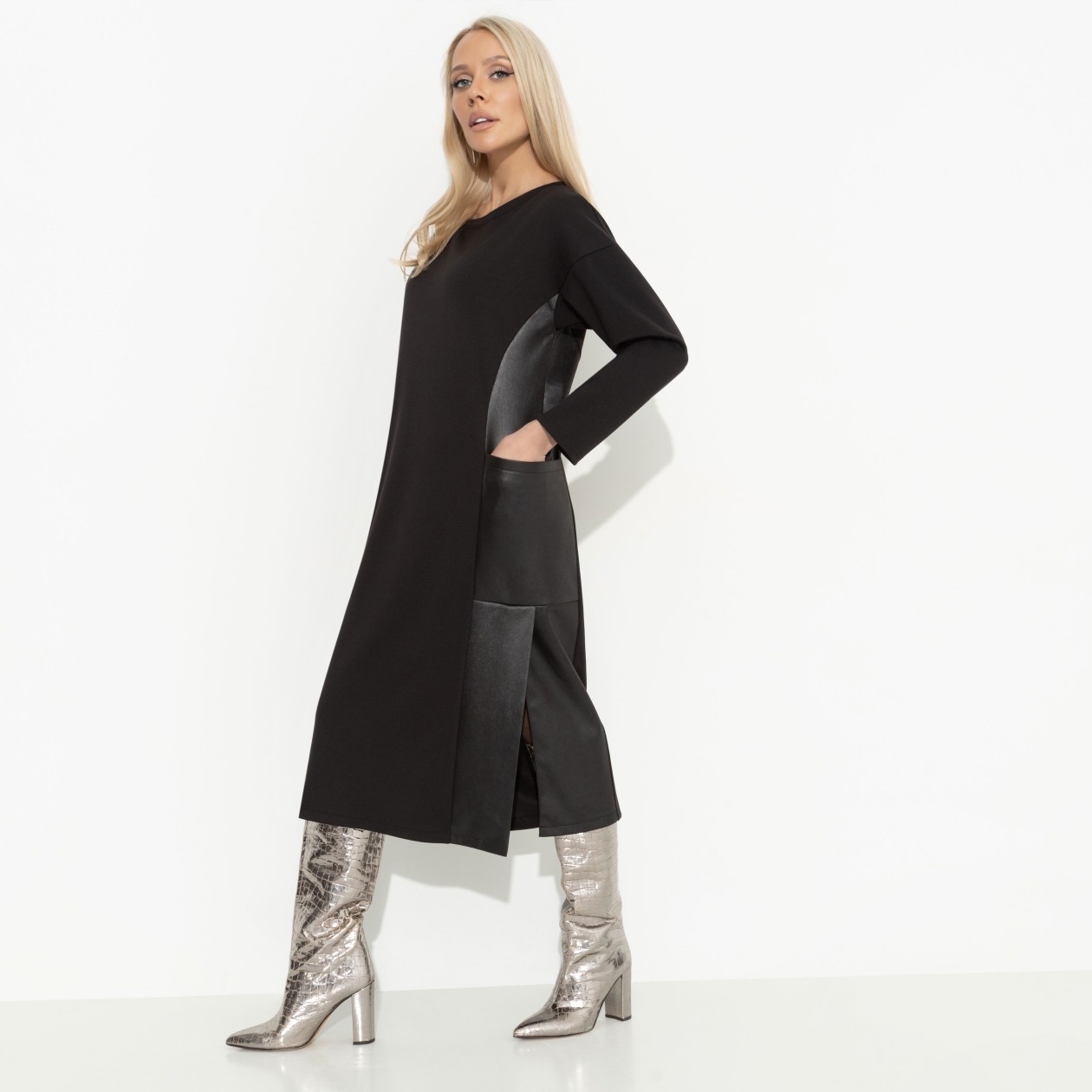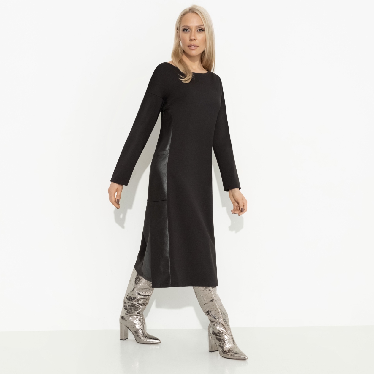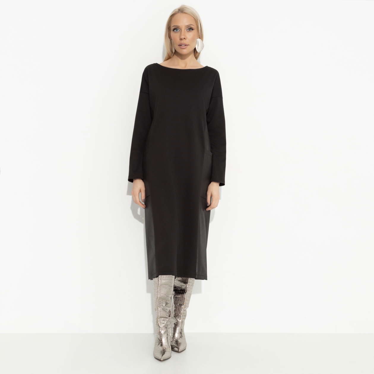 Вы уже в том социальном статусе, когда не нужны никакие доказательства привлекательности. Это свобода выбирать то, что вам действительно нравится. А вам нравится платье CHARUTTI в экстравагантном фасоне с кожаными элементами. Почему бы и да?! Платье свободной посадки в длине миди с разрезами по бокам. Вставки из экокожи по бокам изделия. Есть карманы. Линия плеча спущена.