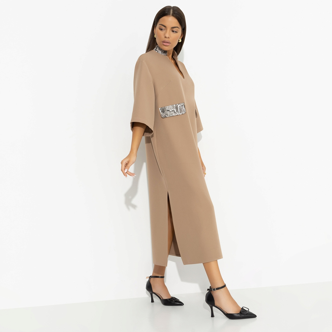 Платье «Деловая леди (миндальный)» от CHARUTTI — это воплощение элегантности и практичности в одном изделии. Сшитое из ткани «Барби», оно идеально подходит для женщин, которые ценят стиль и комфорт. Свободный крой миди с боковыми разрезами подчеркивает женственность, а имитация карманов из экокожи добавляет оригинальности. V-образный вырез и воротник-стойка, выполненные из акцентного материала, делают это платье идеальным выбором как для деловых встреч, так и для вечерних мероприятий. Закажите платье оптом и подарите своим клиентам шанс ощутить силу истинной женственности и уверенности.