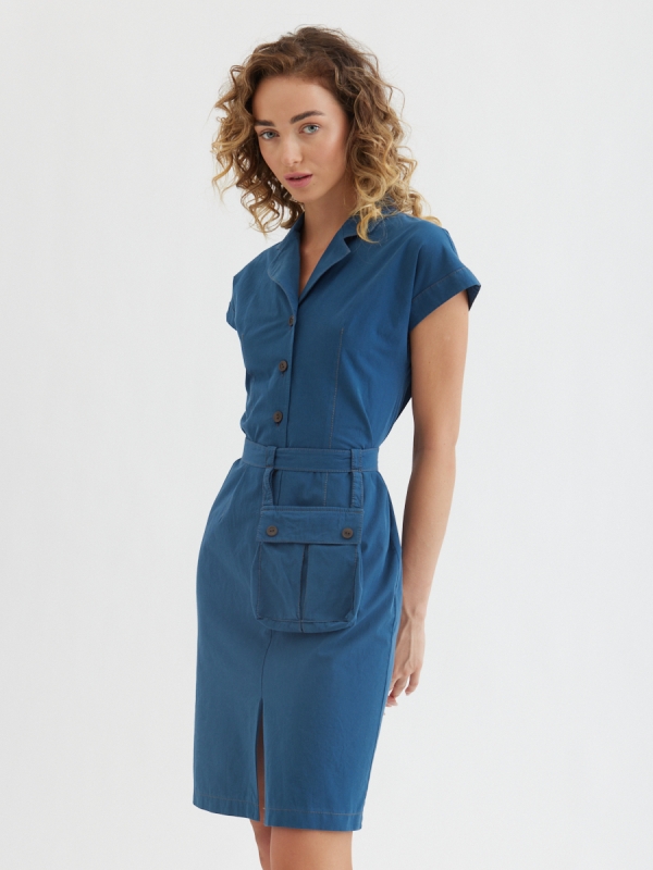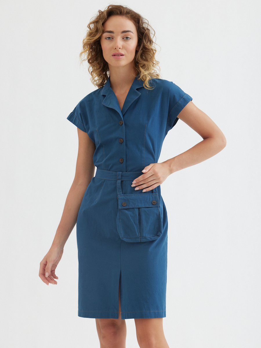Платье выполненное из хлопка. Спущенная линия плеча, рукав короткий с отворотом. Английский воротник однобортный с застежкой на пуговицы. Шлица по низу изделия полочки. Талиевые вытачки на спинке и полочке. Съемный пояс с сумкой. Рост модели 175 см. Размер платья на модели 42. Машинная деликатная стирка.