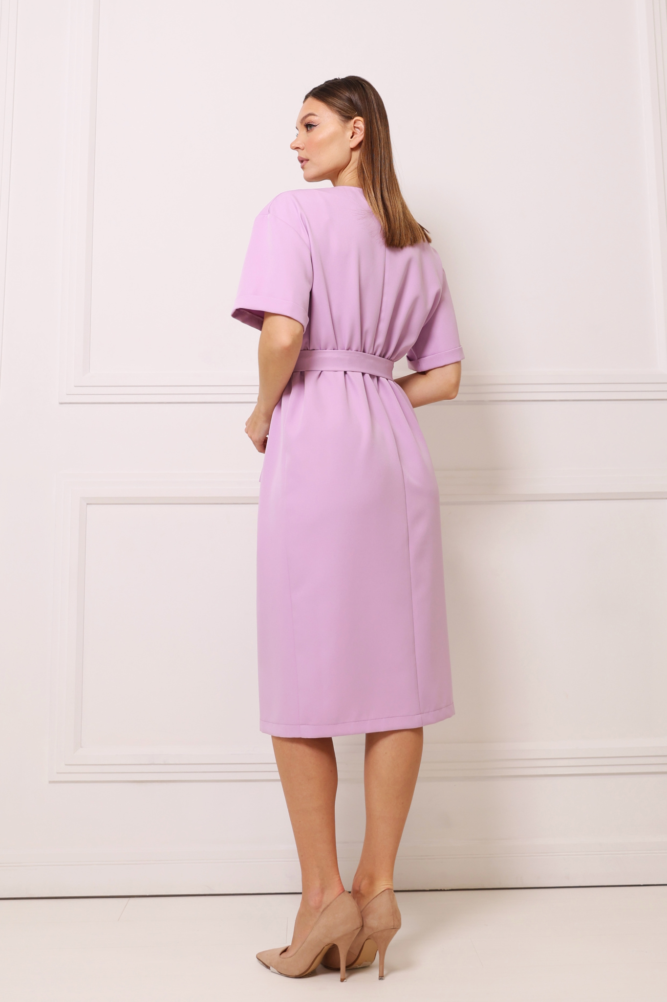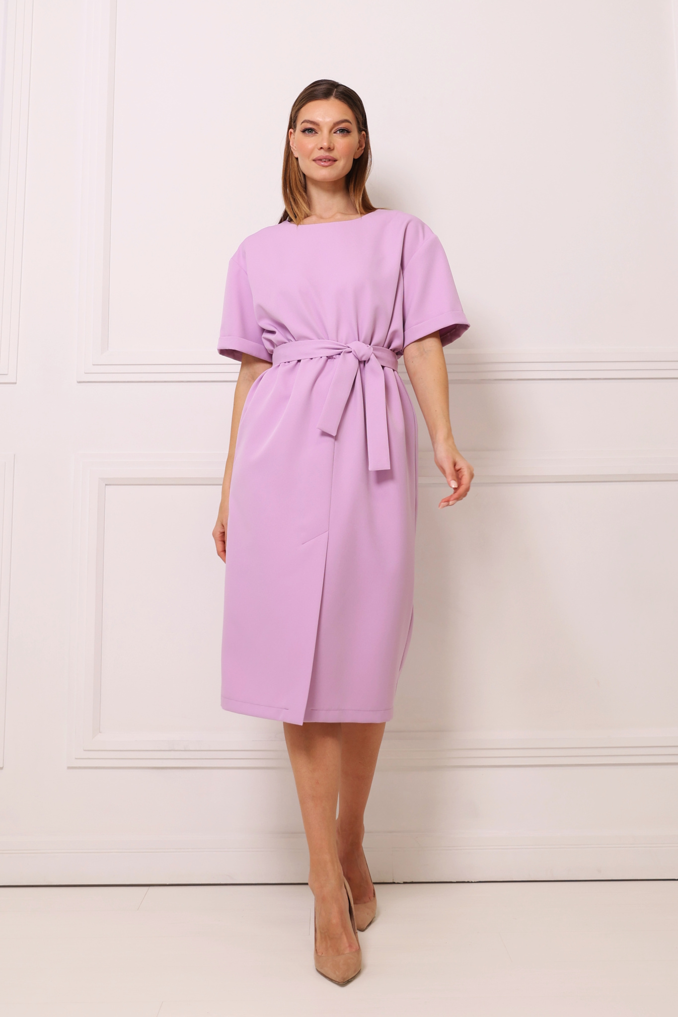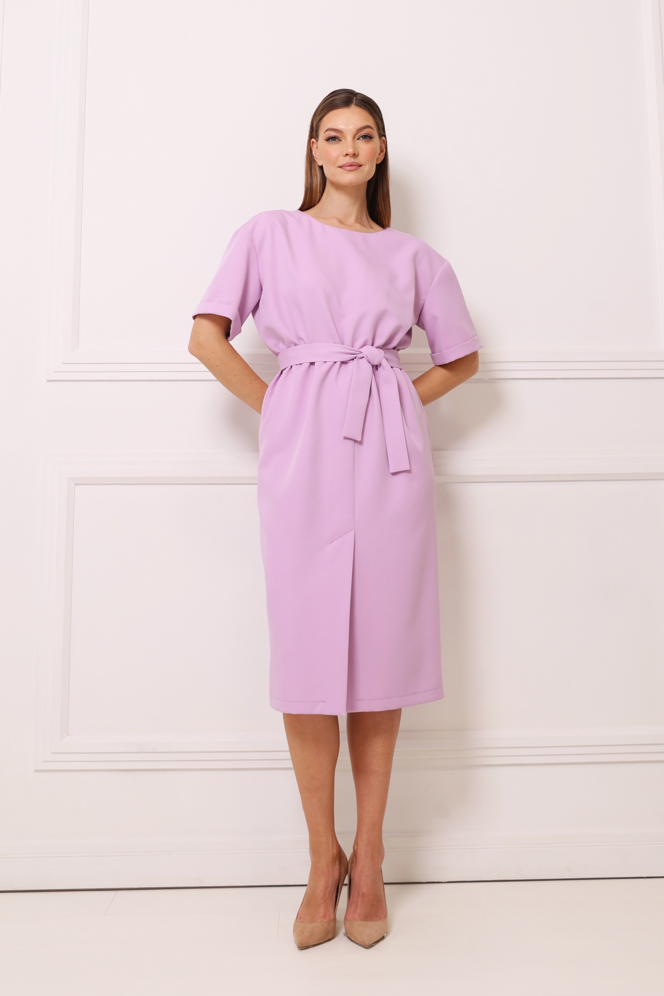 Платье с круглой горловиной, застёгивается на пуговицу сзади. Рукав с подгибом. Резинка по линии талии. Разрез по переду. Пояс в комплекте.