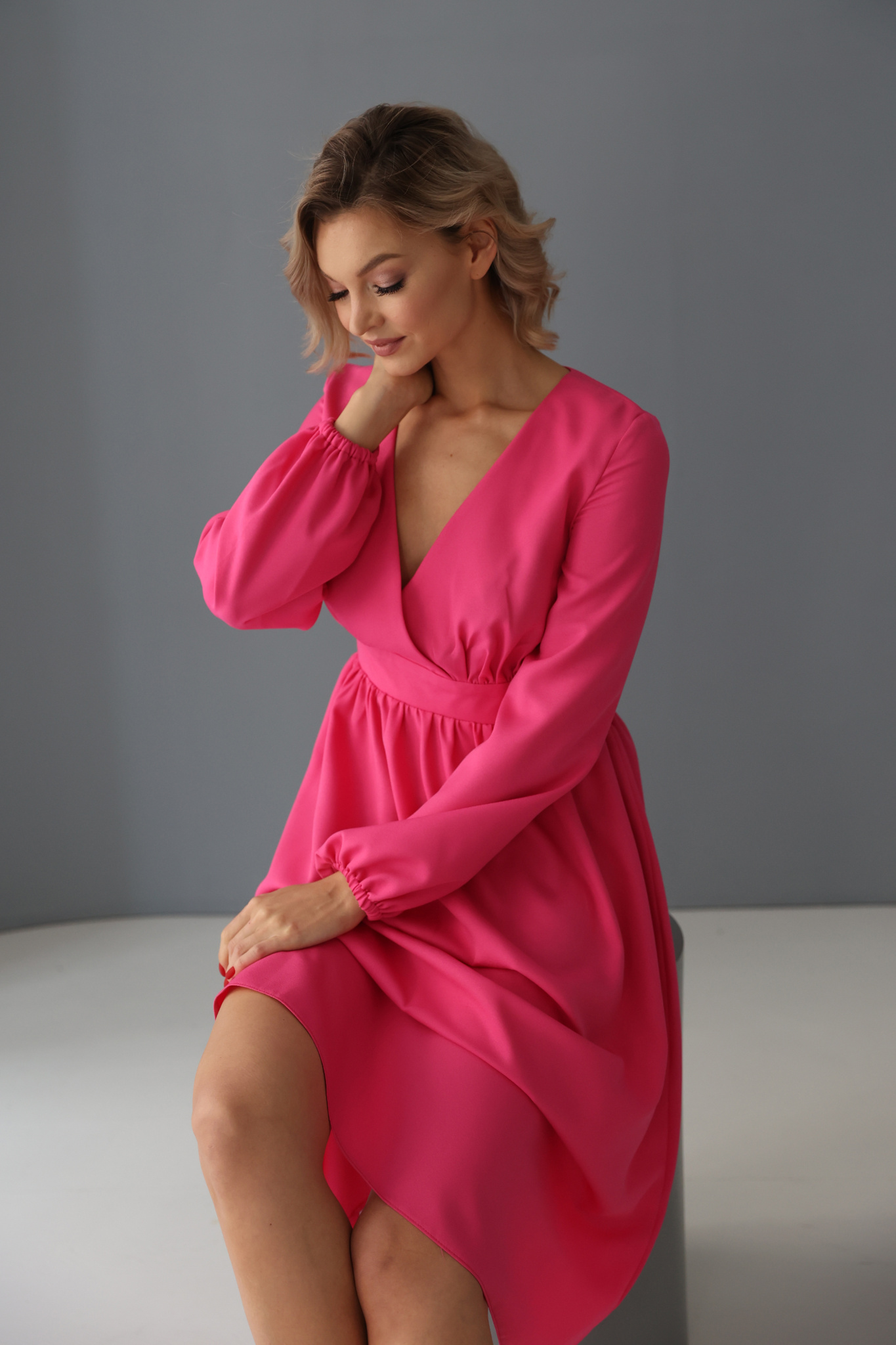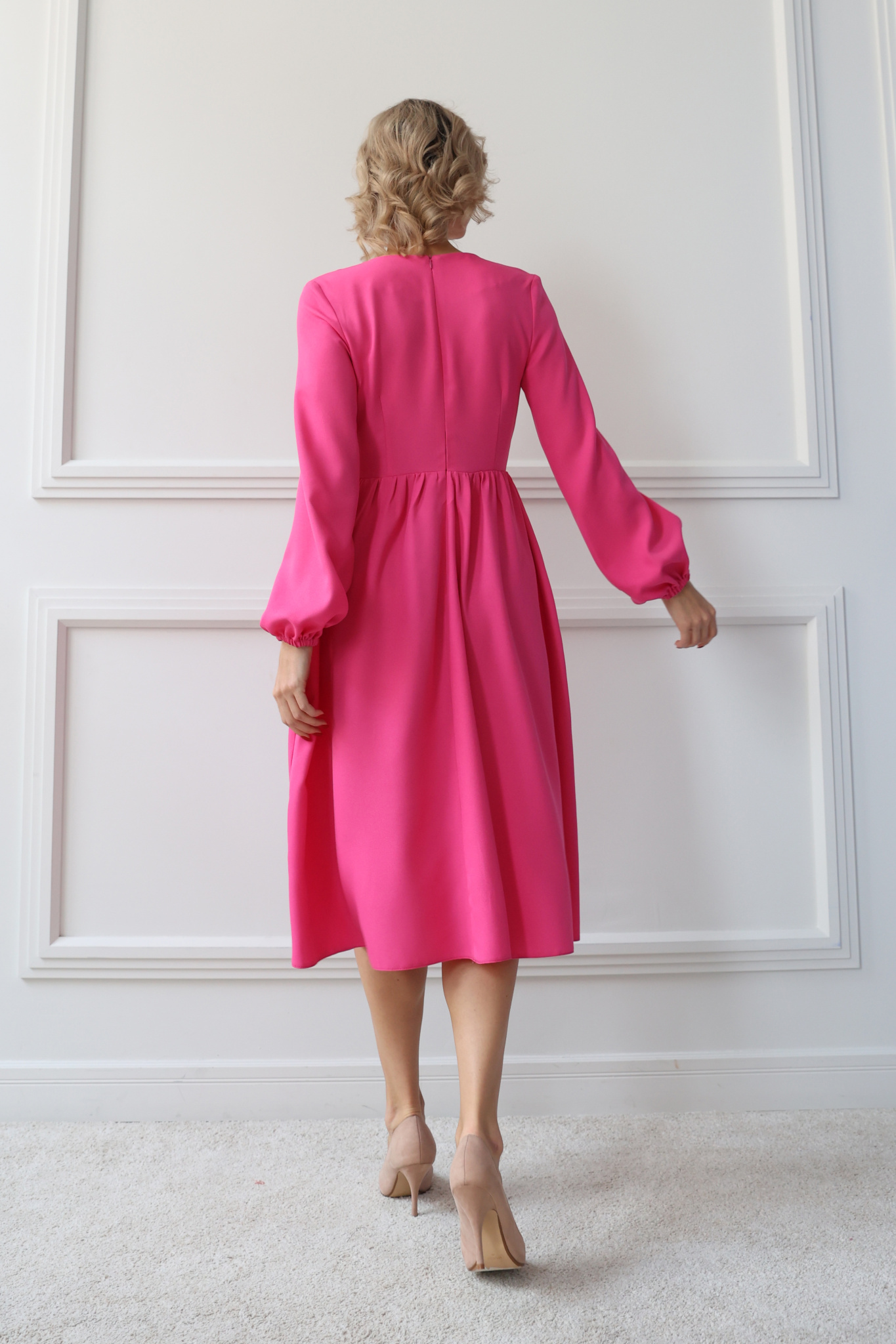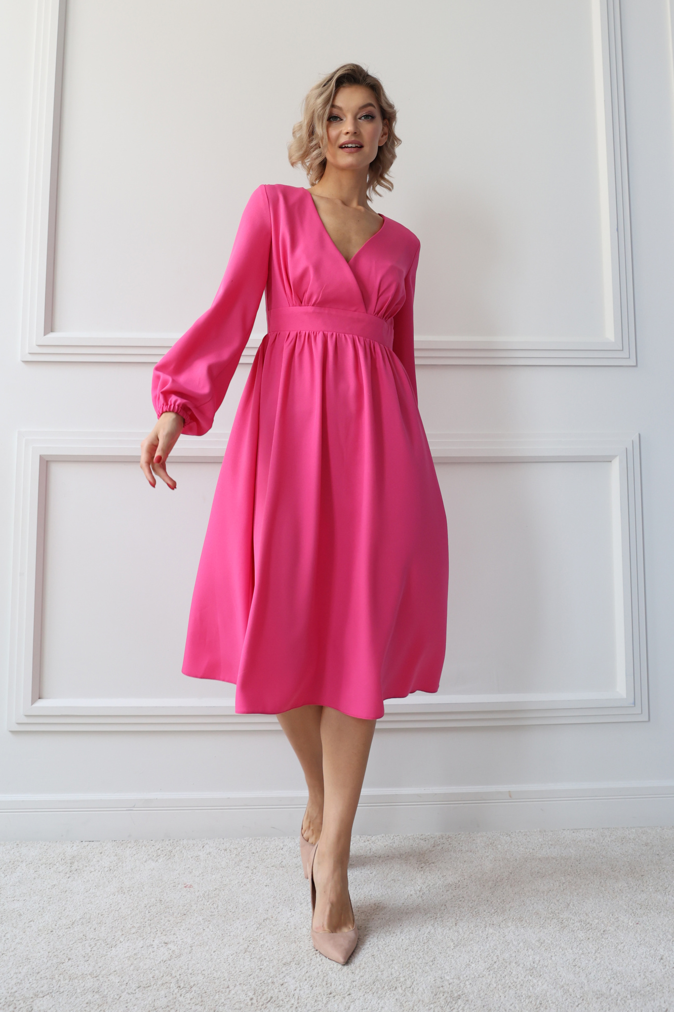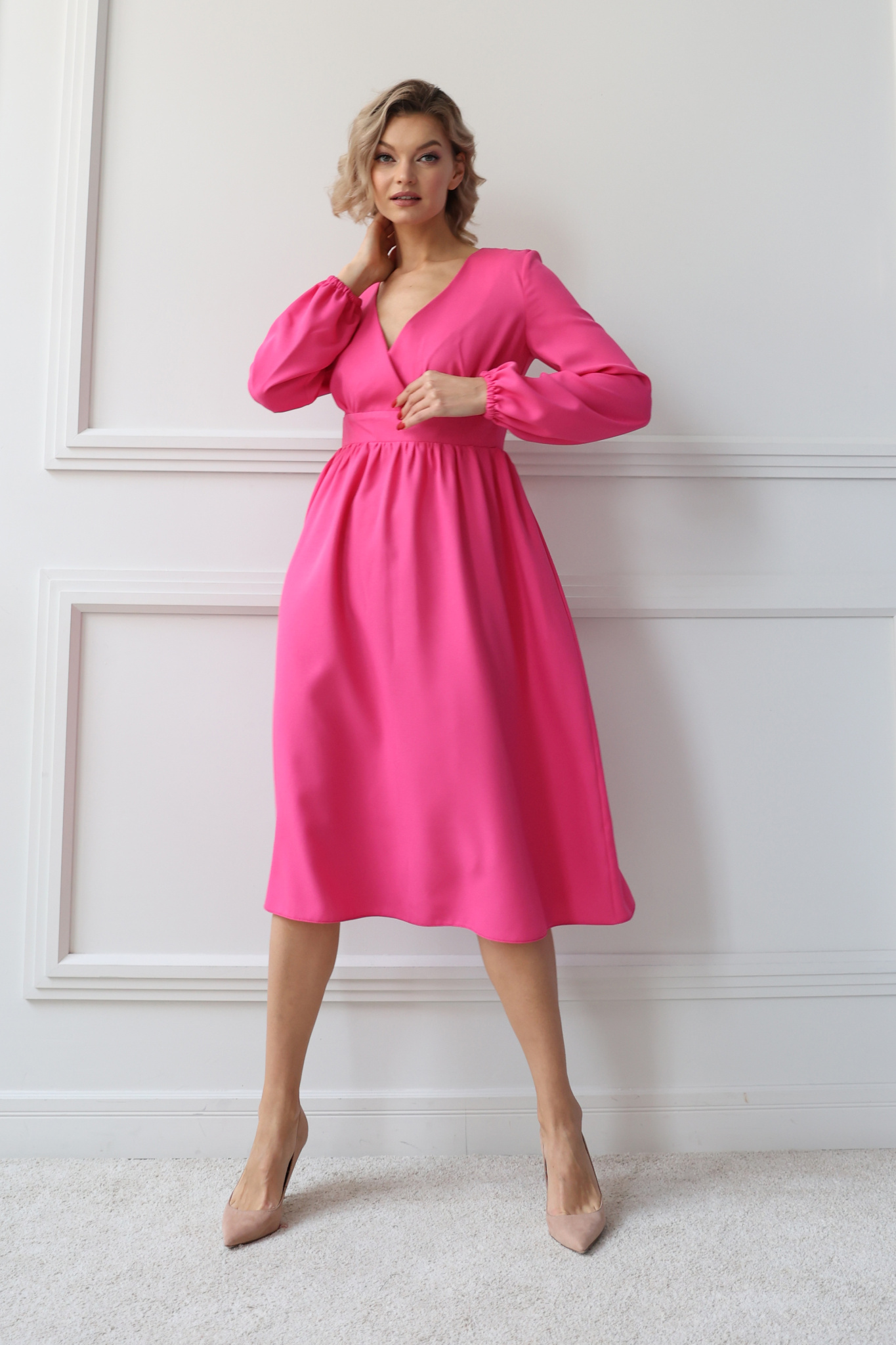 Платье миди отрезное по линии талии с лифом на запах. Пышный рукав с манжетой на резинке