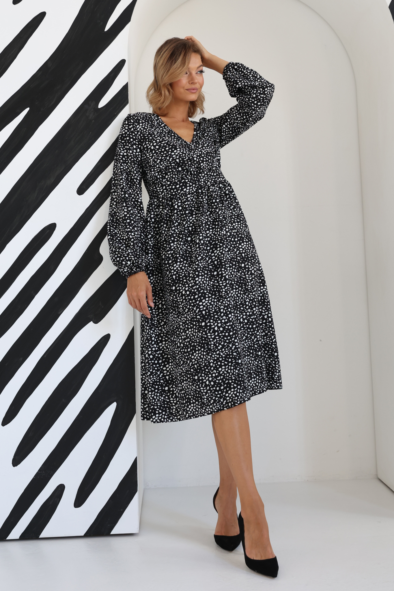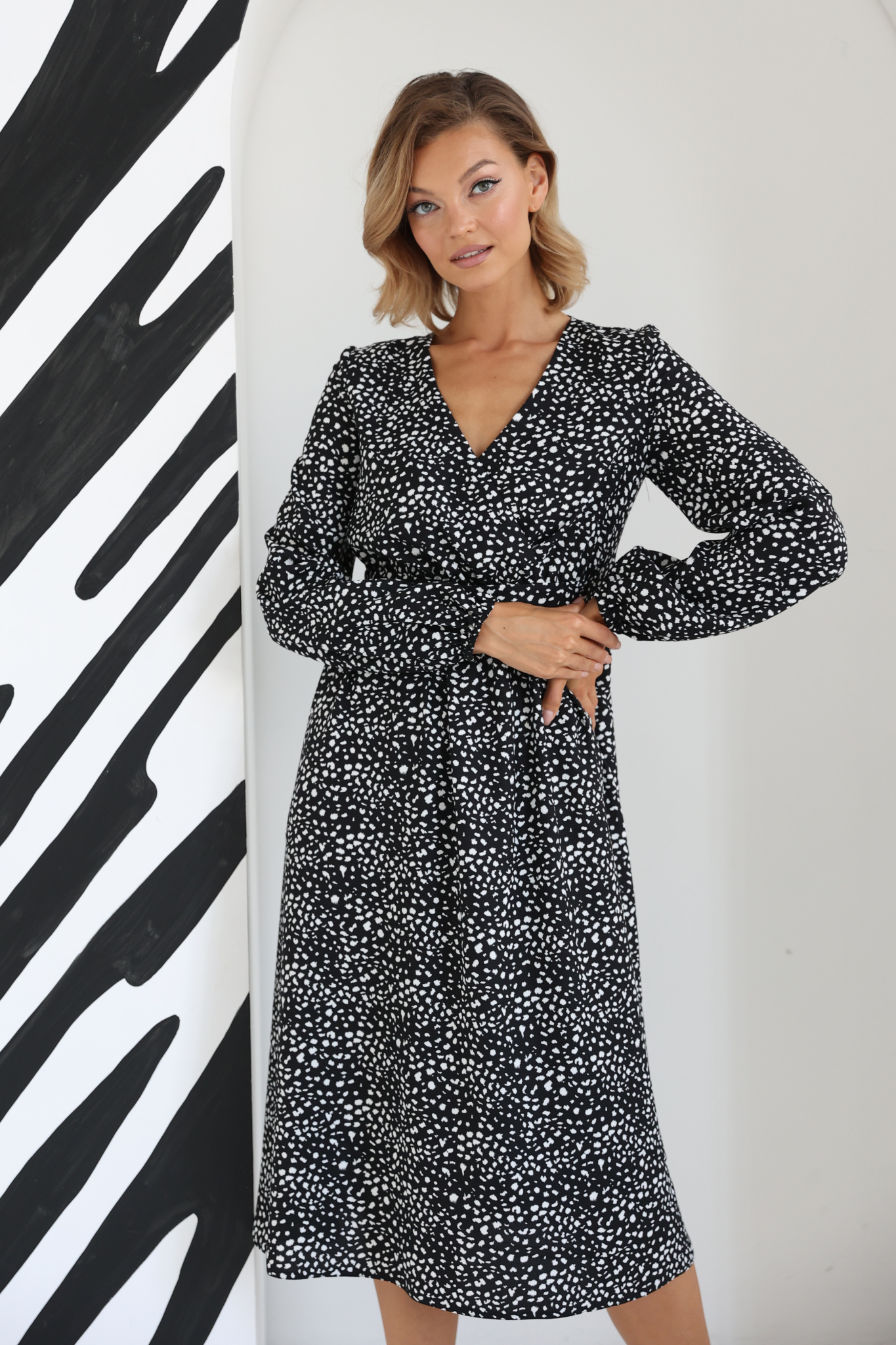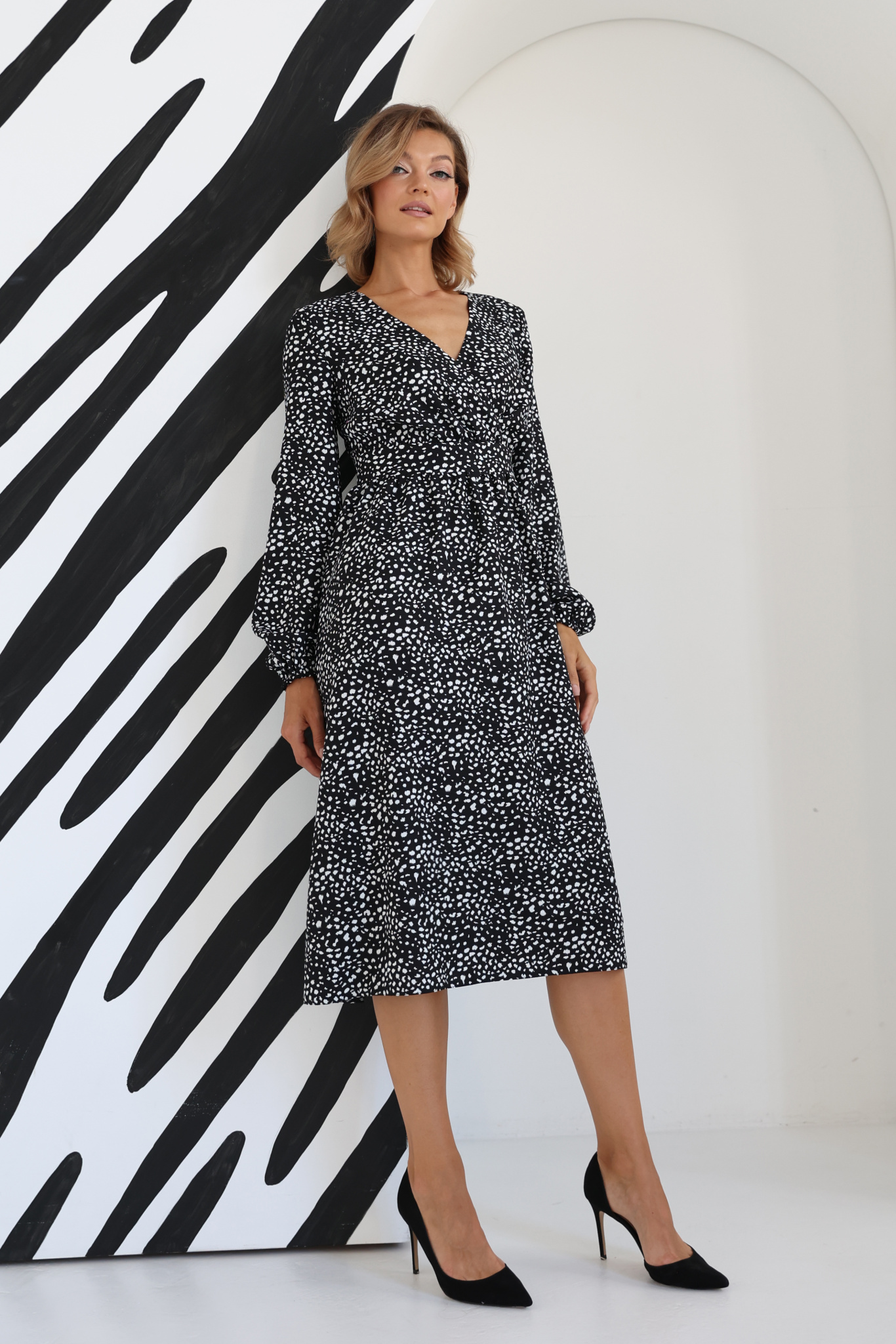 Платье миди отрезное по линии талии с лифом на запах. Пышный рукав с манжетой на резинке.