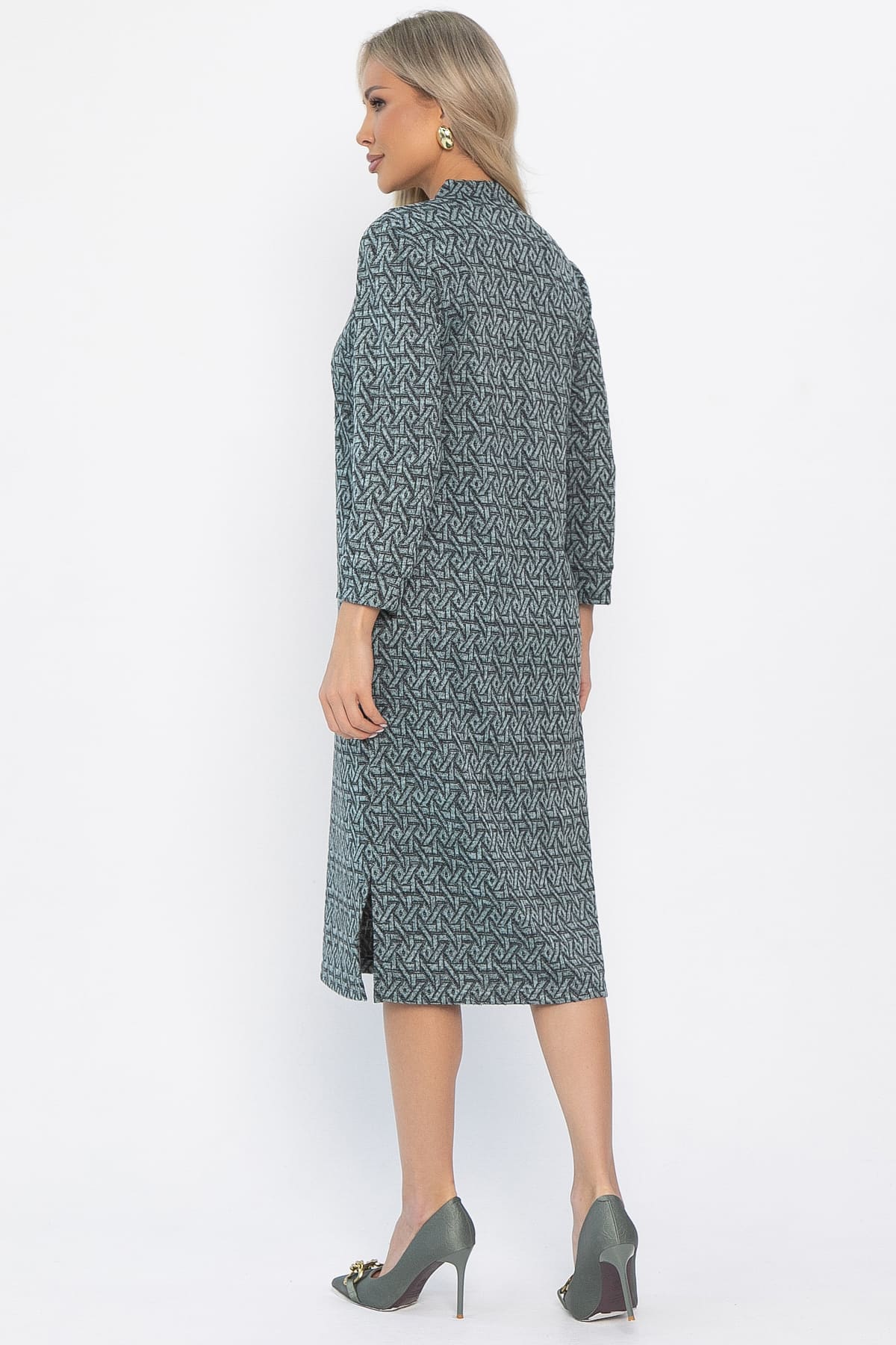 Трикотажное платье в мятном цвете с интересным принтом станет прекрасным дополнением в вашем гардеробе. Пояс из основной ткани, входящий в комплект, поможет подчеркнуть талию. Рукава длиной 3/4 оканчиваются манжетом. Создано для тех, кто ценит удобство, элегантность и индивидуальность стиля одновременно. Идеальное решение для повседневности, офиса или вечернего выхода.