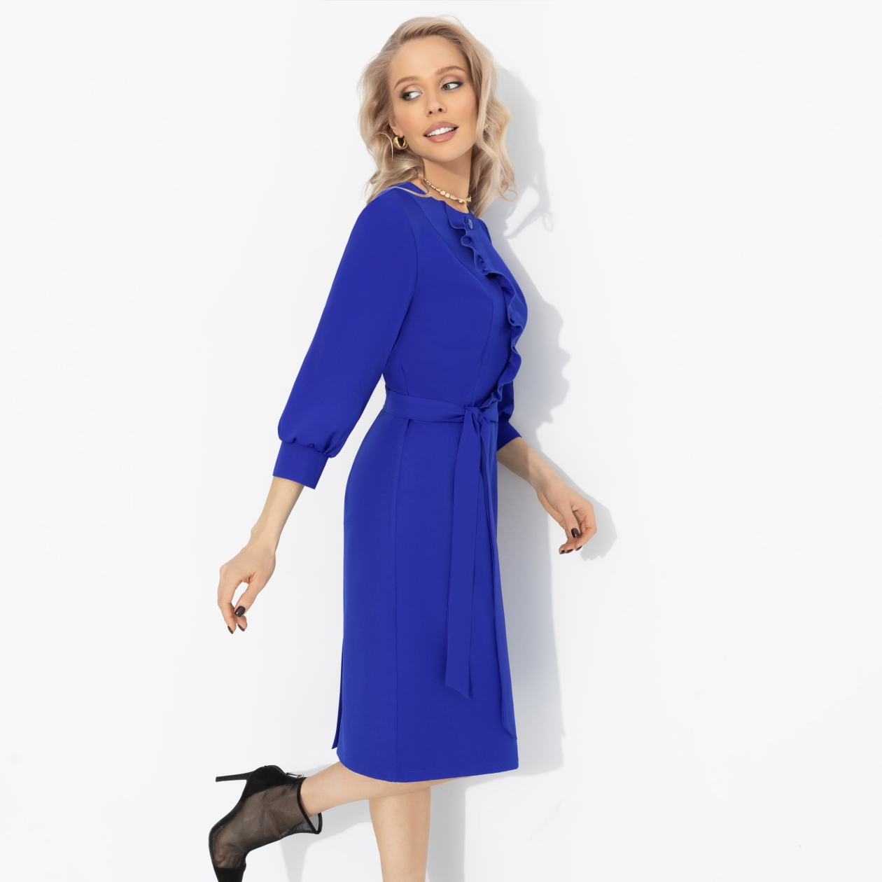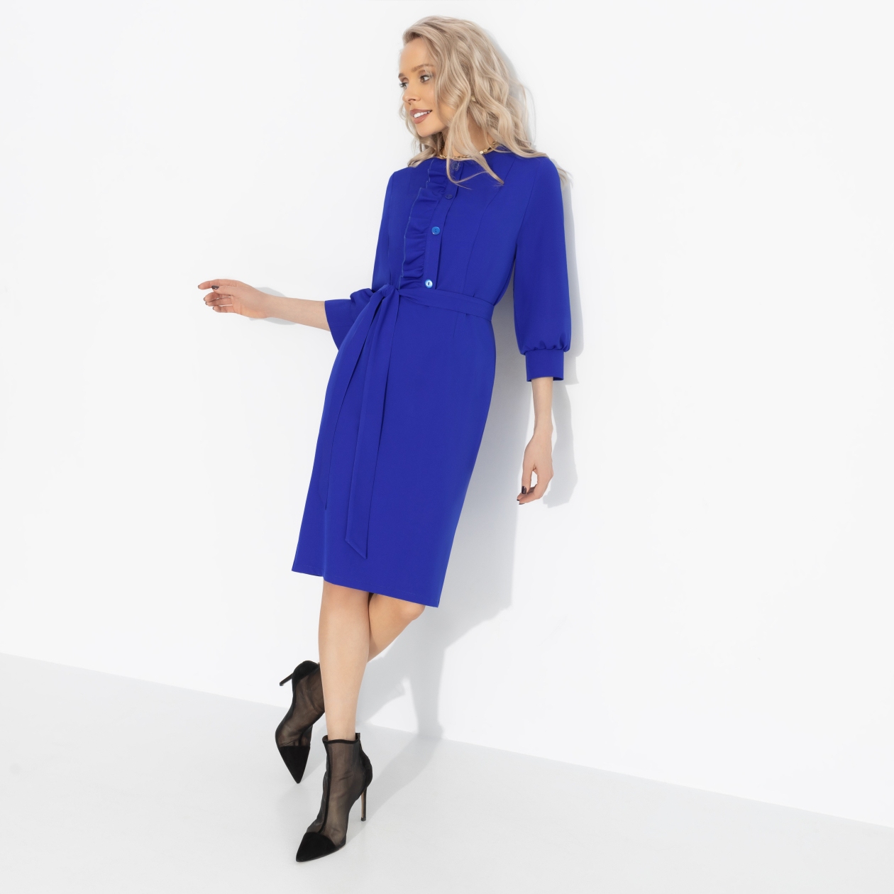 Вечер только начинается, а ты уже главный акцент в комнате. Это платье дизйанеры ЧАРУТТИ создали для яркого типажа женщин, которые не растворяются в толпе, а задают тон – как муза street-style фотографов. Всего пара жестов: завязать пояс, надеть любимые лодочки, добавить помаду – и момент превращается в событие, о котором будут вспоминать. Полуприлегающий силуэт платья со съемным поясом подчеркивает талию и визуально стройнит. Рукав 3/4 на мягкой манжете, застежка на декоративные пуговицы. Вертикальная рюша по центру вытягивает силуэт. Насыщенный синий в гамме electric blue выгодно оттеняет кожу, особенно ярким контрастным типажам.