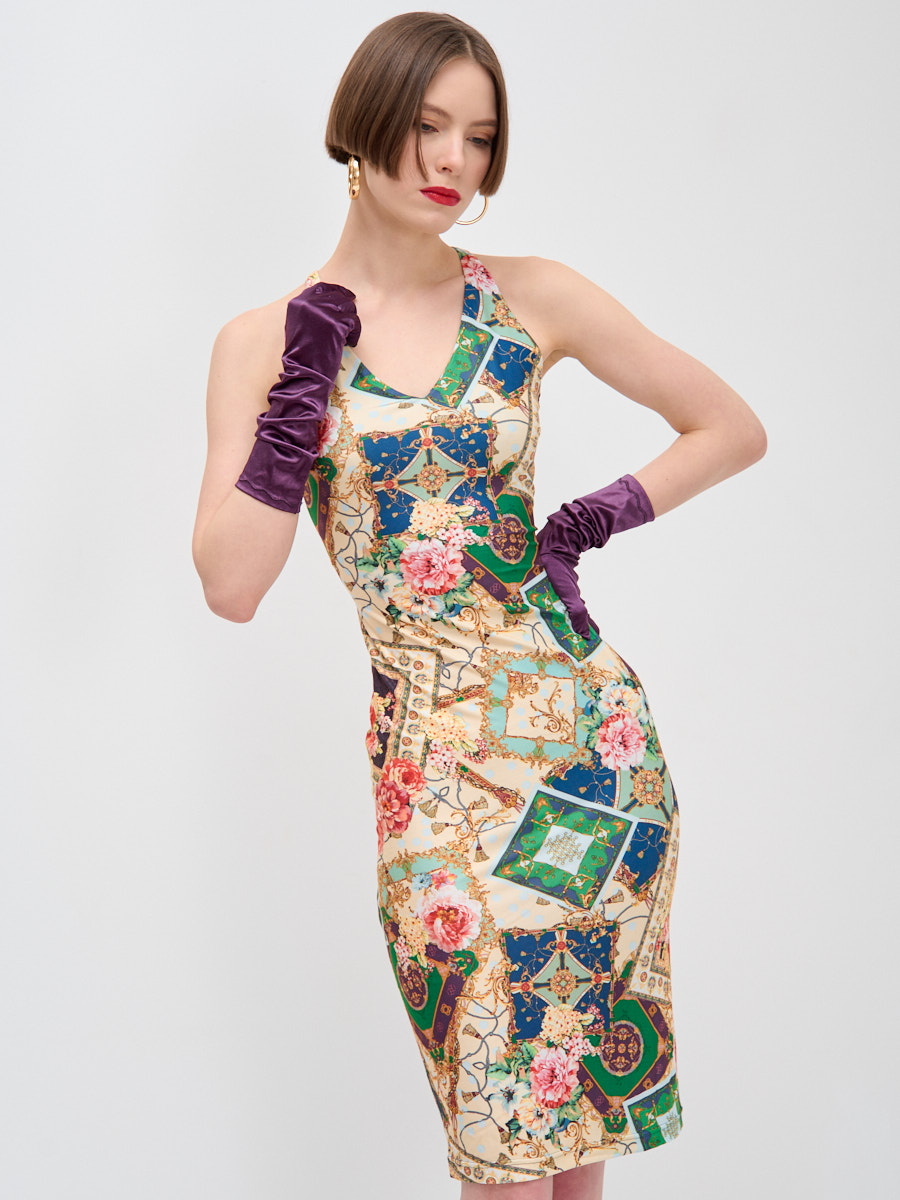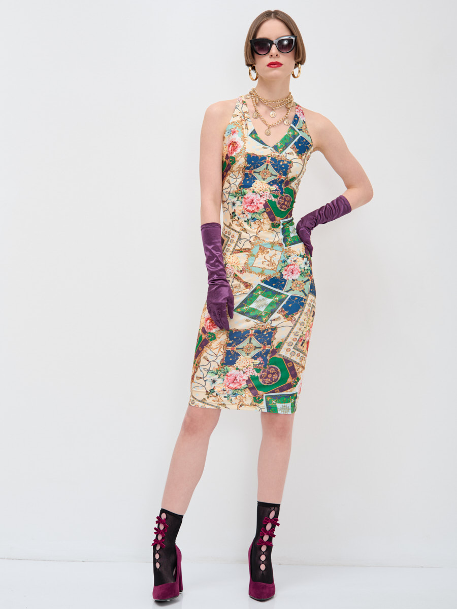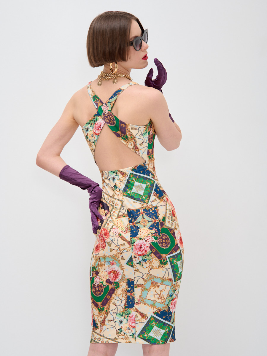 Платье из трикотажной ткани масло прилегающего силуэта. Спина открыта, на широких бретелях. По спинке на линии талии резинка для лучшего прилегания. Ткань мягкая, легкая и очень приятная к телу. Рост модели 175 см. Изделие на модели 42р-ра. Длина изделия 112.5 см. Машинная стирка при 30