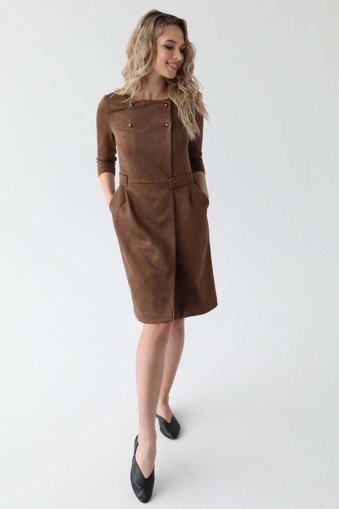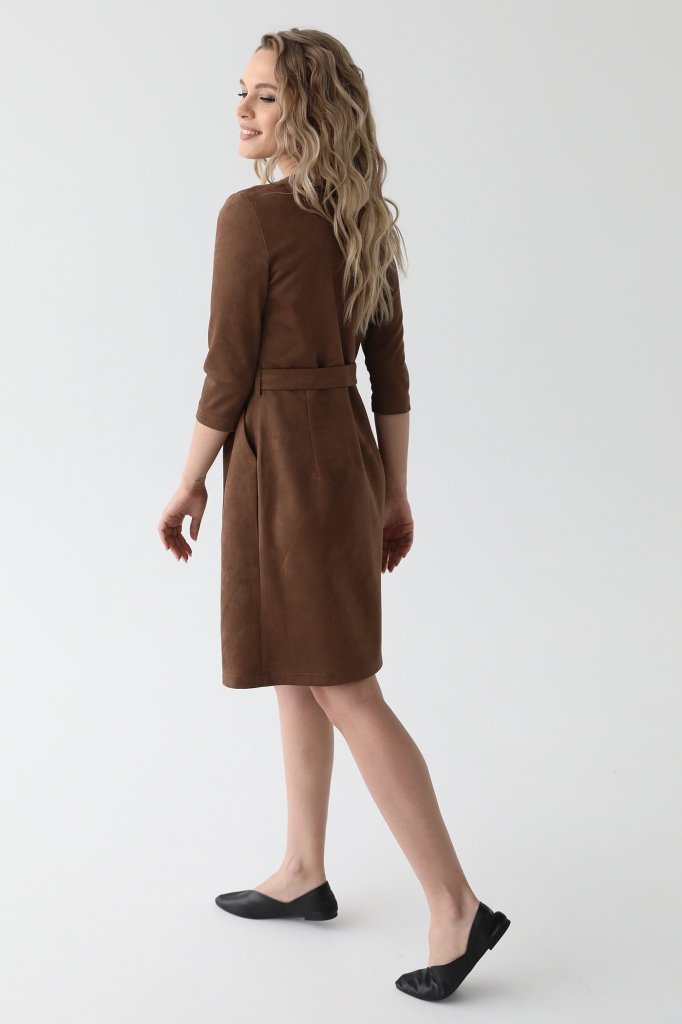Платье с пуговицами на запах, отрезное по линии талии, вытачки на поясе по спинке, карманы в боковых швах, притачной пояс с кнопкой, рукава три четверти.