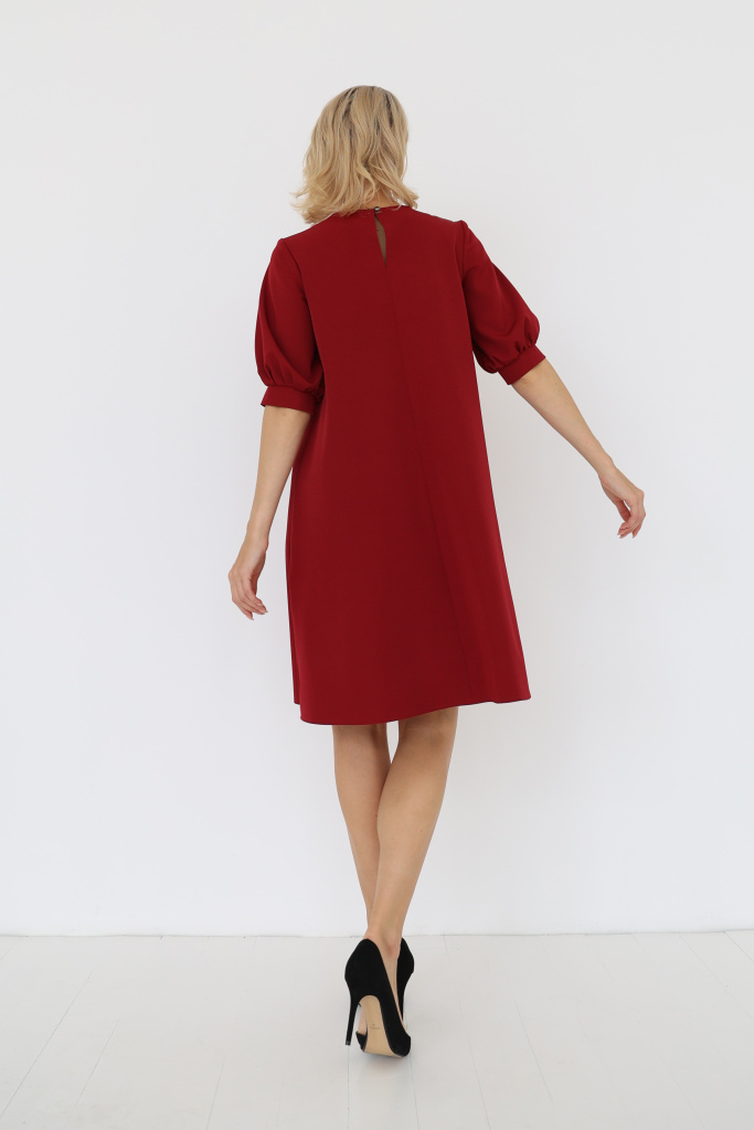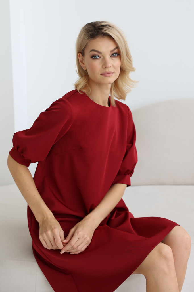 Платье широкого кроя с круглой горловиной, короткими рукавами-фонариками и вырезом-капелькой с застежкой на пуговицу на спинке изделия.
